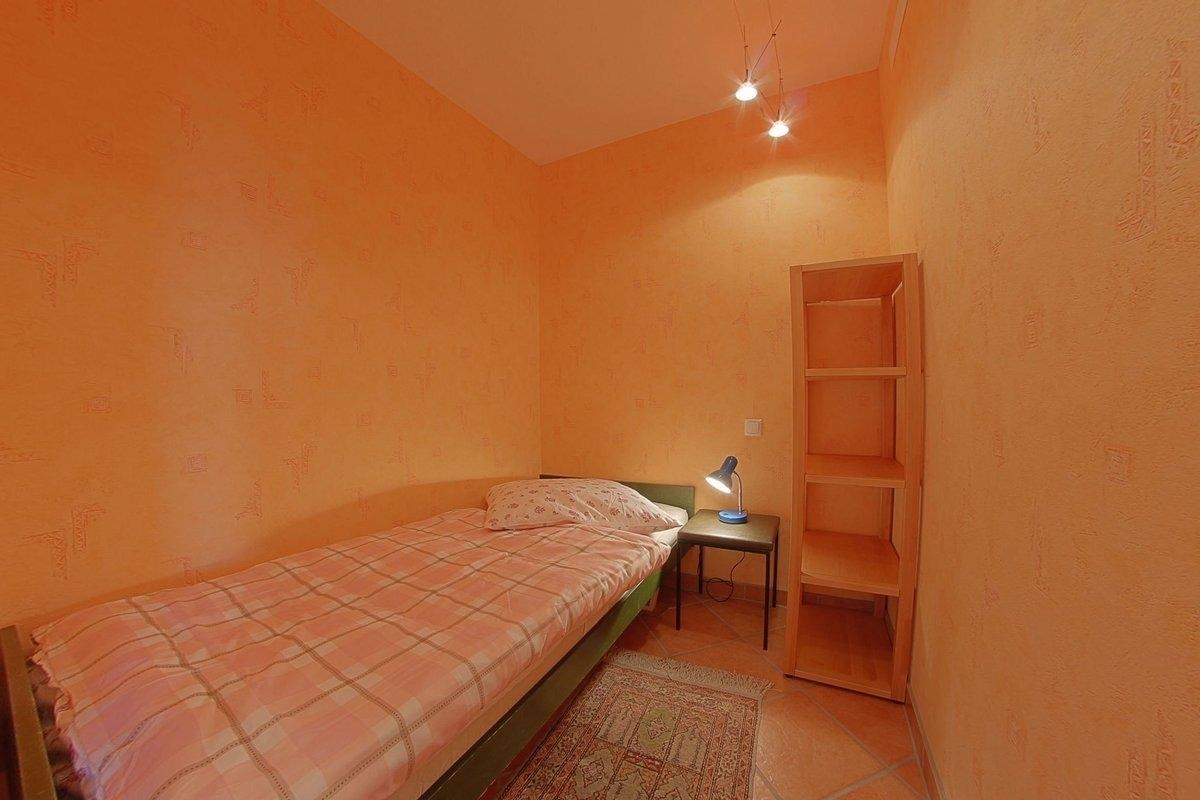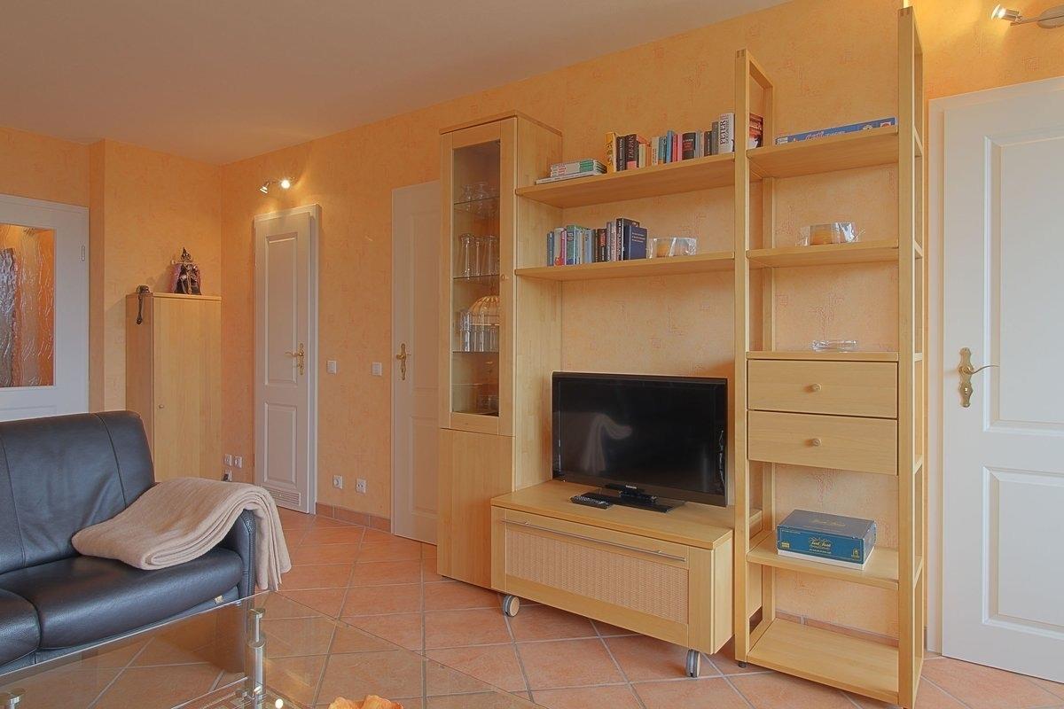 Komfortabel ausgestattete, Nichtraucher- Ferienwohnung mit einem Schlafraum mit Doppelbett (1,60 x 2,00 m) und Einzelbett[nbsp]für ein[nbsp]Kind oder einen dritten Erwachsenen (0,90 x 1,90 m) im zweiten Schlafraum, Küchenzeile mit Essecke und Wohnraum. Der Wohn-und Schlafbereich ist mit Fliesenboden ausgestattet.