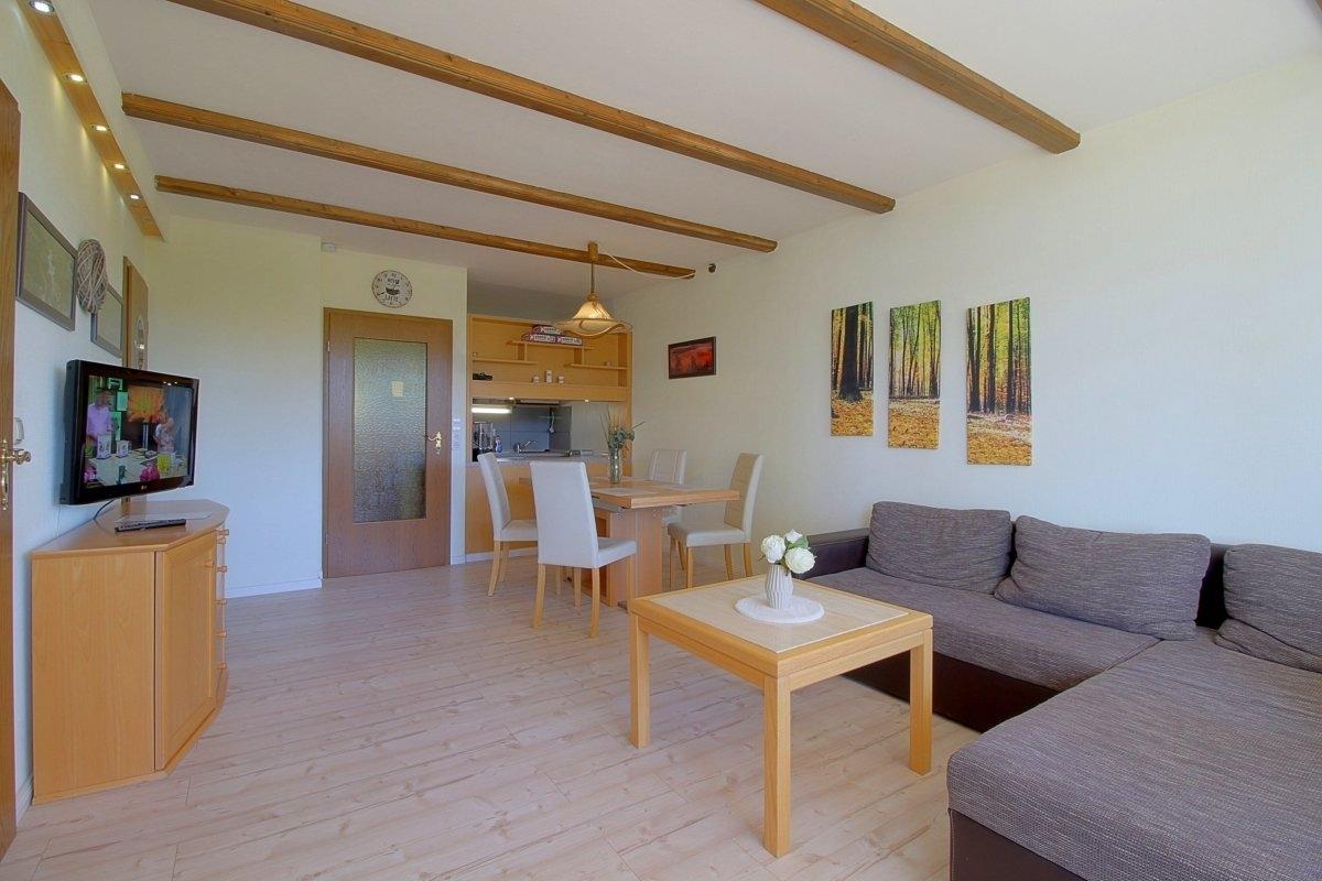 Modern eigerichtete Nichtraucher- Ferienwohnung mit einem geräumigen Schlafraum mit Doppelbett (1,60 x 2,00 m), offene Küche mit Essecke und Wohnraum und ein zweites Zimmer mit Stockbett für die Kinder.