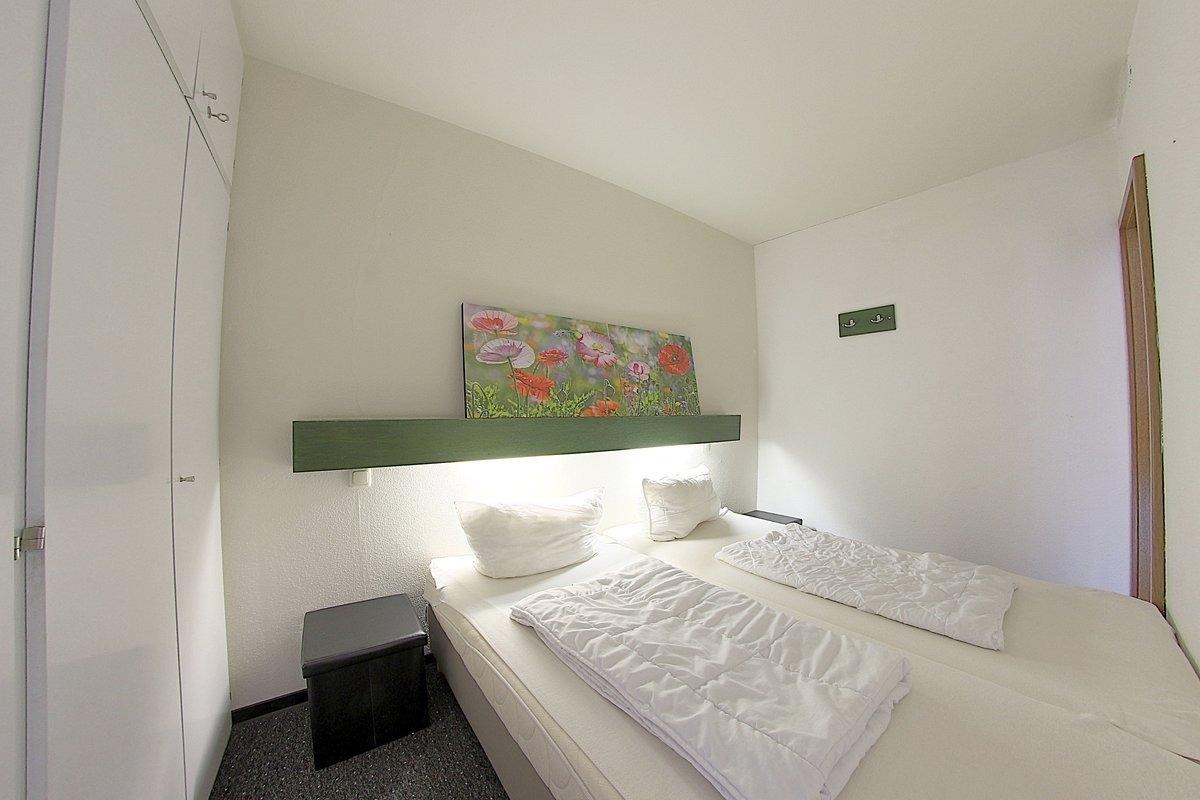 Ein Schlafraum mit Doppelbett und 1 Kinderzimmer mit Etagenbett, sowie ein Wannenbad stehen hier zur Verfügung. Teppichböden im wohn- und Schlafbereich.