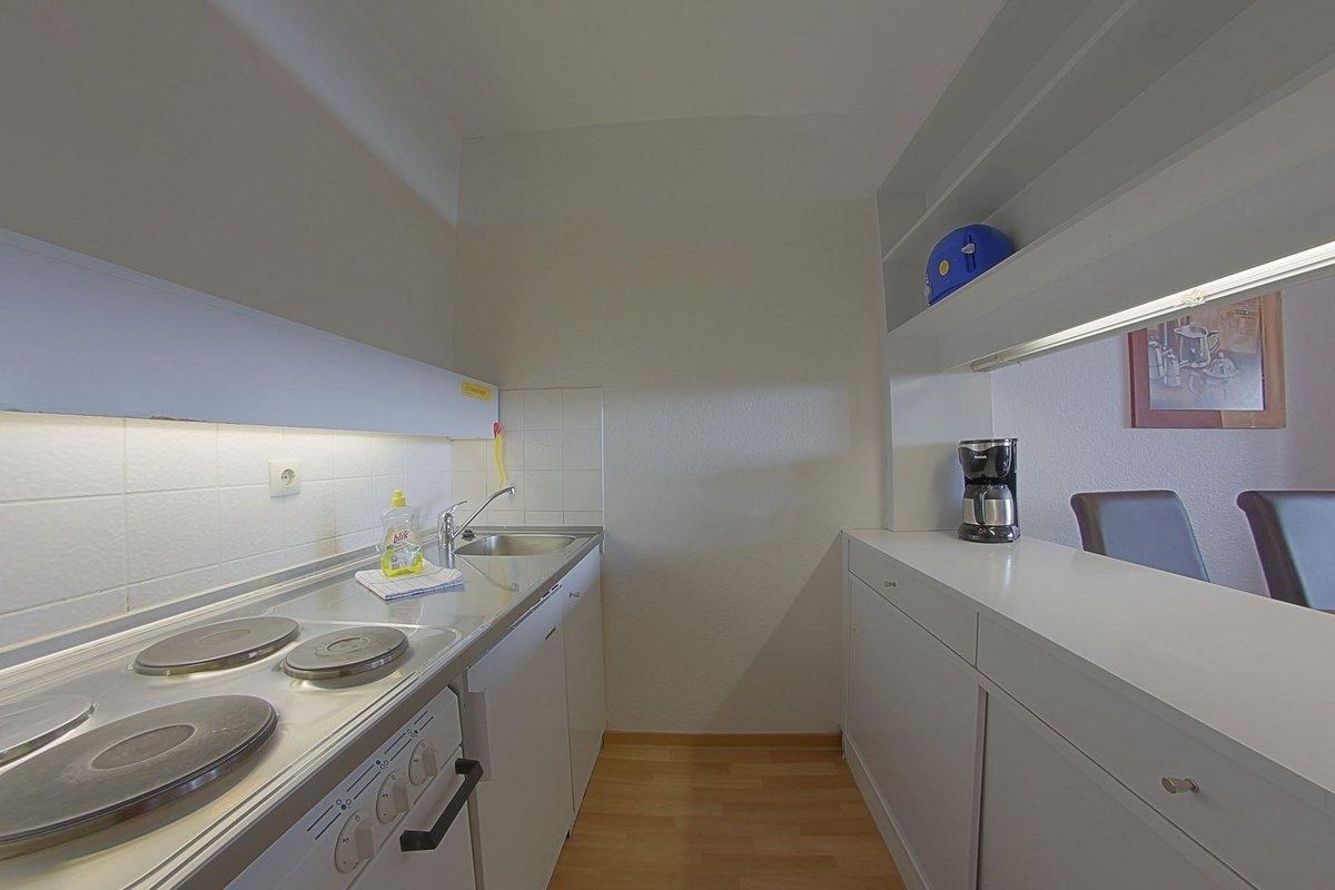 Komfortabel ausgestattete, Nichtraucher- Ferienwohnung mit einem Schlafraum mit Doppelbett (1,80 x 2,00 m) und ein Schlafsofa für die dritte Person im zweiten Schlafraum, Küchenzeile mit Essecke und Wohnraum. Der Wohn-und Schlafbereich ist mit Laminatboden ausgestattet.