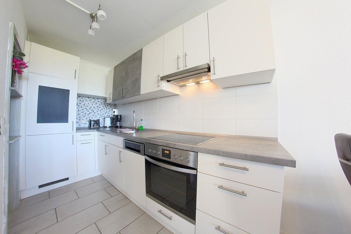 Komfortabel ausgestattete, Nichtraucher- Ferienwohnung mit einem Schlafraum mit Doppelbett (1,80 x 2,00 m) und Stockbett für die Kinder im zweiten Schlafraum, schicke Küchenzeile mit Einbauküche, Essecke und Wohnraum. Der Wohn-und Schlafbereich ist mit Fliesenboden ausgestattet. Modernisiertes Duschbad