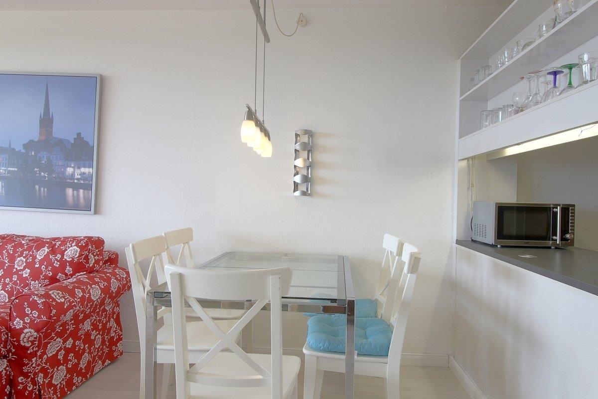 Frisch renovierte, gemütlich eingerichtete Nichtraucher- Ferienwohnung mit einem Schlafraum mit Doppelbett (1,80 x 2,00 m) und Stockbett für 2 Kinder im zweiten Schlafraum, Küchenzeile mit Essecke und Wohnraum. Der Wohn-und Schlafbereich ist mit Laminatboden ausgestattet.