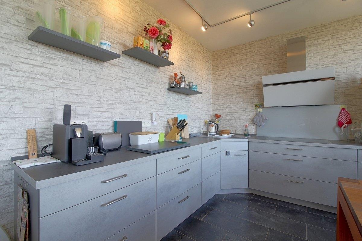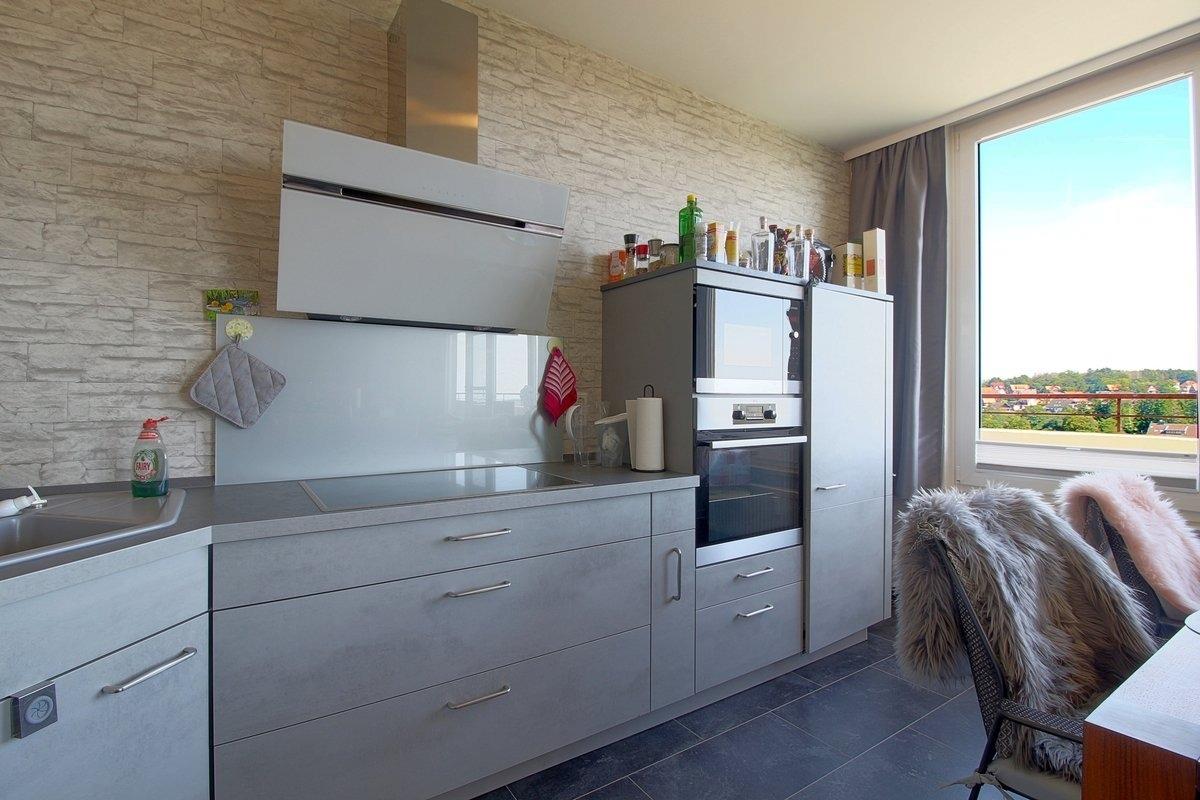 Heller, lichtdurchfluteter offener Wohnbereich mit Essplatz und hochwertiger Einbauküche mit Geschirrspüler. Die komplette Wohnung ist mit Laminatboden ausgestattet.