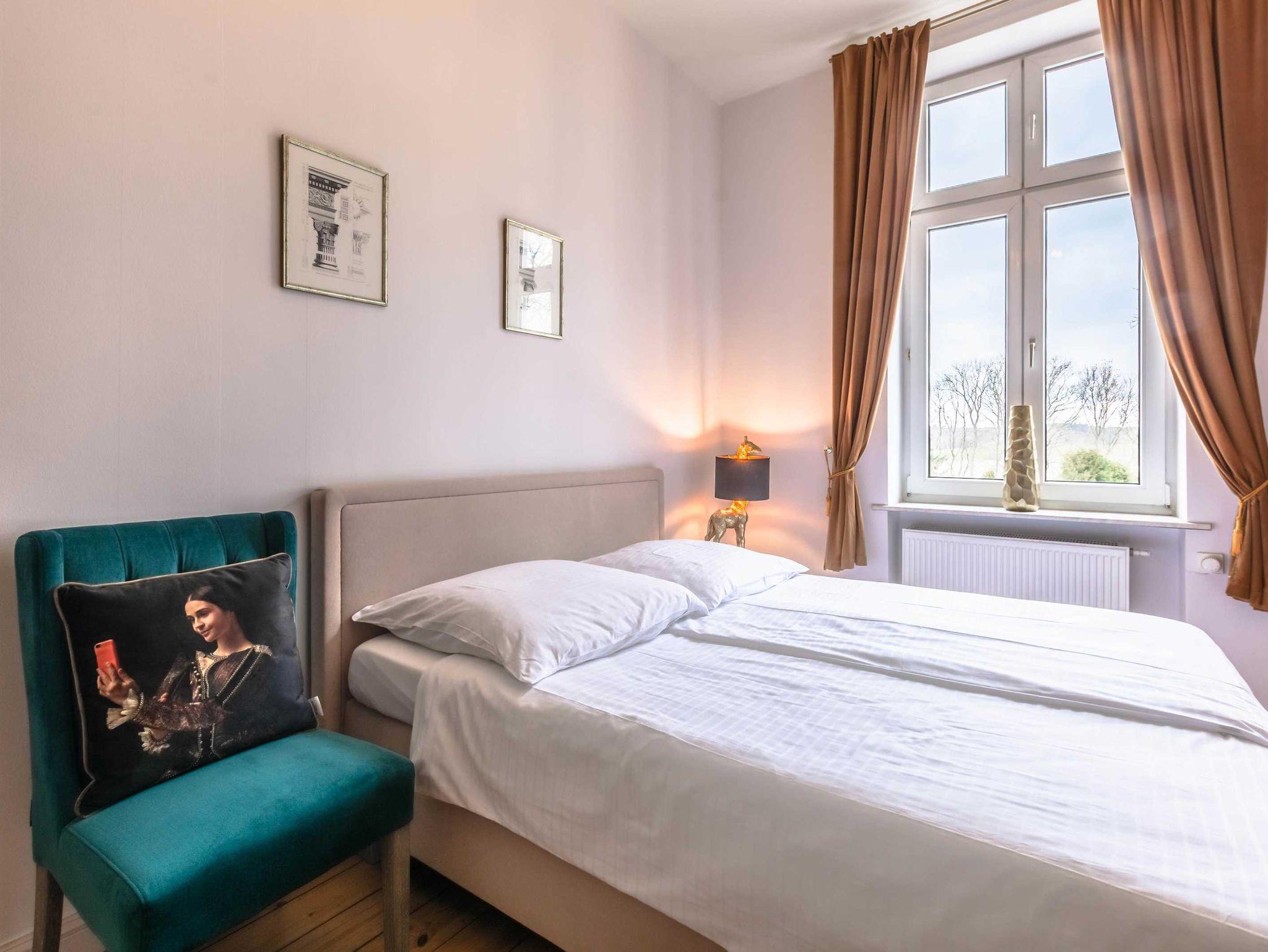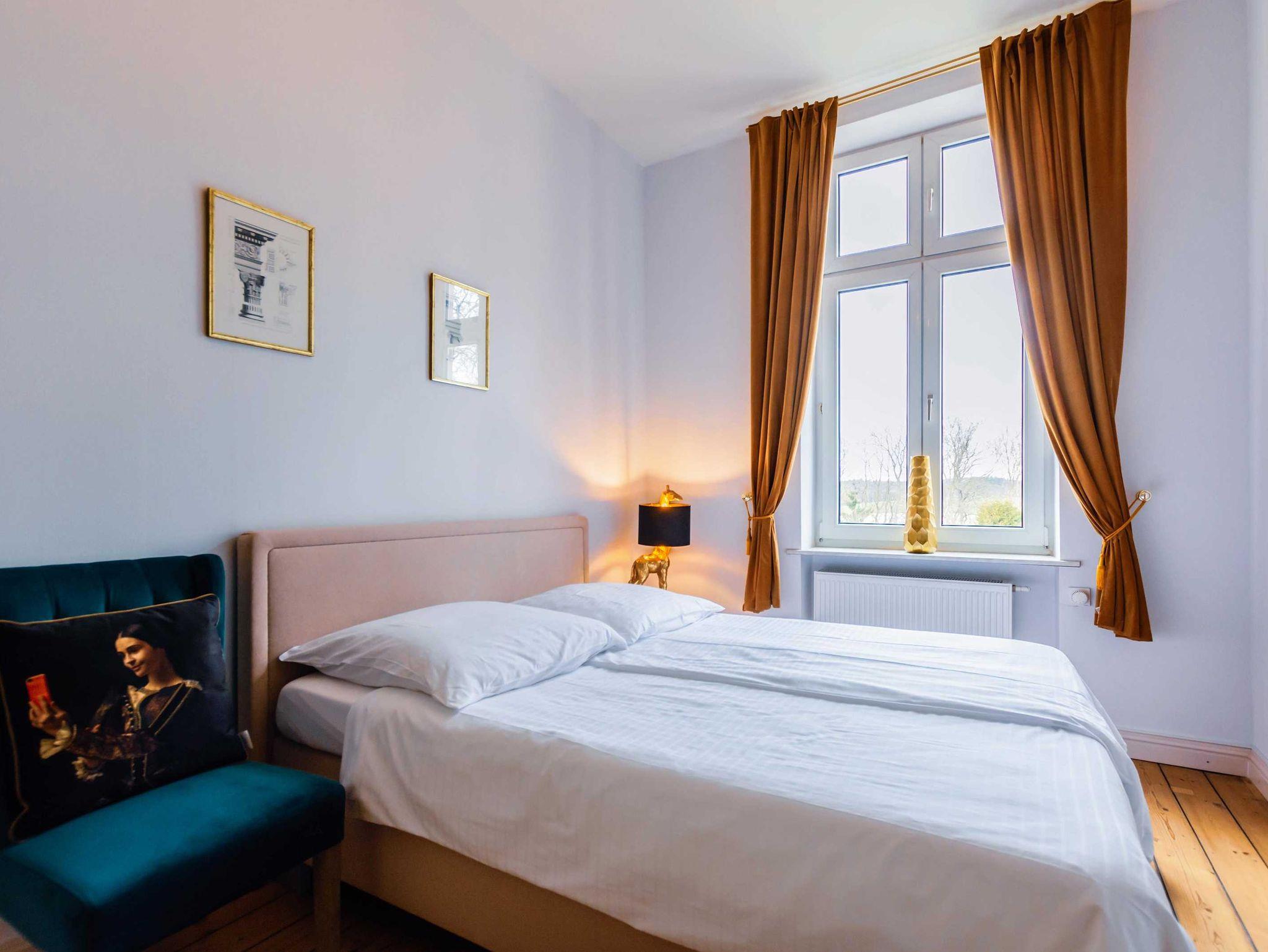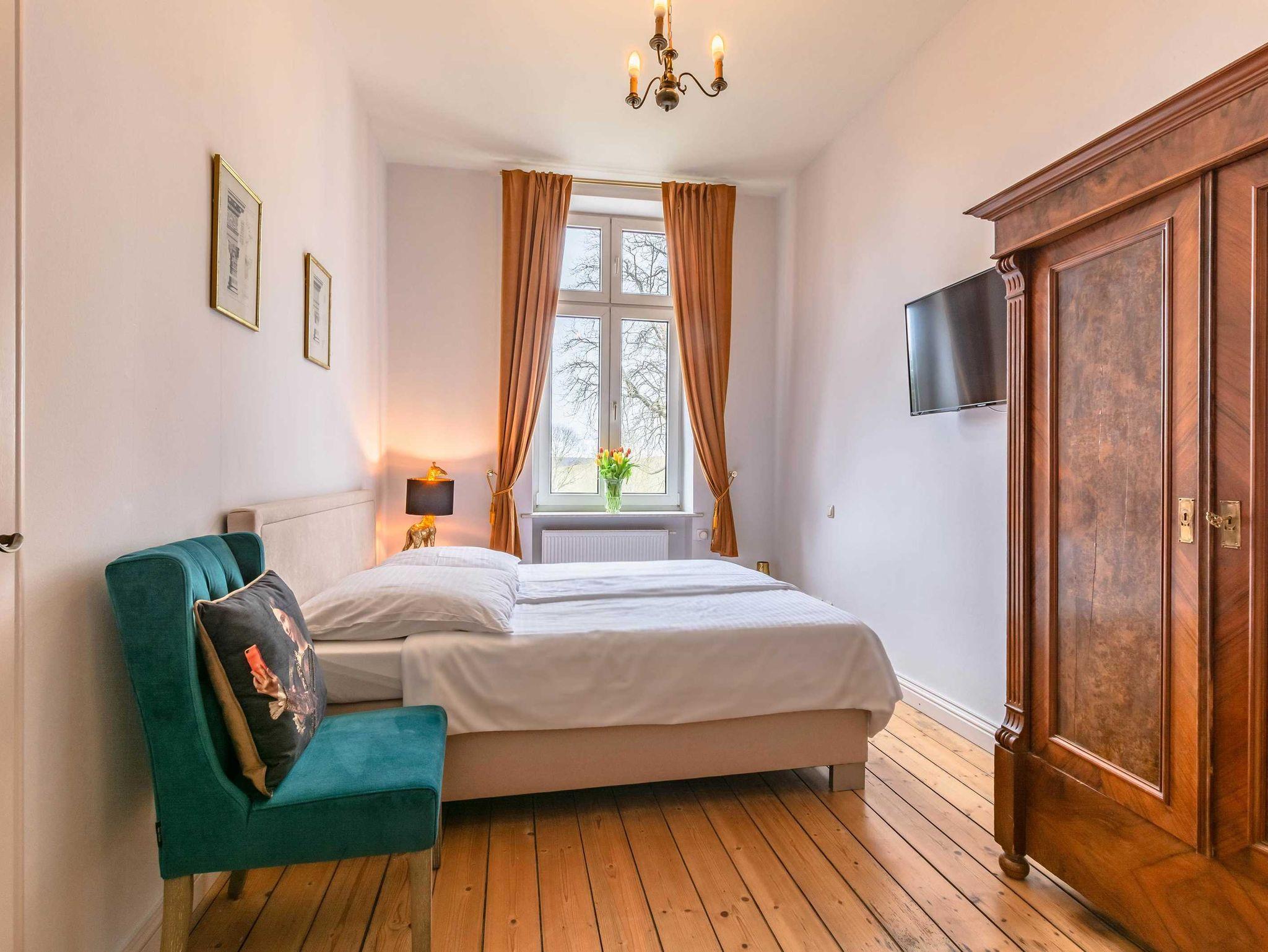 Die gemütlichen Doppelzimmer befinden sich in der ersten Etage unseres Gutsschlosses. Sie sind mit 1,40m bis 1,80m breiten Betten und einer kleinen Sitzecke ausgestattet.