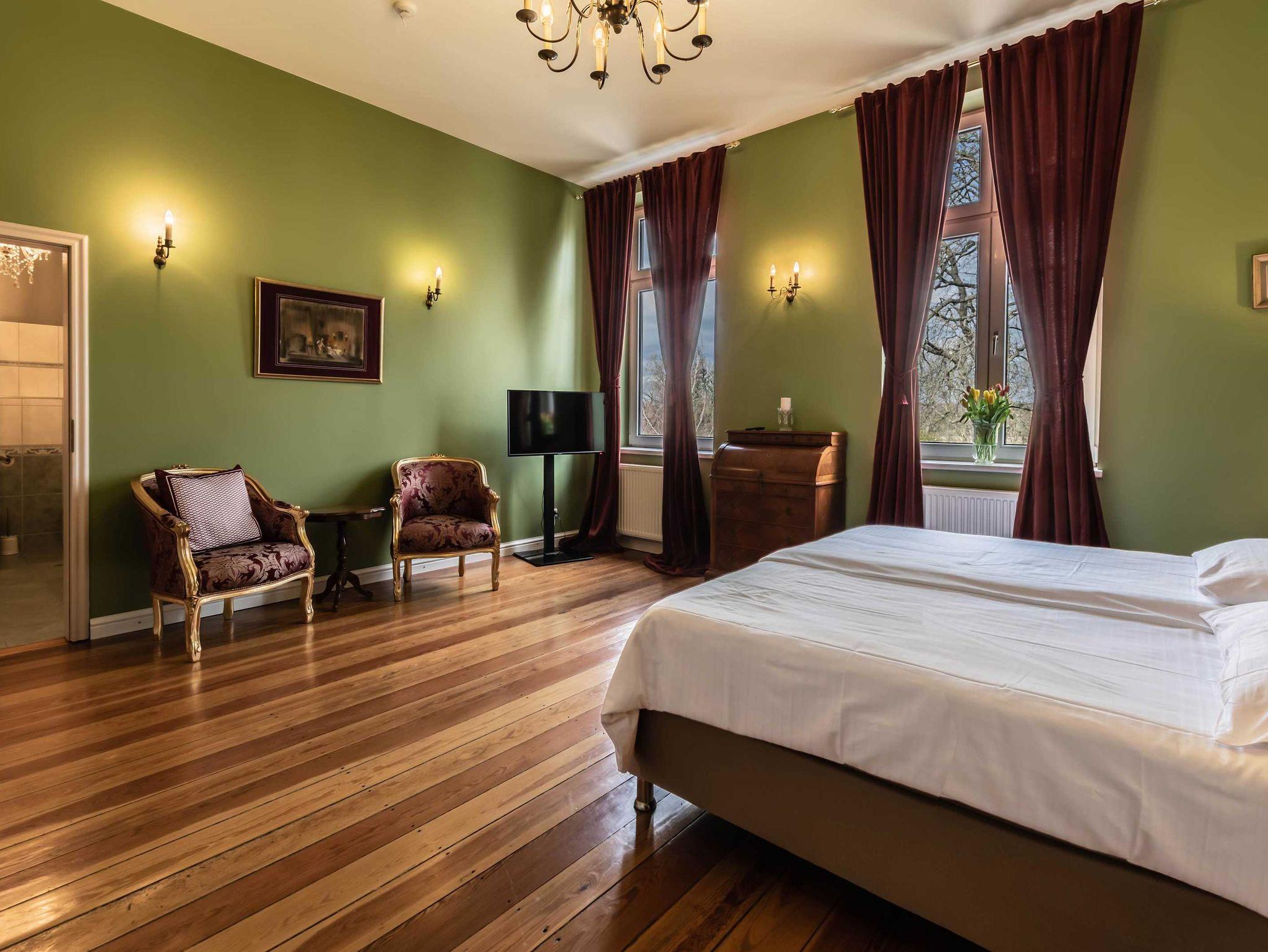 Das mit 32 qm geräumige Zimmer Mirow ist eines unserer schönsten Zimmer, es befindet sich in der ersten Etage unseres Gutsschlosses. Von hier hat man einen atemberaubenden Blick in den Park und die umliegende Landschaft, Kronenleuchter und das passende Ambiente sorgen dafür, dass Gäste sich wie auf Zeitreise fühlen.