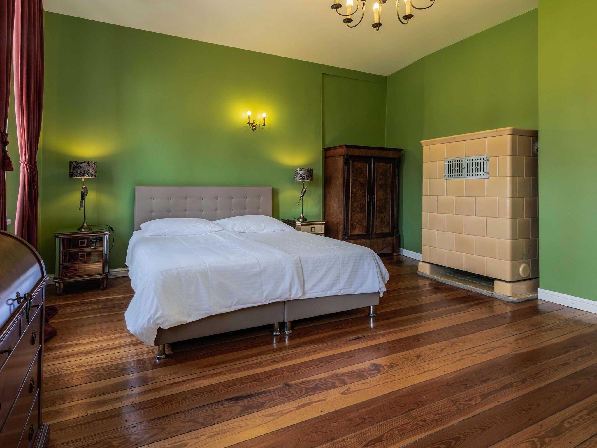 Das Zimmer Mirow ist mit einem Doppelbett und einer gemütlichen Sitzecke ausgestattet. Neben der modernen Heizung kann an kühlen Tagen ein Kachelofen mollige Wärme spenden.