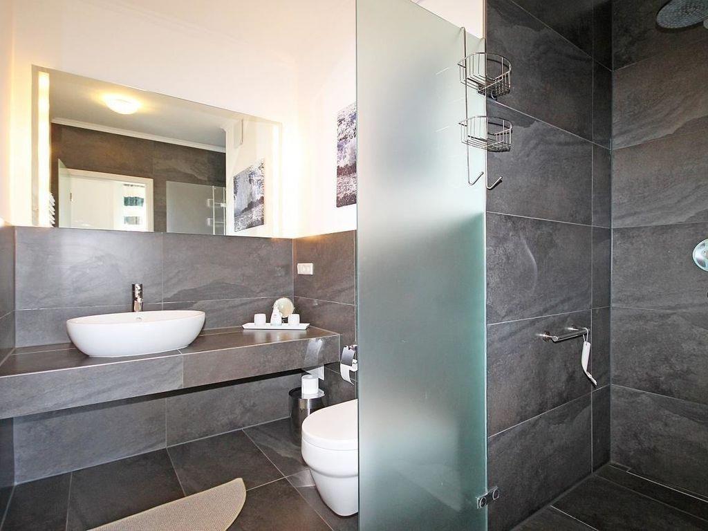 Das moderne Badezimmer verfügt über eine begehbare, ebenerdige und somit auch seniorenfreundliche Dusche, einen Waschtisch mit großem Wandspiegel, Kosmetikspiegel, WC, Handtuch-Heizkörper, Föhn sowie ausreichend Ablagemöglichkeiten.