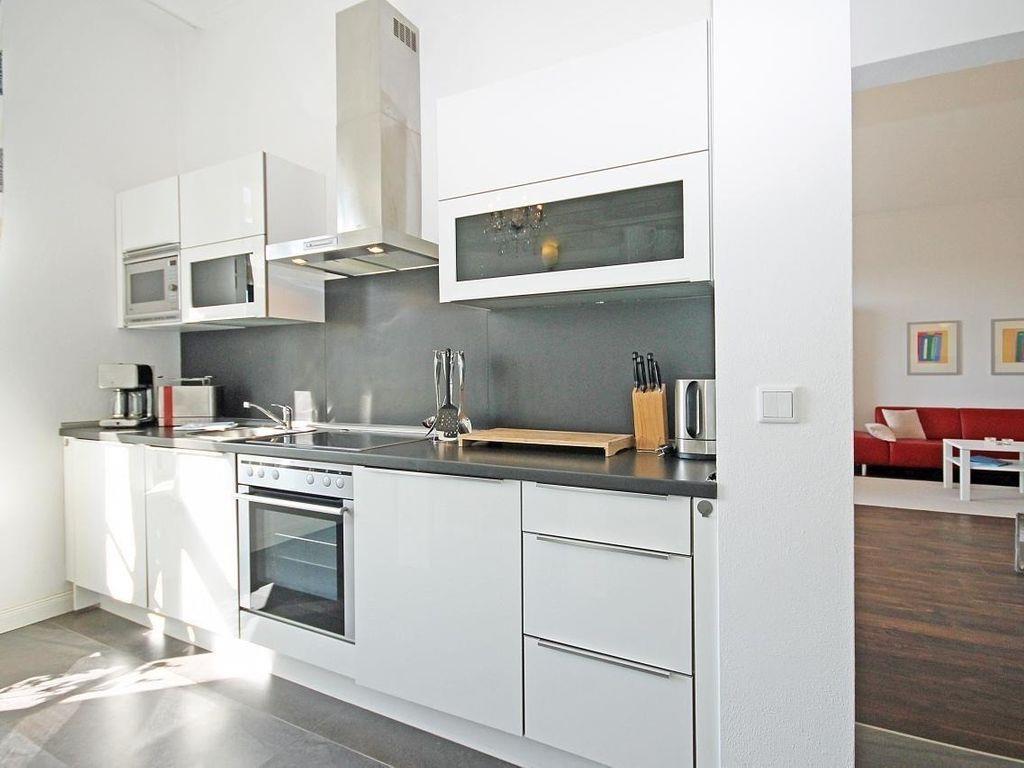 Die separate und moderne Küche beinhaltet eine voll ausgestattete Einbauküchenzeile mit 4-Zonen-Ceran-Kochfeld, Backofen, Dunstabzug, Geschirrspülmaschine, Kühlschrank mit Gefrierfach, Kaffeemaschine, Wasserkocher und Toaster. Die Küche ist mit Geschirr, Gläsern, Besteck und Töpfen bestens und vollständig ausgestattet. Hier befindet sich auch der Essbereich mit einem großen Esstisch und Stühlen.
