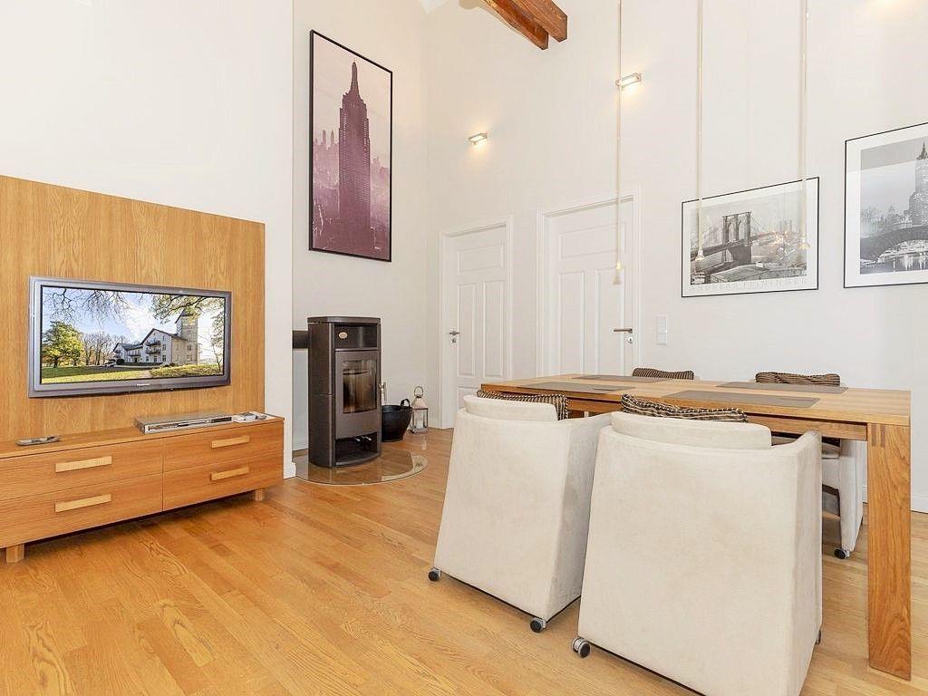 Das exklusive und großzügige Wohn-/Esszimmer mit offener Decke und Blick auf das Dachgebälk verfügt über eine separate Sitzgruppe mit bequemer Leder-Couch, Sesseln und Couchtisch, einen separaten Esstisch mit 4 Stühlen, eine Glasvitrine sowie diverse Sideboards. Die Gemütlichkeit des Wohnbereiches wird durch den vorhandenen Kaminofen abgerundet. Vom Wohnzimmer aus haben Sie direkten Zugang zu dem ca. 7 m² großen Balkon (nach Nord-Osten ausgerichtet) mit Balkonmöbeln. Hier sitzen Sie entspannt und gemütlich mit herrlichem und weitem Ausblick in die Kühlung sowie die Parkanlage und können abends bei einem guten Glas Wein in Ruhe die lauen Sommernächte genießen!