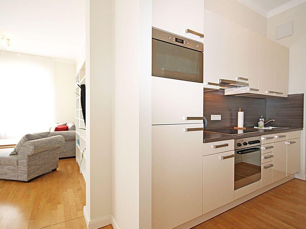 Die offene Küche beinhaltet eine voll ausgestattete Einbauküchenzeile mit 4-Zonen-Ceran-Kochfeld, Backofen, Dunstabzug, Mikrowelle, Geschirrspülmaschine, Kühlschrank mit Gefrierfach, Kaffeemaschine, Wasserkocher und Toaster. Die Küche ist mit Geschirr, Gläsern, Besteck und Töpfen bestens und vollständig ausgestattet.