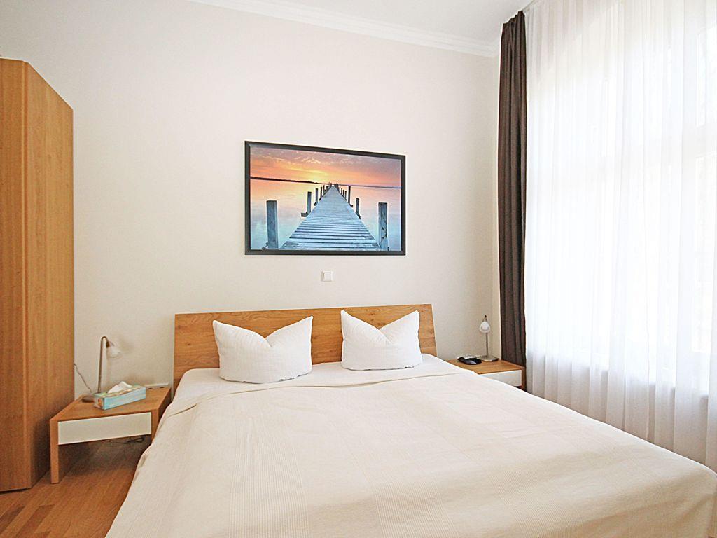 Das freundliche und behagliche Schlafzimmer ist mit einem bequemen Doppelbett, Nachttischen, einem geräumigen Kleiderschrank eingerichtet und bietet ebenfalls direkten Zugang zum Balkon. Eine zusätzliche bequeme Schlafmöglichkeit für eine weitere 3. oder 4. Person bietet die ausziehbare Schlafcouch im Wohnzimmer.