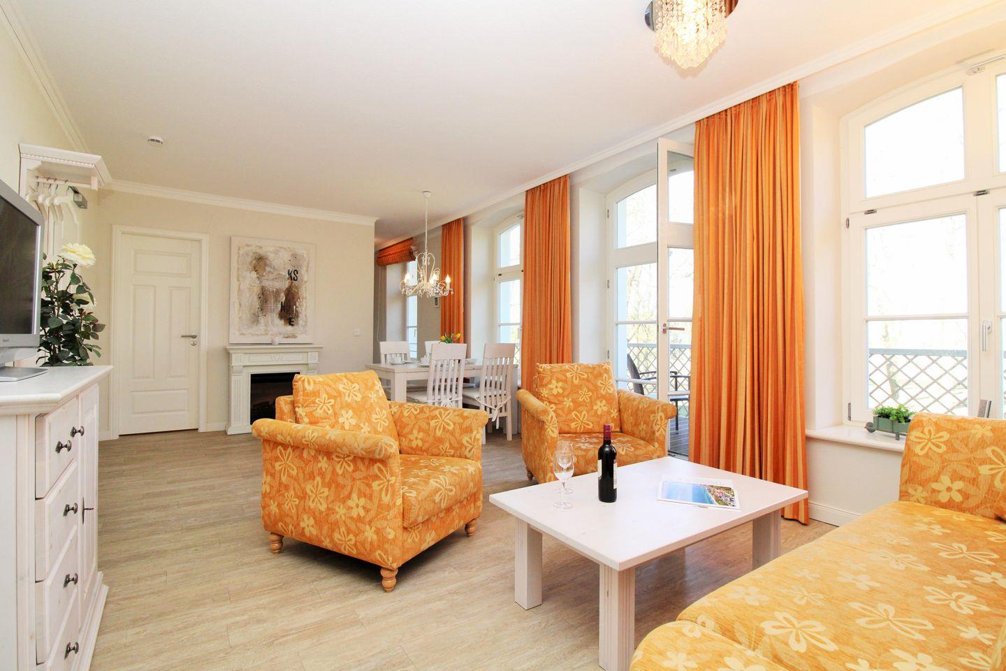 Das geräumige und gemütliche Wohn-/Esszimmer verfügt über eine separate Sitzgruppe mit bequemer (Schlaf-)Couch, 2 Sessel, Couchtisch, einen separaten Esstisch mit 4 Stühlen sowie ein Sideboard. Vom Wohnzimmer aus haben Sie direkten Zugang zu dem ca. 10 m² großen Balkon (nach Nord-Osten ausgerichtet) mit Balkonmöbeln. Hier sitzen Sie entspannt und gemütlich mit herrlichem Blick in den Schloßpark und können abends bei einem guten Glas Wein in Ruhe die lauen Sommernächte genießen!
