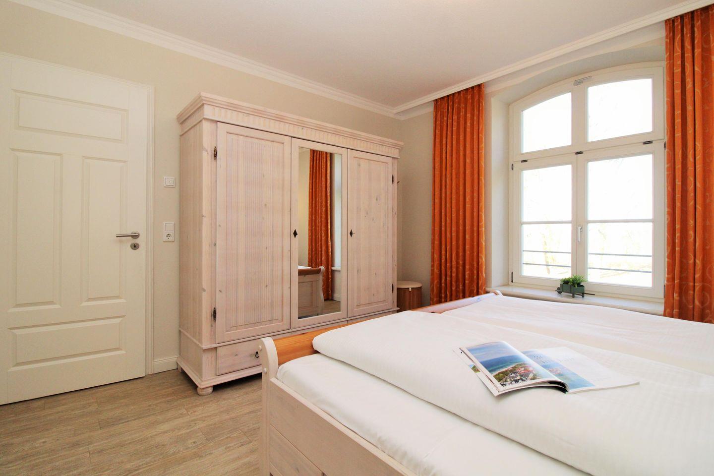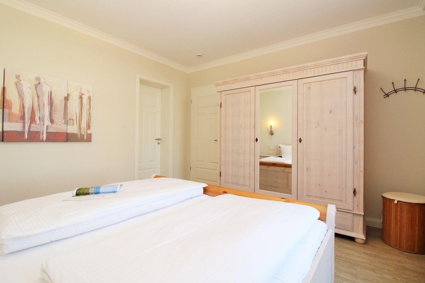 Das freundliche und behagliche Schlafzimmer ist mit einem bequemen Doppelbett, Nachttischen sowie einem geräumigen Kleiderschrank eingerichtet. Eine zusätzliche bequeme Schlafmöglichkeit für eine weitere 3. oder 4. Person bietet die ausziehbare Schlafcouch im Wohnzimmer.