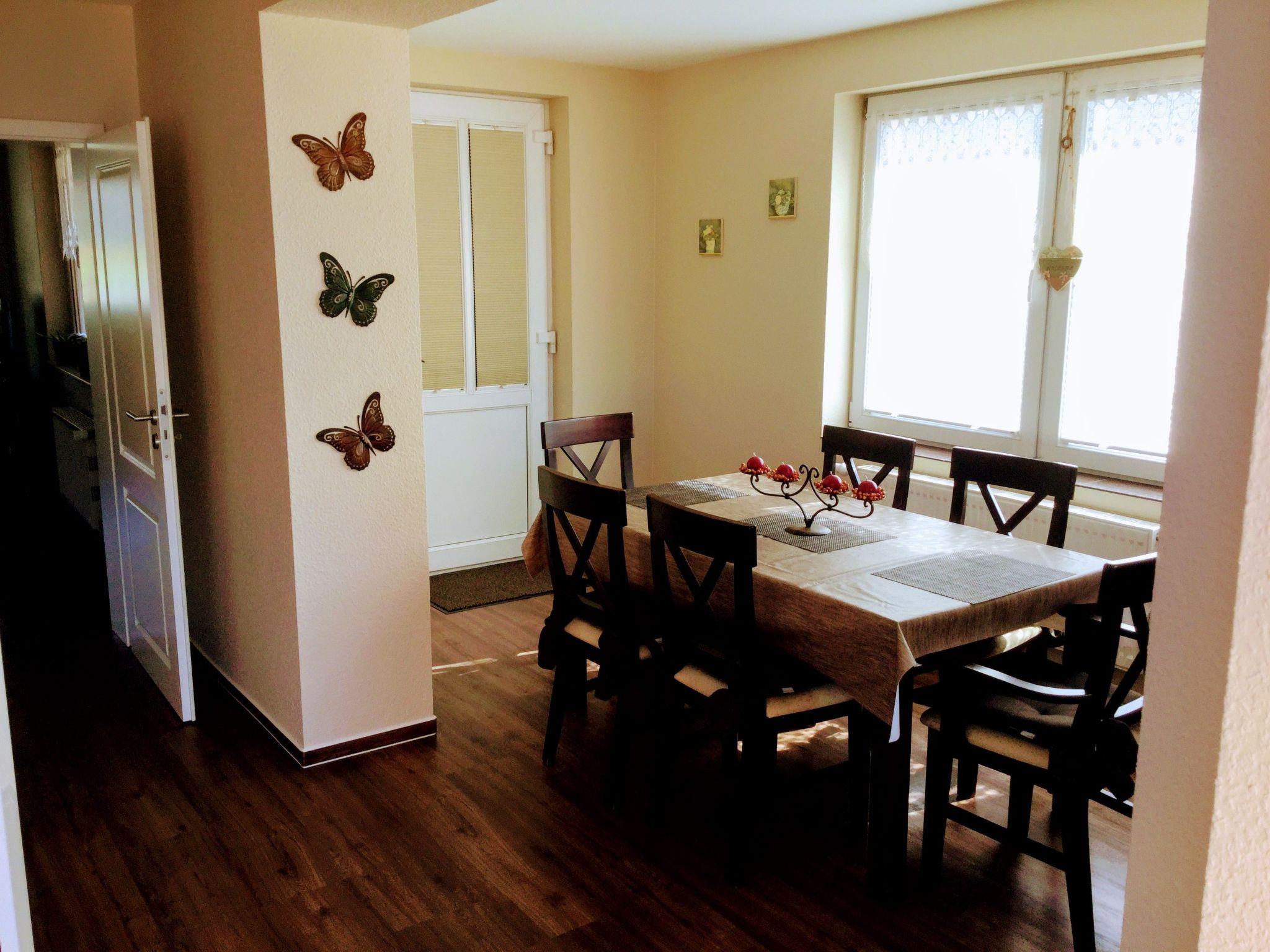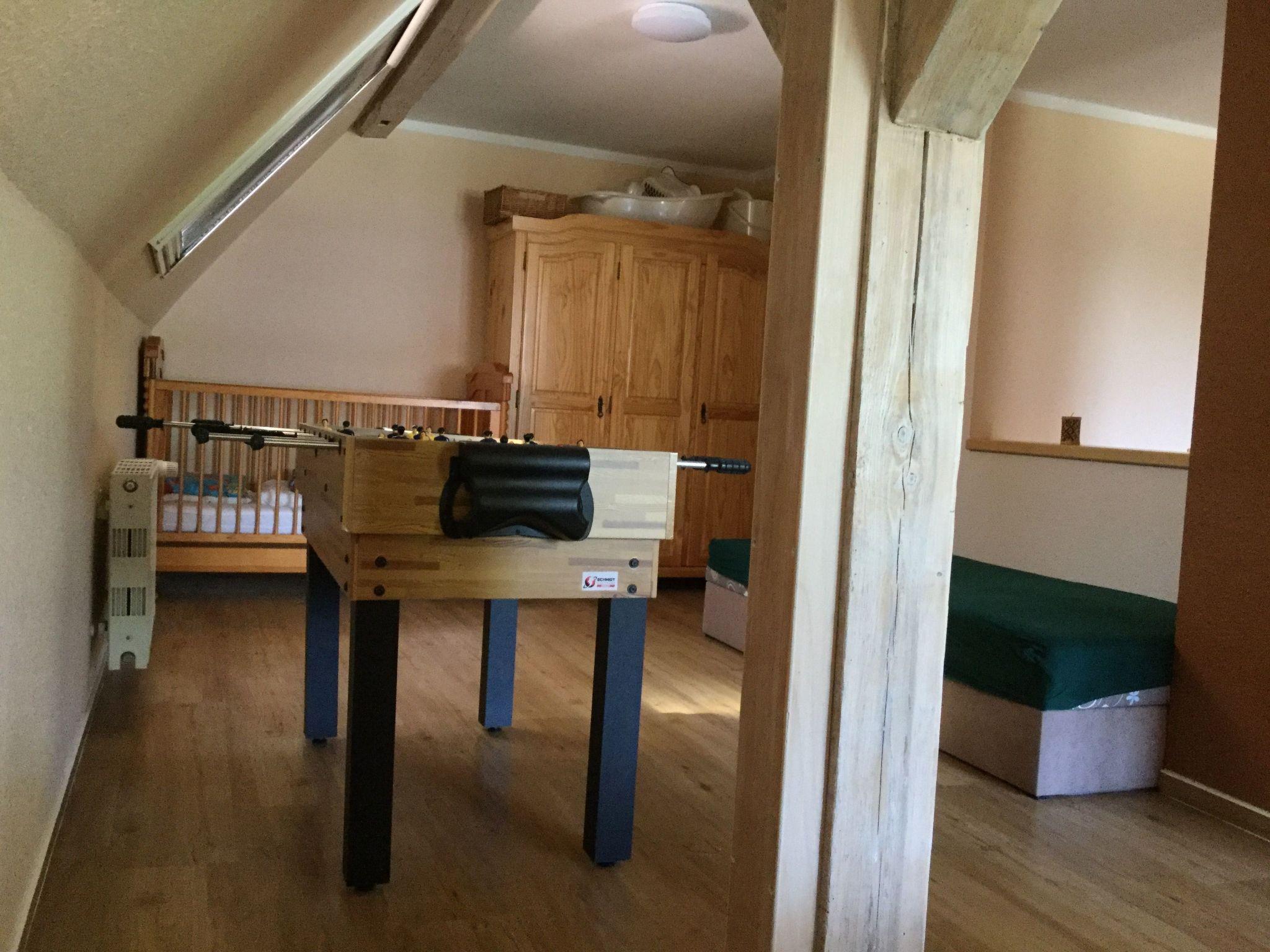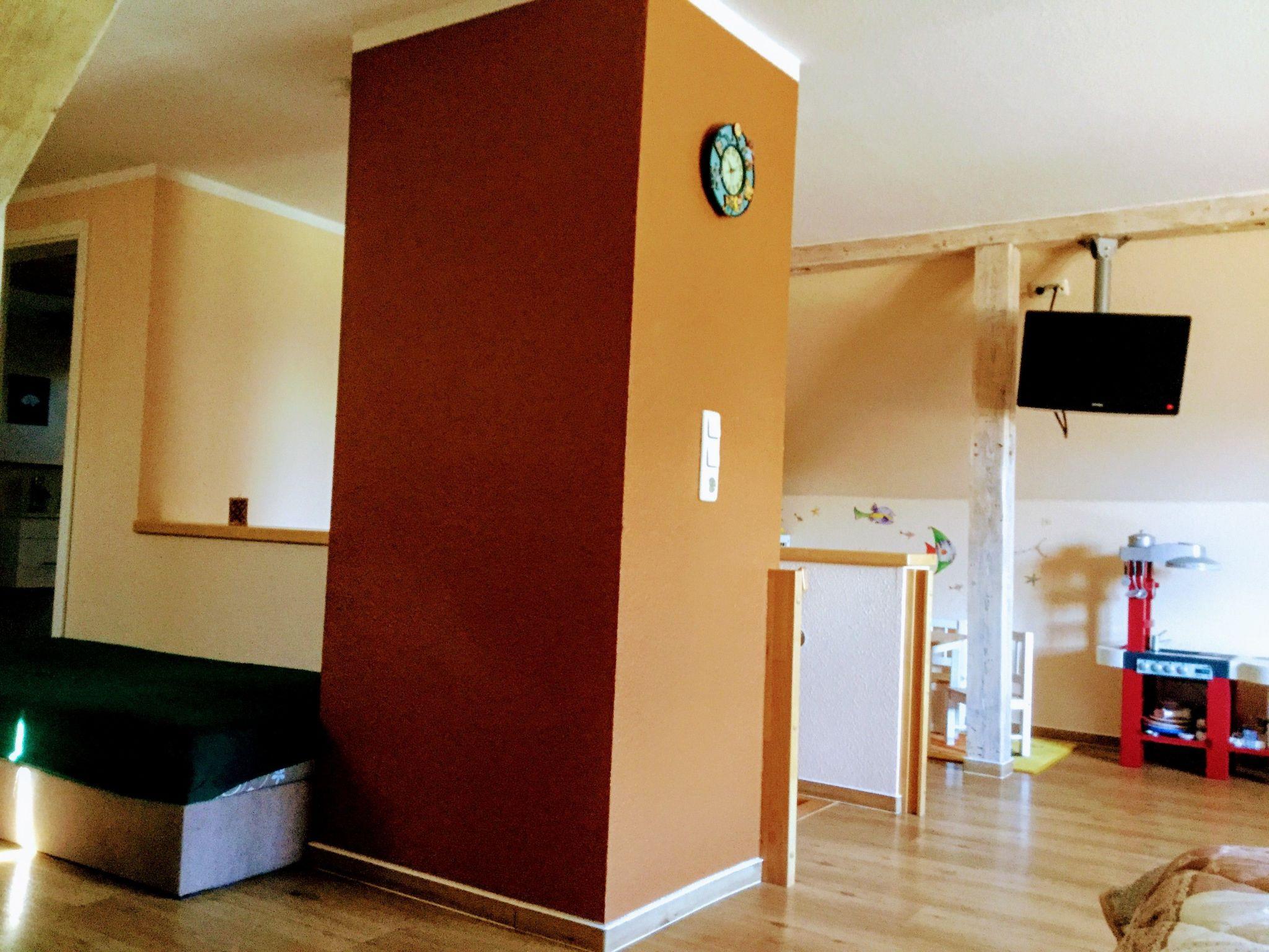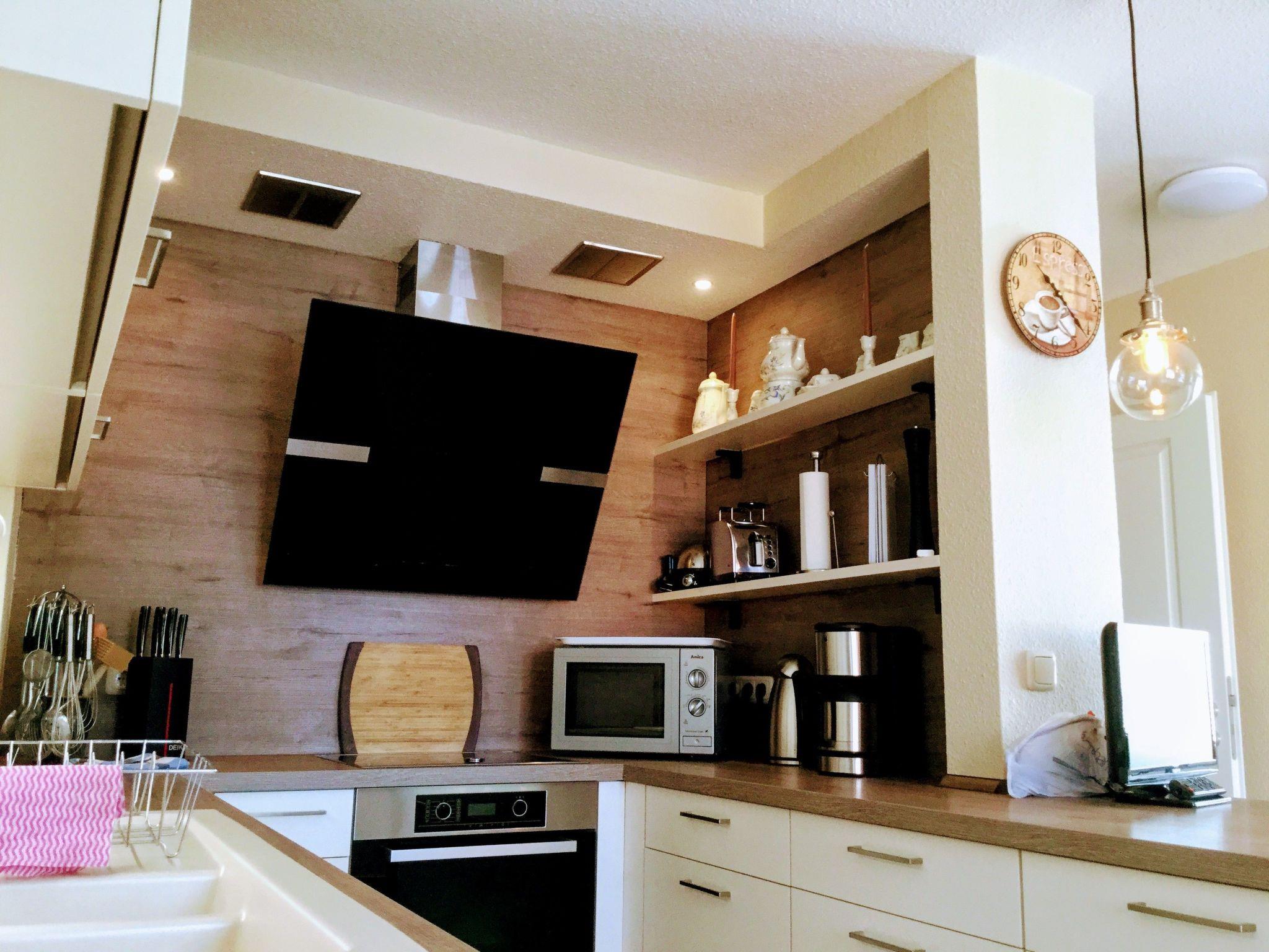 An oasis of well-being has been created on over 100 m² over two floors. On the first floor you will find the kitchen, the living room with fireplace corner, a large dining room with couch and TV, a bedroom with TV and a full bathroom en suite. On the second open-plan floor there is an additional sleeping area (only suitable for children) with a double bed, an extra bed and a cot. There is also a small TV corner with sofa and armchairs and a small bathroom with WC and washbasin. There are plenty of toys for our younger guests in the large children's play corner. After a long day at the beach or at the Baltic Sea or with countless impressions of the city, you can relax in the large living room on our 'Lümmel Couch' with a novel or a good film, in the cold season in front of the fireplace (satellite TV and DVD player available). If you like cooking, our fully equipped kitchen makes it a breeze. From the cooker to the microwave, blender and coffee machine, everything you need to serve a delicious breakfast, lunch or dinner in the dining area overlooking the lake.