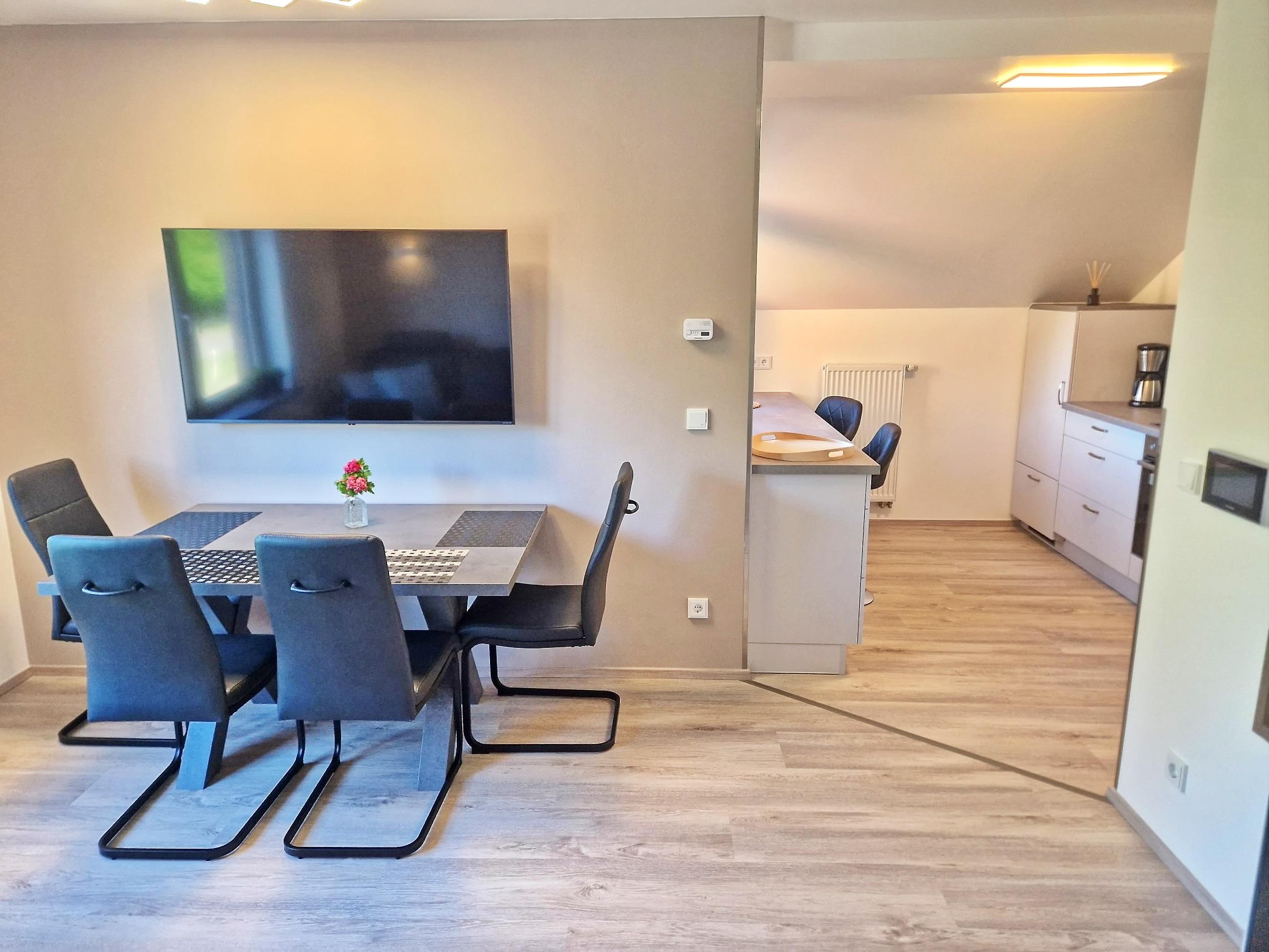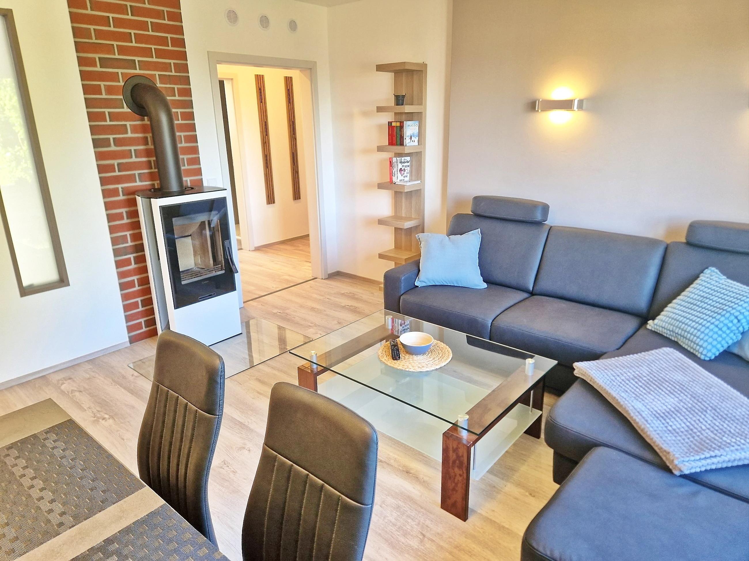 - Wohnzimmer mit offener Küche vollausgestattet, Essbereich für 4 Personen, Blick auf den Schweriner See