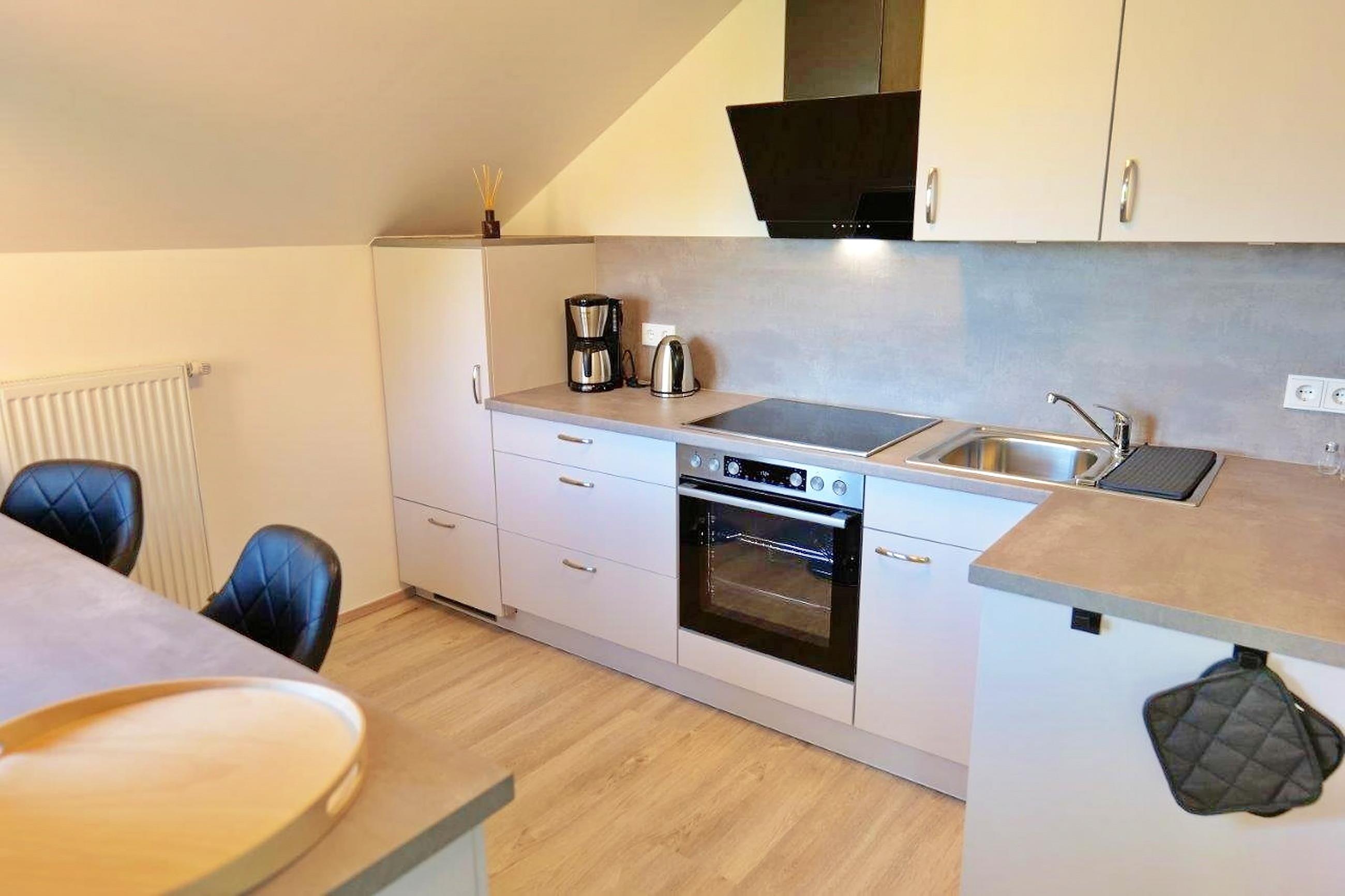 Küchenausstattung: Kühlschrank mit Gefrierfach, Backofen, 4-Platten-Ceranherd, Geschirrspüler, Kaffeemaschine, Wasserkocher, Geschirr, Besteck und vieles mehr)