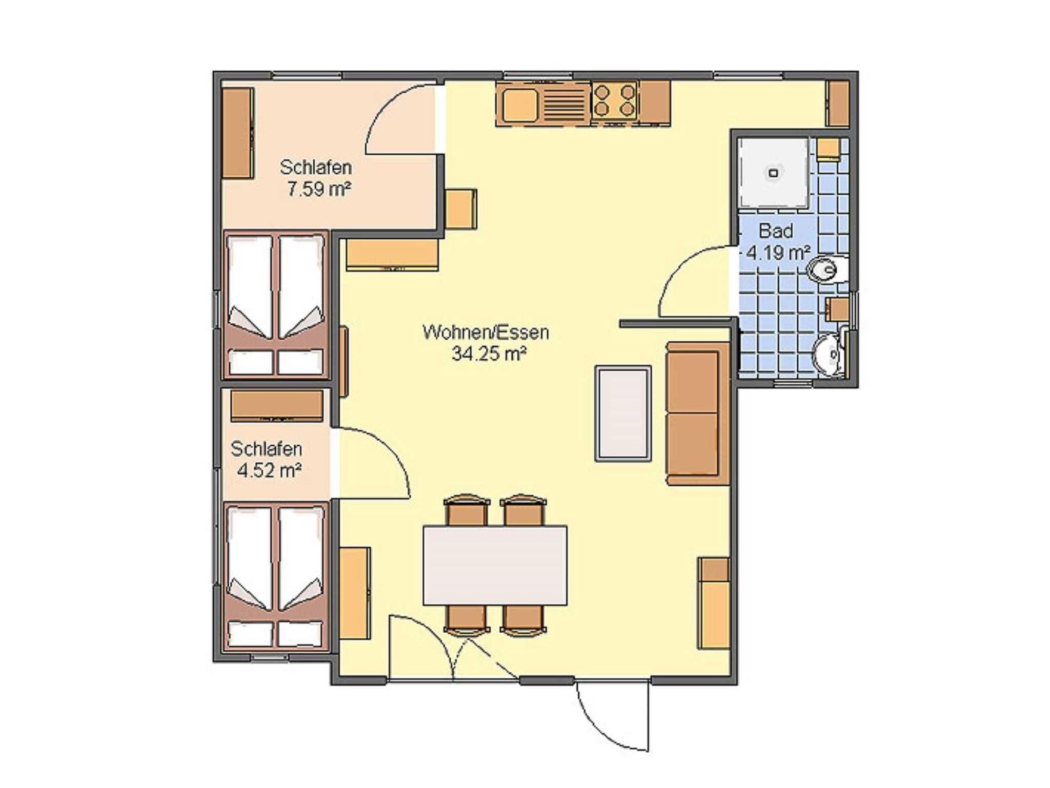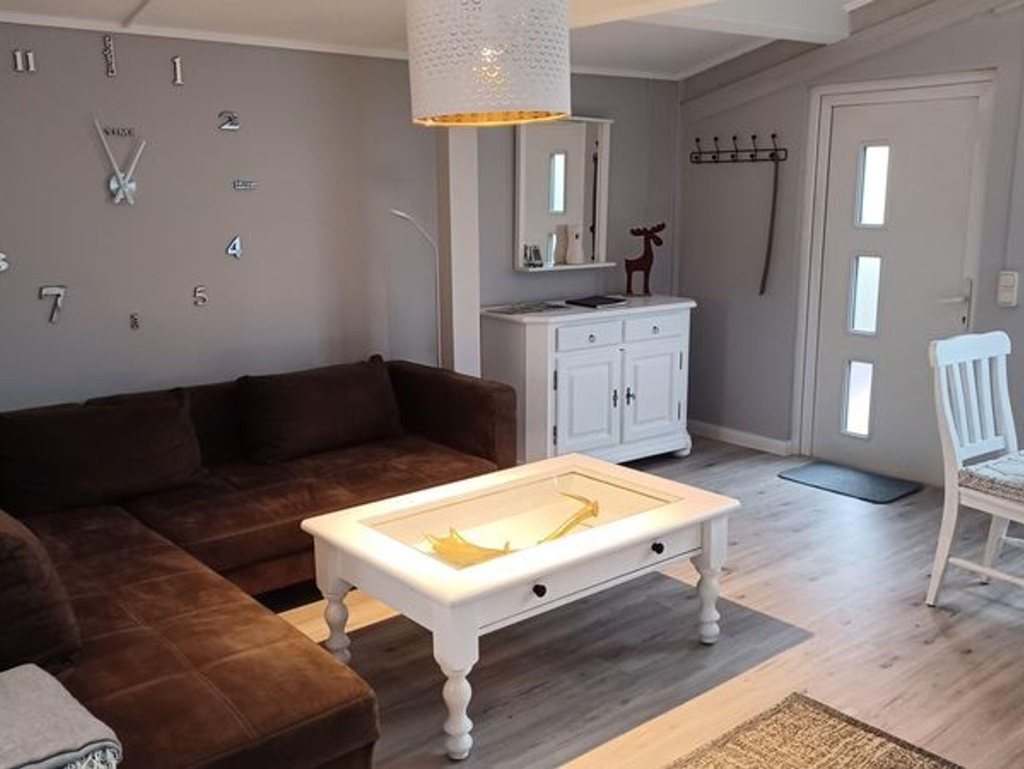 Die Wohnfläche beträgt 56 m². Es wurde 2013 komplett saniert. Das Haus verfügt über eine große überdachte Terrasse und bietet Platz für maximal 5 Personen. Es ist ausgestattet mit einem geräumigen Wohnraum mit Eßbereich und offener Küche. Die Couch im Wohnbereich bietet die Möglichkeit zu einer Aufbettung. Desweiteren gibt es zwei kleine Schlafräume jeweils mit Doppelbett (1,30 x 2,00 m). Das Badezimmer verfügt über Dusche und WC.