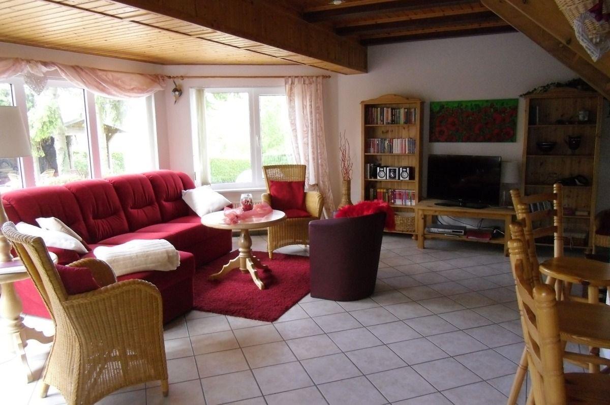 Sie betreten ihr Ferienhaus über einen kleinen Flur mit einer Bank, Garderobe, Spiegel und Schuhschrank. Das Wohnzimmer, mit Essbereich und offener Küche, ist mit einer Eckcouch, einem kleinen Tisch, einem Sessel, einem Wohnzimmerschrank, TV Gerät mit DVD ? Player und CD-Radio, sowie einem Esstisch mit 6 Stühlen möbliert. Die Einbauküche ist mit Geschirrspüler, Herd mit Backofen, Mikrowelle, Kühlschrank mit Gefrierfach, Kaffeemaschine, Wasserkocher, Brotmaschine und Toaster ausgestattet. Abgegrenzt zum Wohnbereich wird die Küche durch eine Tresenbar mit 3 Barstühlen. Vom Essbereich aus gelangen Sie in das Bad mit Dusche, Badewanne, WC und Waschmaschine. Über eine Treppe kommen Sie nach oben zu den zwei Schlafzimmern und dem Gäste WC. Hier ist auch ein großer Balkon. In den beiden Schlafzimmern stehen jeweils ein Doppelbett, ein Kleiderschrank und ein Tisch mit einem Stuhl. In einem Schlafzimmer steht zusätzlich ein Babybett, im Anderen noch ein Kojenbett mit ausziehbarer Aufbettung. Von der Küche aus kommen Sie auf die Terrasse mit Gartenmöbeln und Holzkohlgrill. Auf ihrem Grundstück befinden sich auch eine Lagerfeuerstelle und eine große Liegewiese zum entspannen. Parkplätze und 1 Carportplatz sind direkt am Haus vorhanden.