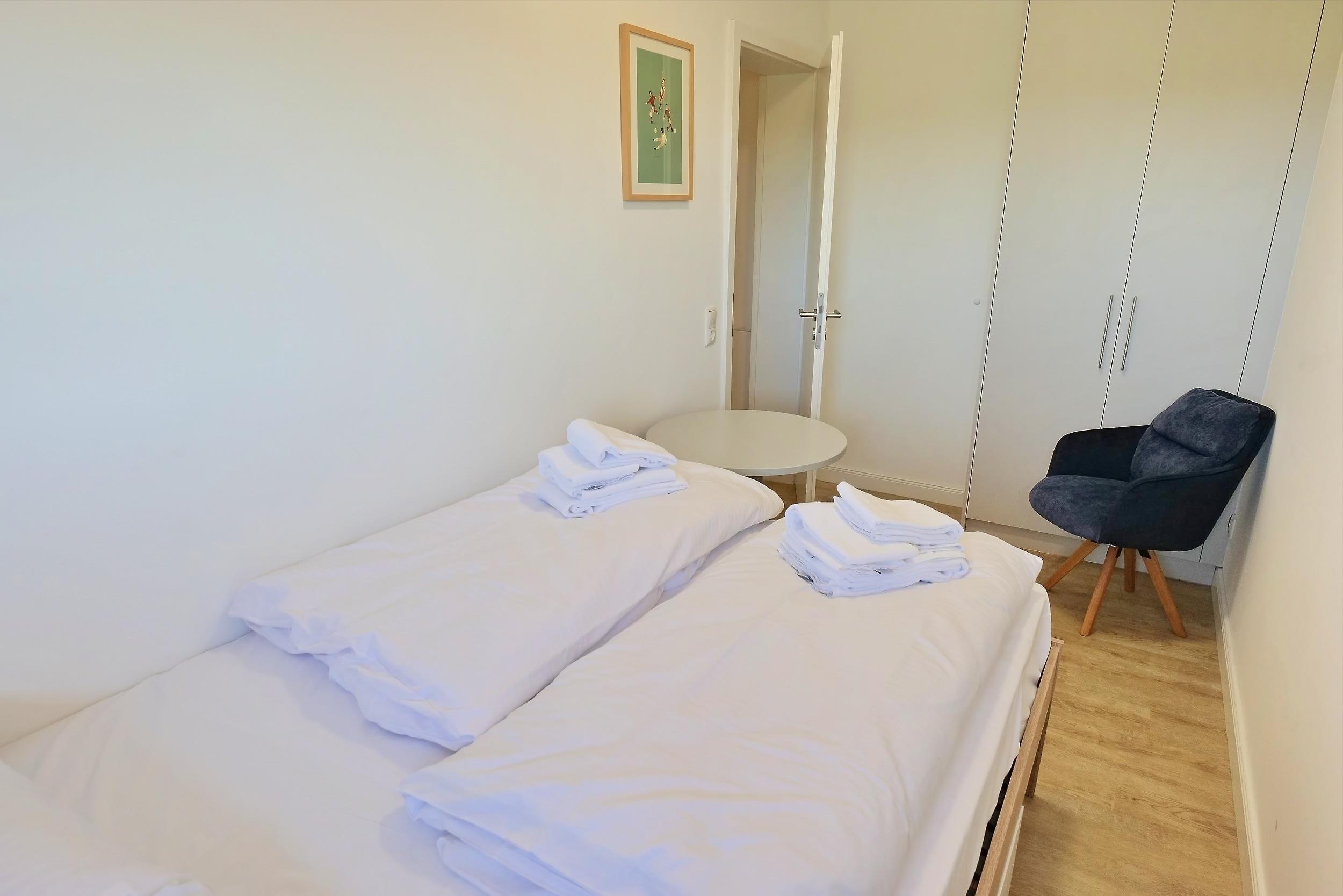 Hier machen Sie es sich zum Fernsehen, oder Musik hören über das Internetradio-USB- gemütlich. Selbstverständlich nutzten Sie das WLAN gebührenfrei. Gäste, die sich gerne eigenständig mit Mahlzeiten versorgen möchten, werden die voll ausgestattete Einbauküche zu schätzen wissen. Ihre zubereiteten Mahlzeiten können Sie am Esstresen oder bei wärmeren Außentemperaturen gerne auf der saisonal möblierten Dachterrasse zu sich nehmen. Idealerweise verfügt das Appartement über zwei separate Schlafzimmer 1x mit Doppelbett und einem Kleiderschrank. Das zweite Schlafzimmer ist mit einem breiten Bett 140cm x 200cm, sowie einem Kleiderschrank ausgestattet.