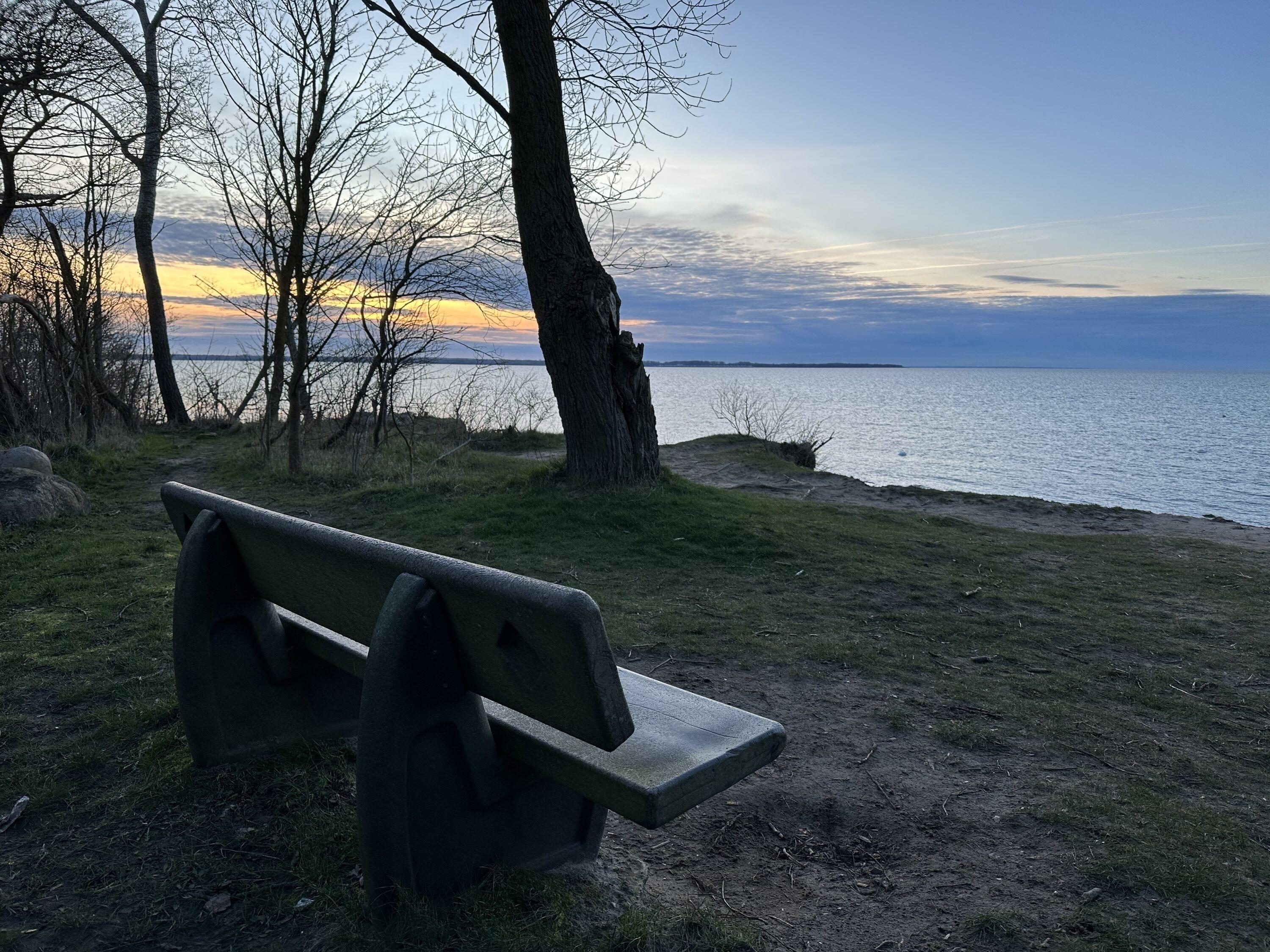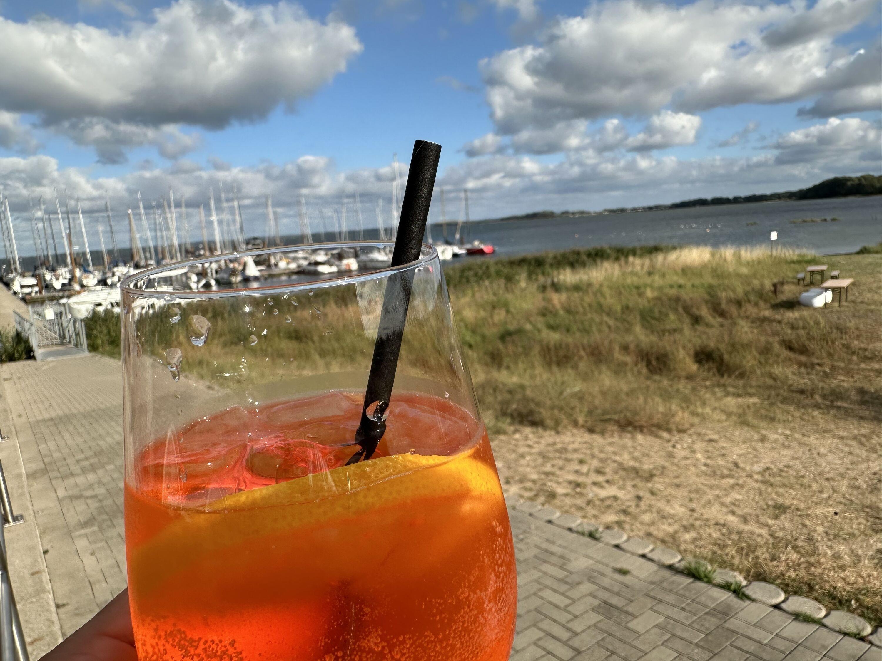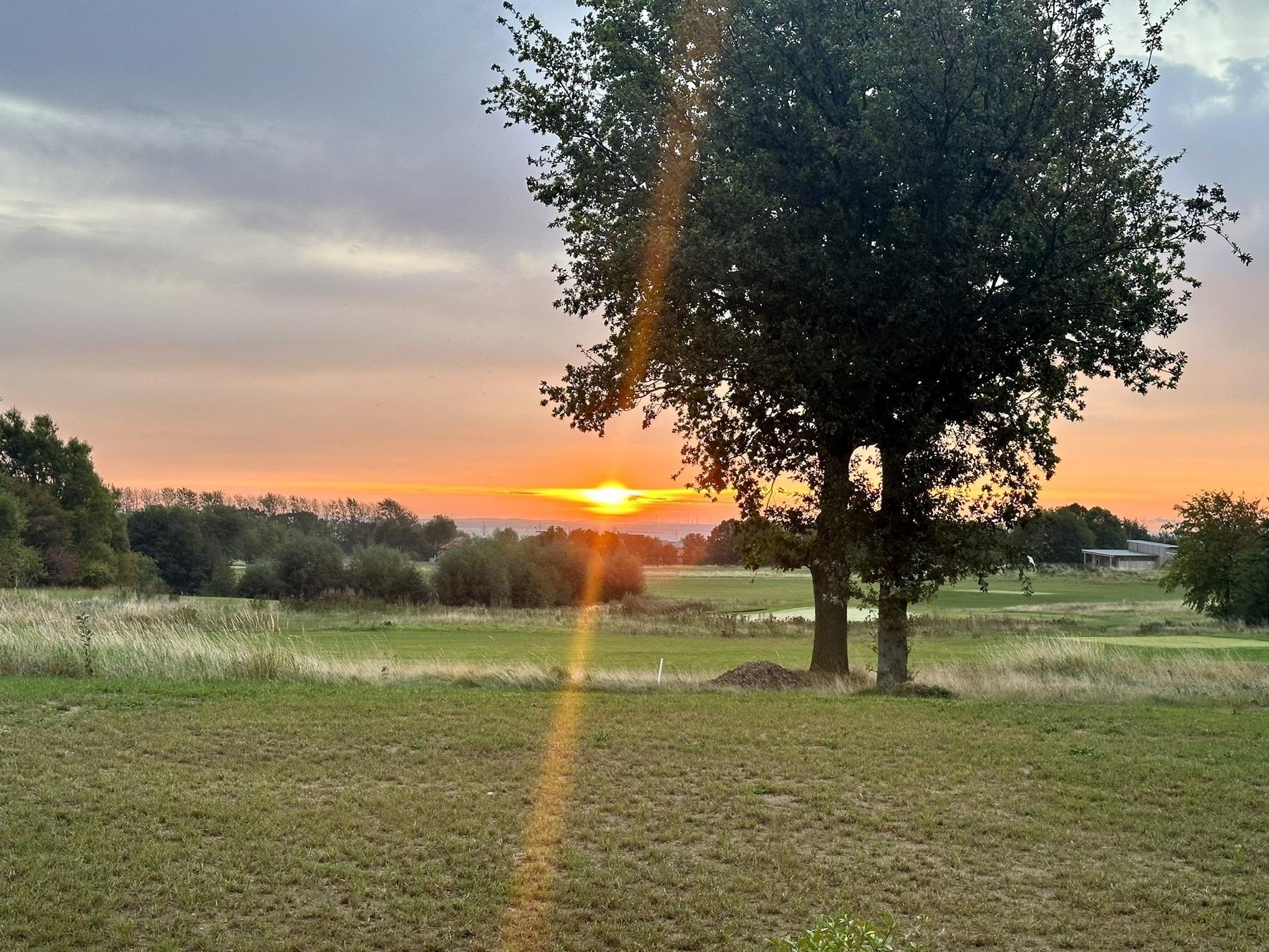 Die großzügige Terrasse mit Sitzgruppe und Sonnenschirm bietet direkten Zugang zum Garten. Von dort lässt sich der Blick auf den Golfplatz, die Ostsee und die Insel Poel genießen. Für Frühaufsteher: Den Sonnenaufgang begleitet von Vogelgezwitscher zu genießen, ist wunderbar.
