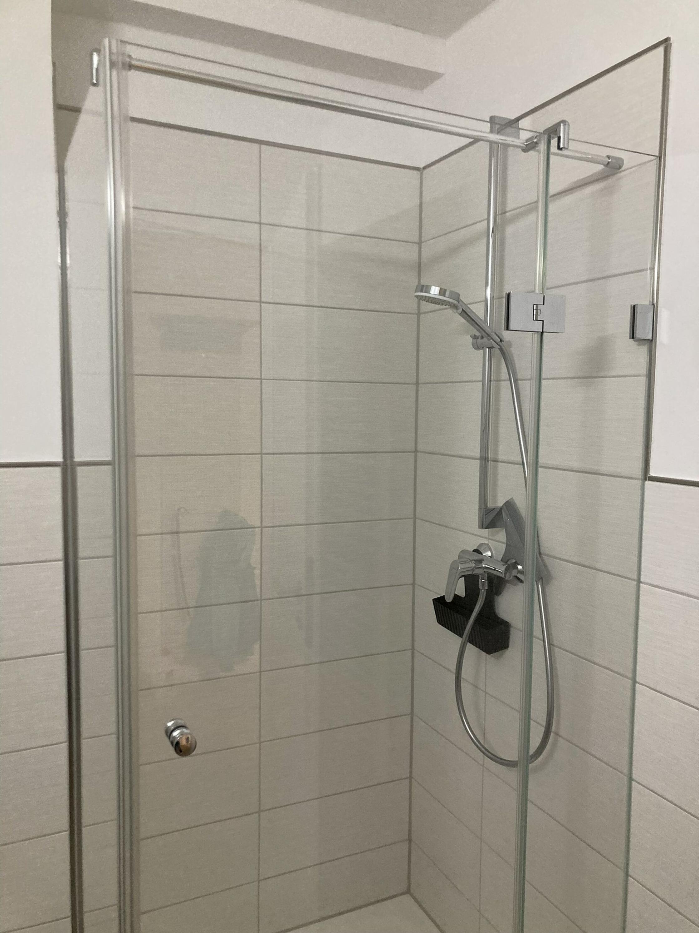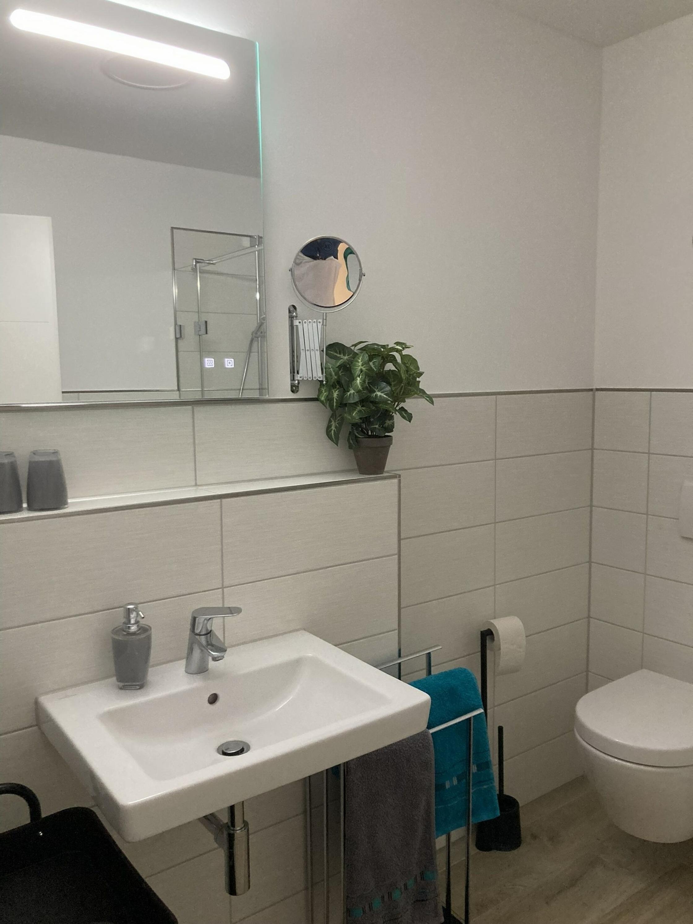 Das helle Badezimmer besticht mit einer bodengleichen Dusche, WC und großem Waschbecken. Der beleuchtete Spiegel, ein Vergrößerungsspiegel, sowie diverse Ablagemöglichkeiten sind ebenso selbstverständlich wie ein Fön.