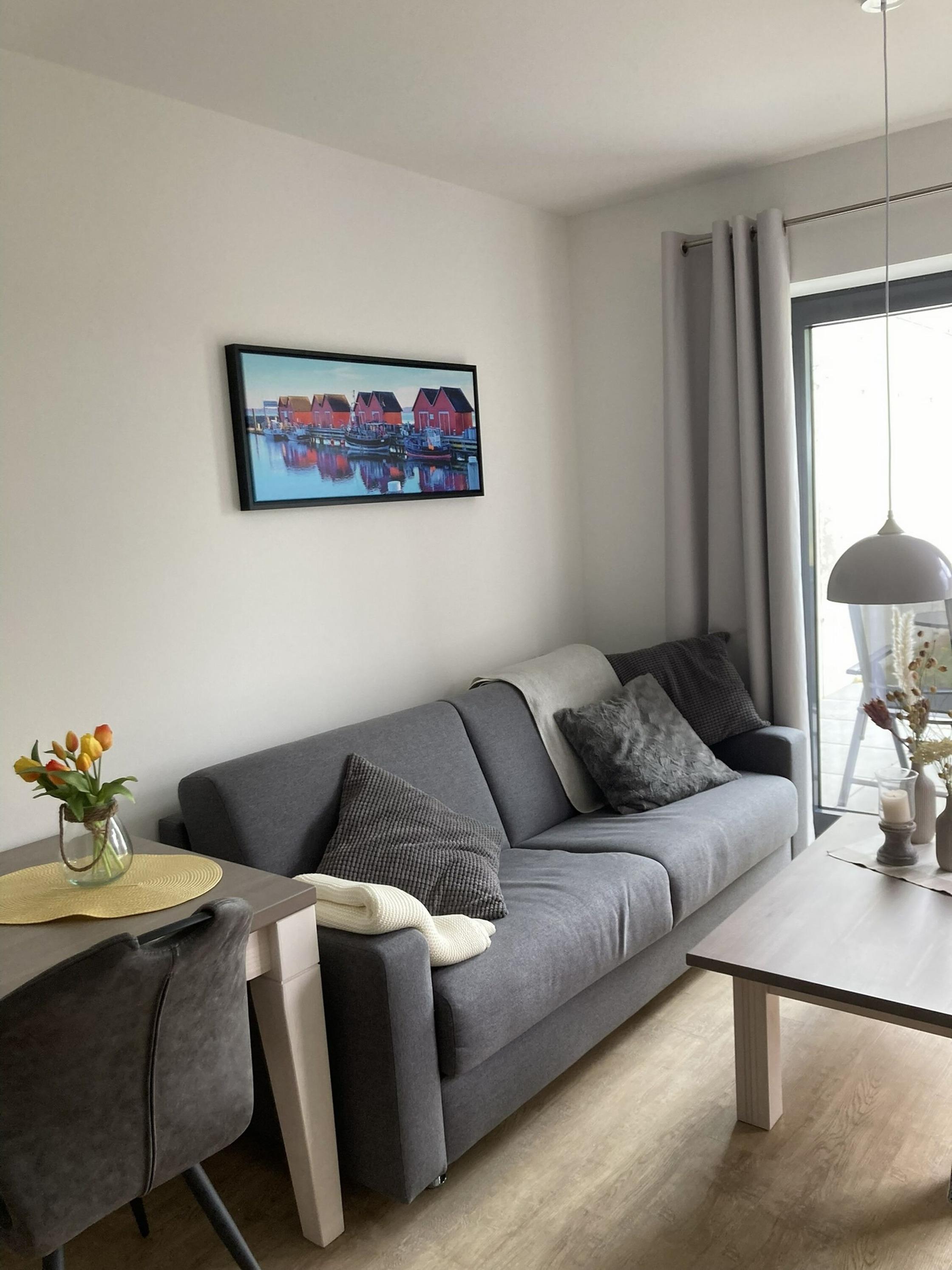Das geräumige und helle Wohnzimmer mit direktem Zugang zur Terrasse empfängt Sie mit einer gemütlichen Sitzecke mit (Schlaf-)Couch, Sessel und Tisch. Ein großes TV-Gerät und eine Hifi-Anlage gehören ebenso zur Ausstattung.
