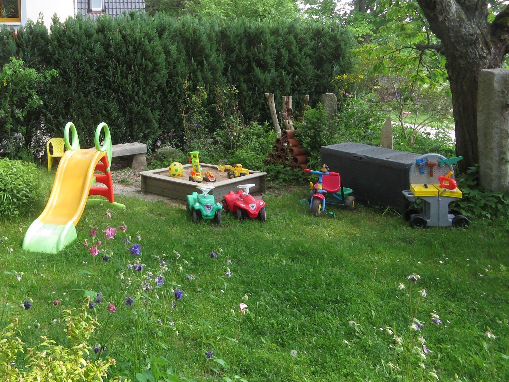 ? Wiesenlabyrinth, Bolzplatz, Basketballkorb, Kinderspielhaus, Sandkasten/-spielsachen, Bobby Cars, Dreirad etc.