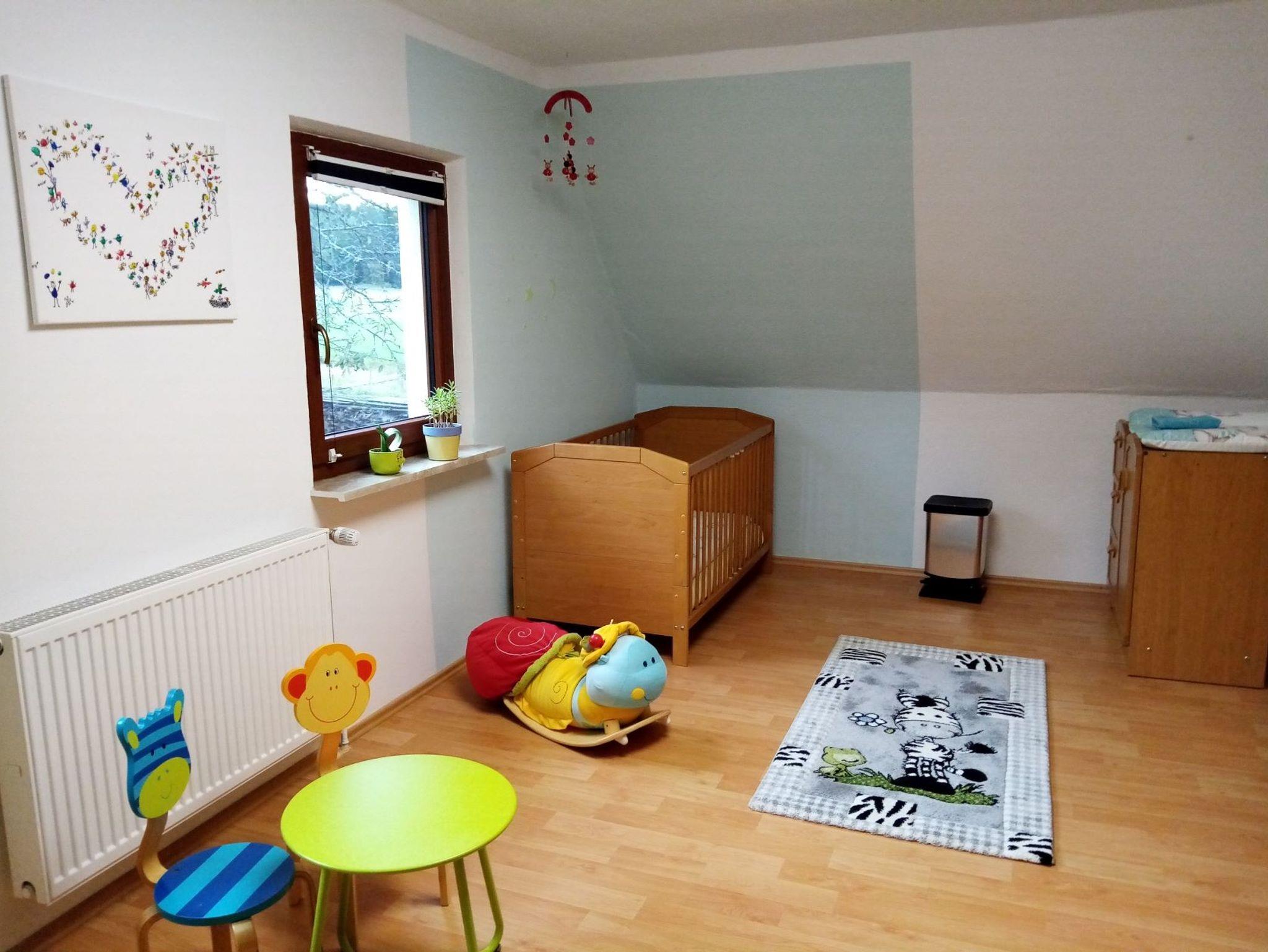 ? Kinderzimmer mit Einzelbett, Baby- oder Klappbett, Kleiderschrank, Sofa, Wickelkommode, Kindertisch und zwei Kinderstühlen