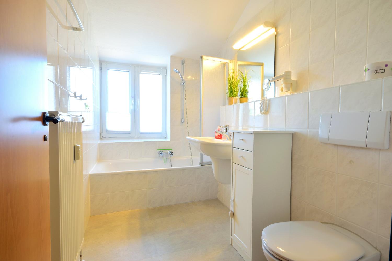 Über eine Treppe, welche mit Kinderschutzgittern versehen ist, gelangen Sie in das Obergeschoss. Hier befindet sich das größere Badezimmer mit Badewanne, WC, Waschbecken, Badewannen- Wickelauflage und Fenster mit Blick über die Halbinsel.