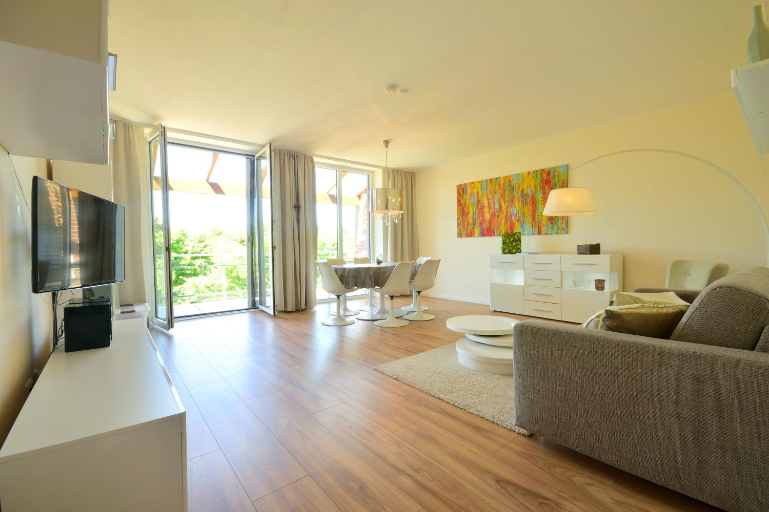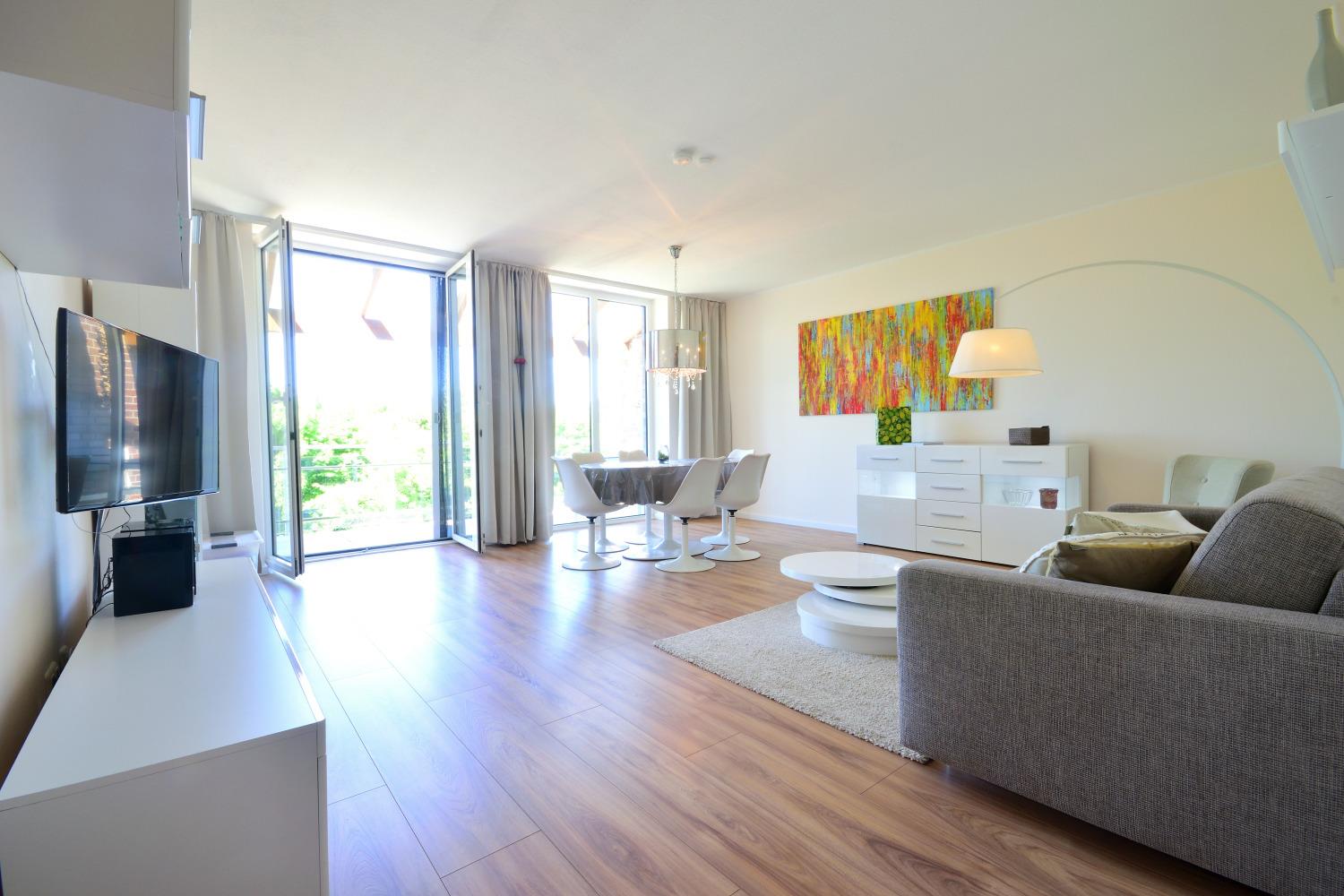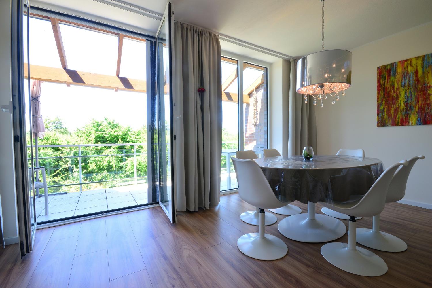Im Untergeschoss befindet sich das großzügige, helle Wohnzimmer mit Sat-TV (Smart-TV mit Internet), Spielen, Büchern und DVDs für Erwachsene und Kinder, ein großer Esstisch, Stereoanlage und Blu-Ray Player. WLAN steht Ihnen auf dem gesamten Gelände kostenlos zur Verfügung. Das große Sofa lässt sich bequem zu einem hochwertigen Bett mit Kaltschaummatratze und Ergo-Flex Lattenrost umbauen. Die Fenster in der Wohnung sind mit Fliegenschutzgittern ausgestattet. Vom Wohnzimmer gelangen Sie auf den Balkon, von dem Sie einen herrlichen Blick über die naturbelassene, unverbaute Halbinsel bis zur Ostsee genießen können. Vom Balkon können Sie zudem traumhafte Sonnenuntergänge bei einem Glas Wein genießen. Der Balkon ist mit einer Sitzgruppe, 2 Klapp-Hochlehnern und Kinderstühlen ausgestattet.
