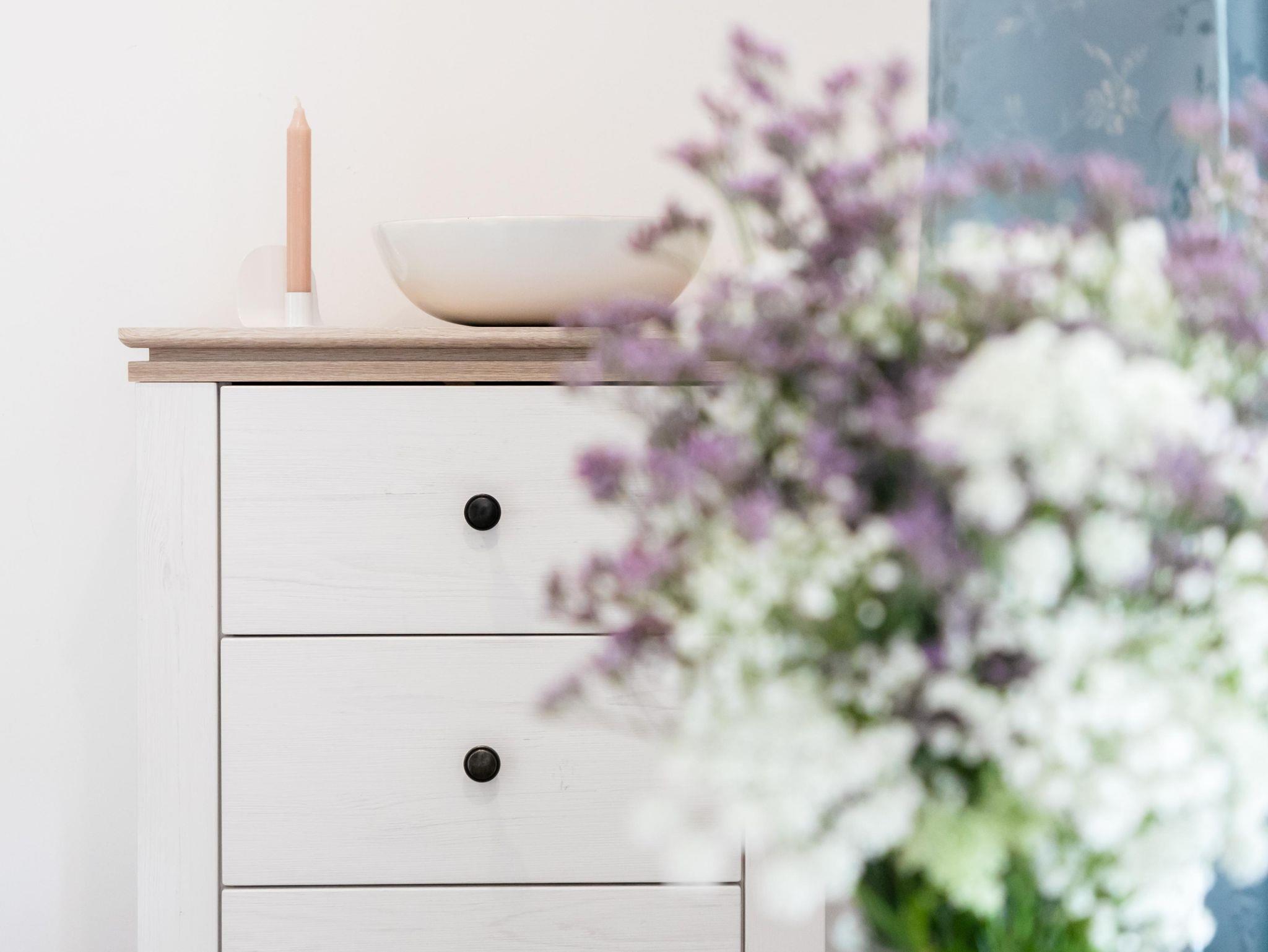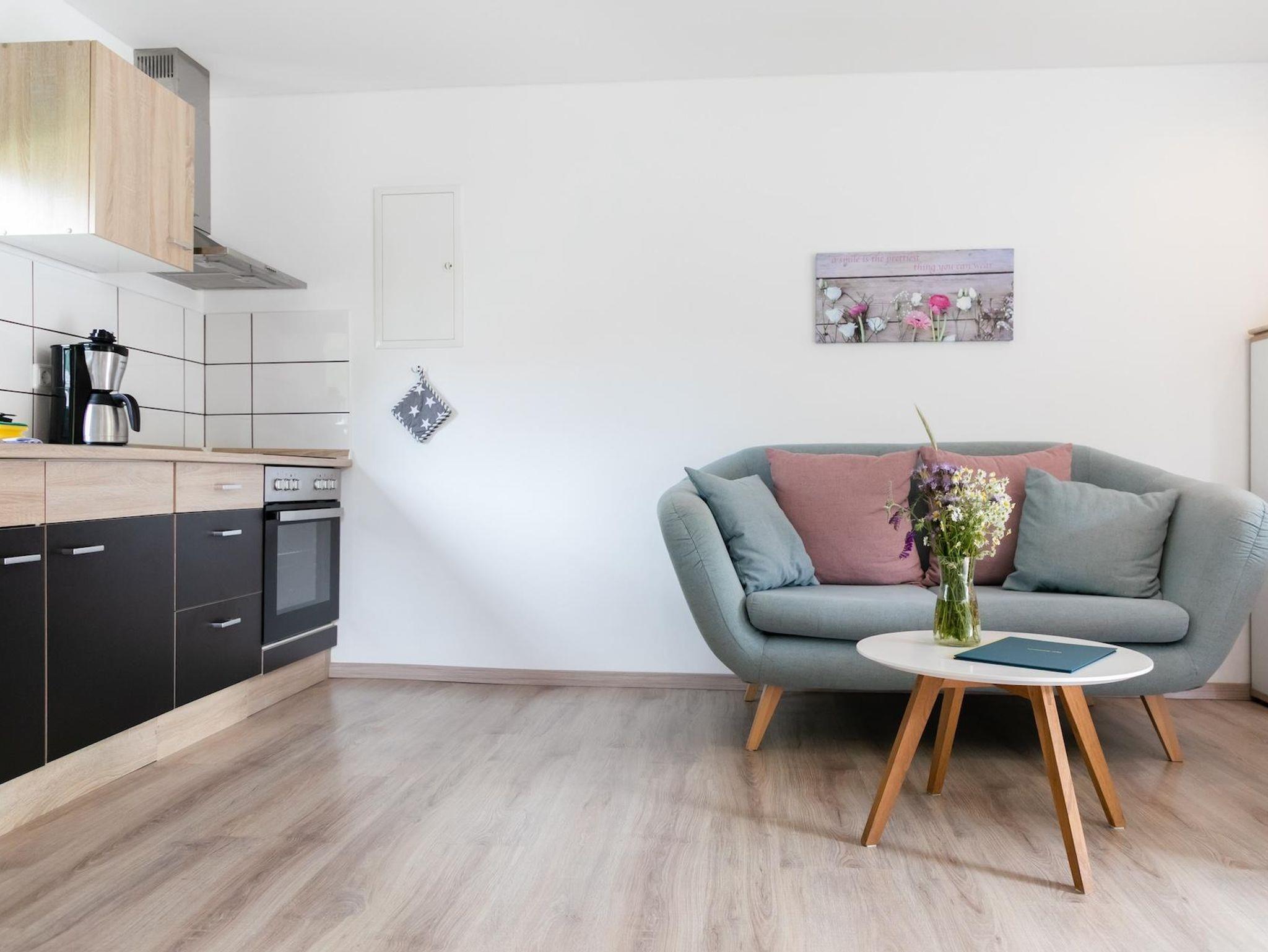 Die offene Wohnküche ist mit einem Kühlschrank, einem Herd mit Ceranfeld und einem Backofen sowie den wichtigsten Küchenutensilien ausgestattet. Ein Esstisch mit Stühlen, ein modernes Sofa, ein Couchtisch sowie ein Flachbildfernseher sorgen für Gemütlichkeit. Im Bad befindet sich eine ebenerdige Dusche, das WC und ein Waschbecken. Die überdachte Holzterrasse ist mit Stühlen und einem Tisch ausgestattet und lädt euch dazu ein, den vielen Vögeln im naheliegenden Wald zu lauschen. Der Strom wird den Gästen nach Verbrauch und Zählerstand nach Abreise in Rechnung gestellt. Das Warmwasser läuft über einen Durchlauferhitzer. Da wir unsere Mietobjekte allergikerfreundlich halten möchten, sind Katzen in all unseren Mietobjekten nicht gestattet.