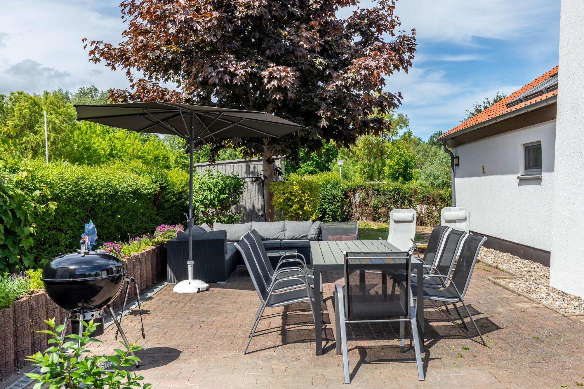 Der direkte Zugang zur großen Terrasse mit Gartenmöbeln und Sonnenschirm sorgt für Wohlfühlatmosphäre. Eine kleine Hecke sorgt teilweise für Sichtschutz. Das Grundstück ist jedoch nicht eingezäunt.