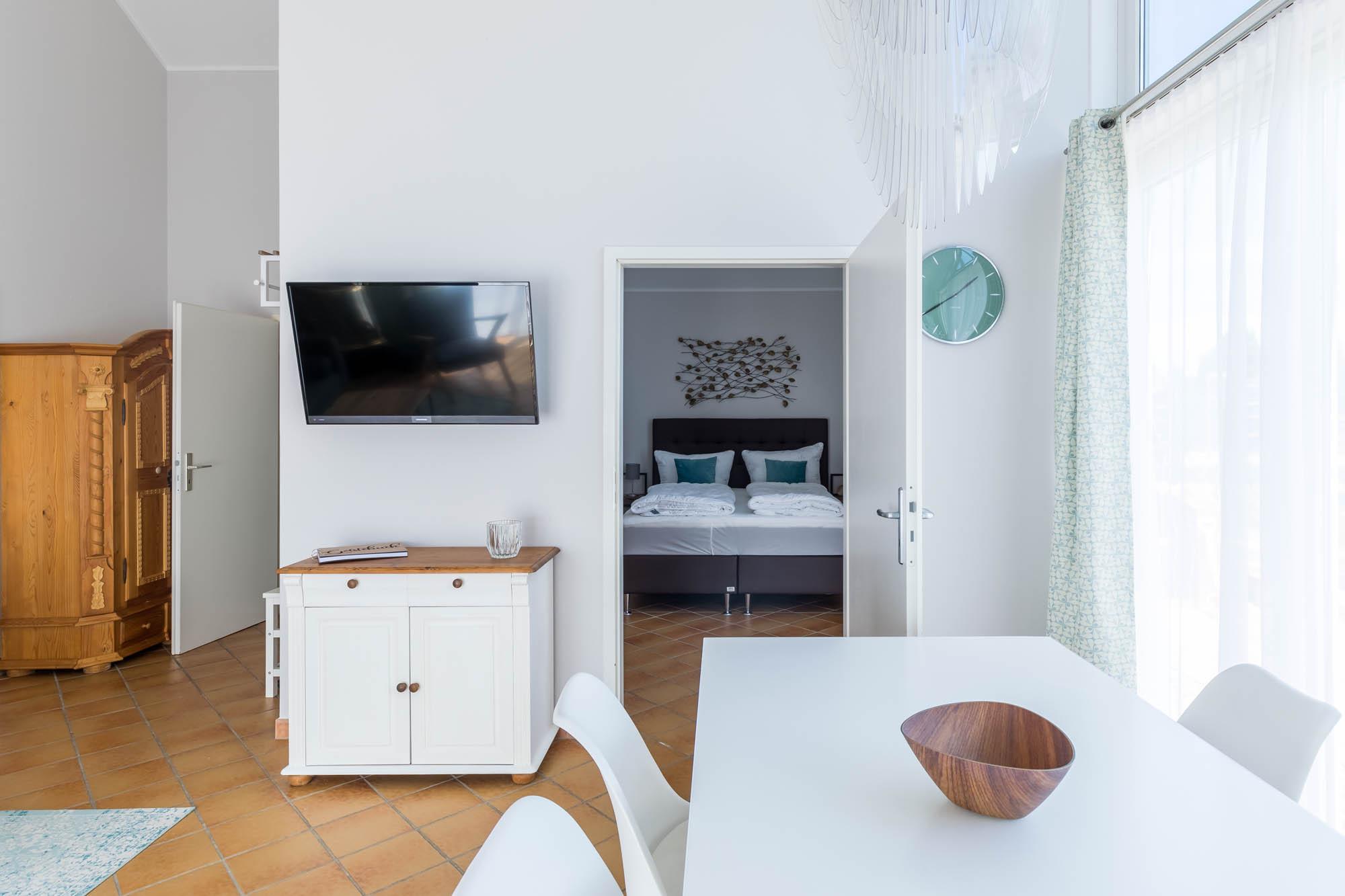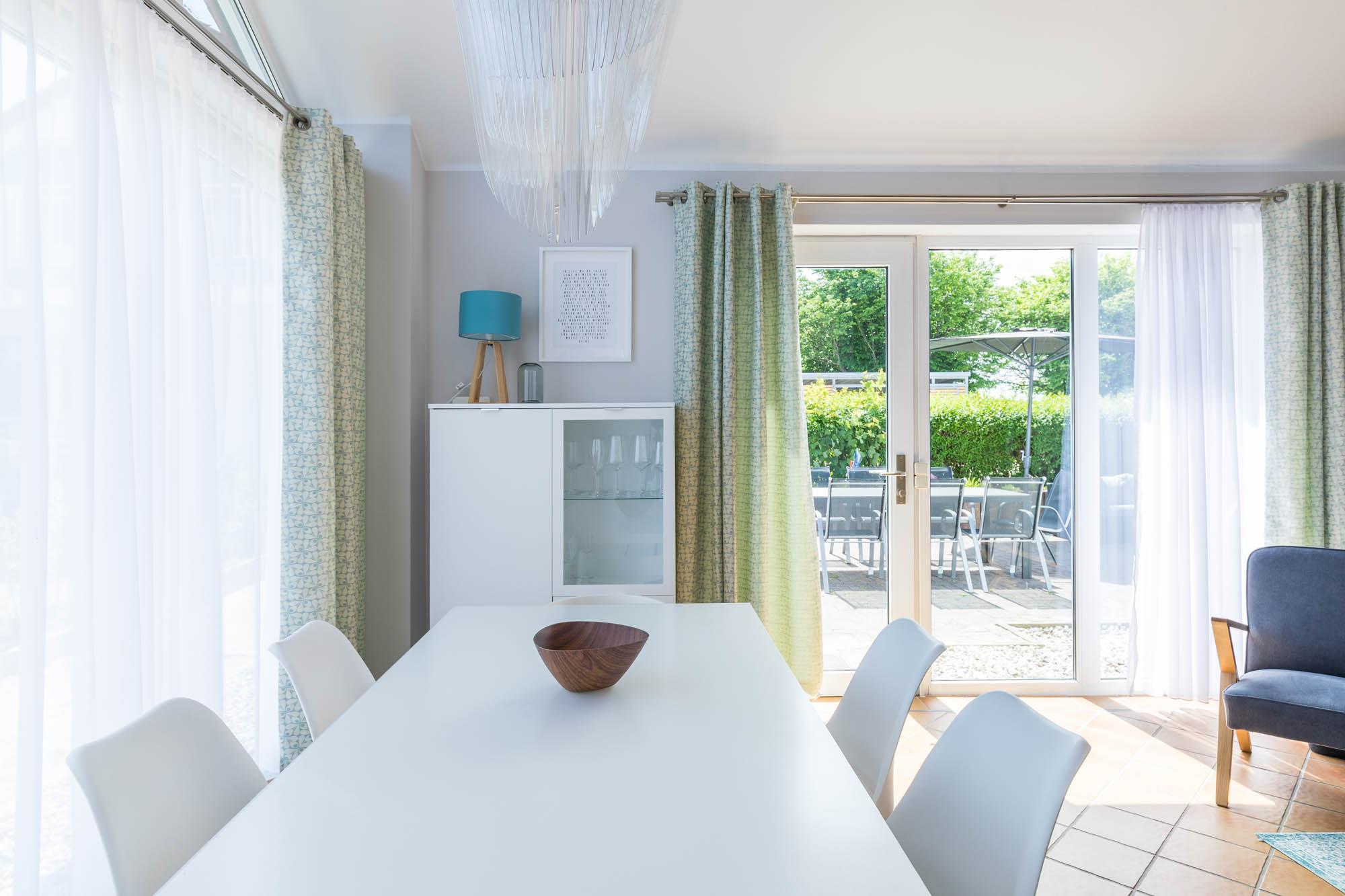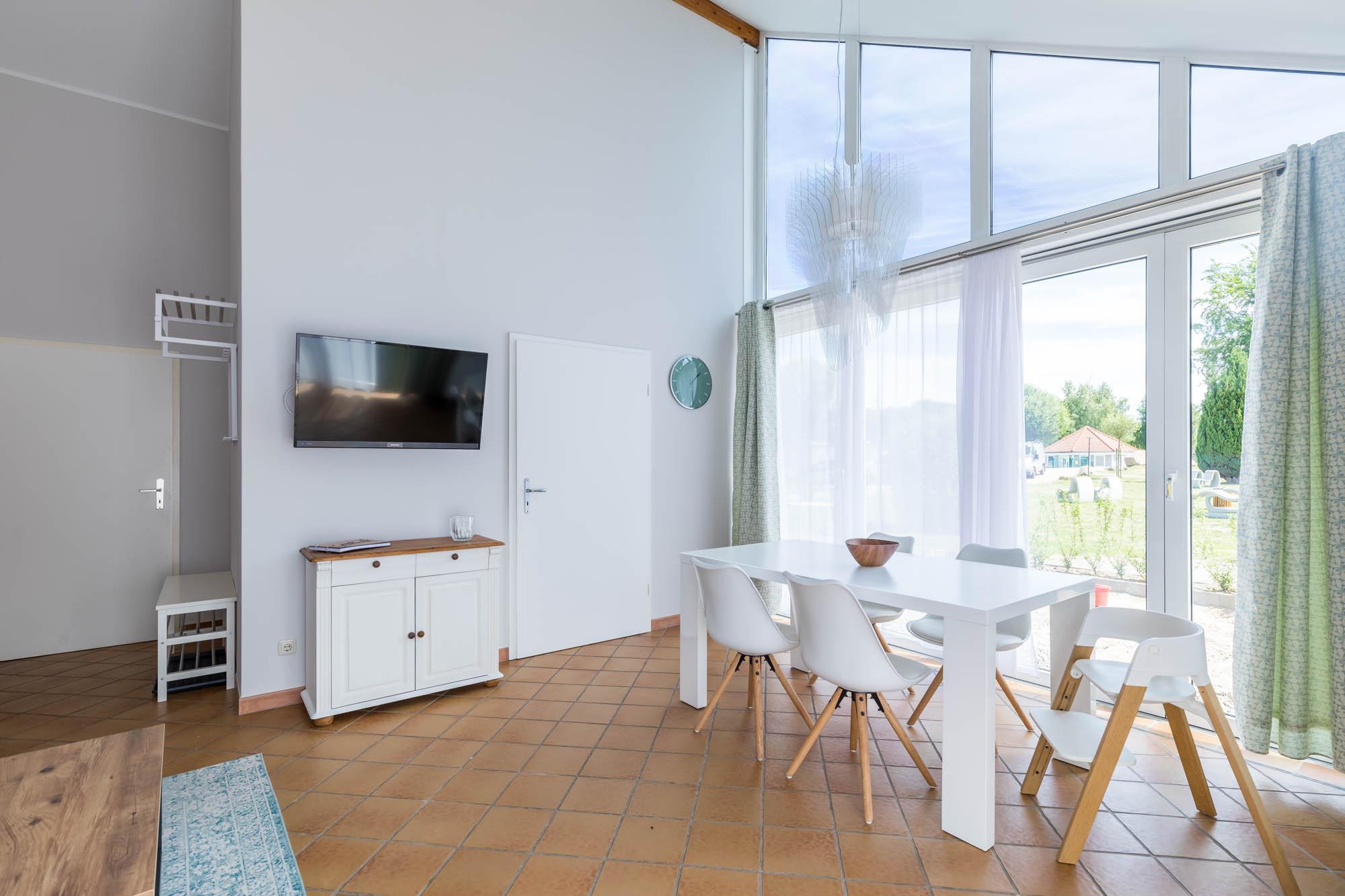 Der lichtdurchflutete Wohn- und Essbereich ist mit einem großen Esstisch und einem passenden Sofa mit Sessel eingerichtet. Für die Unterhaltung sorgt der TV.