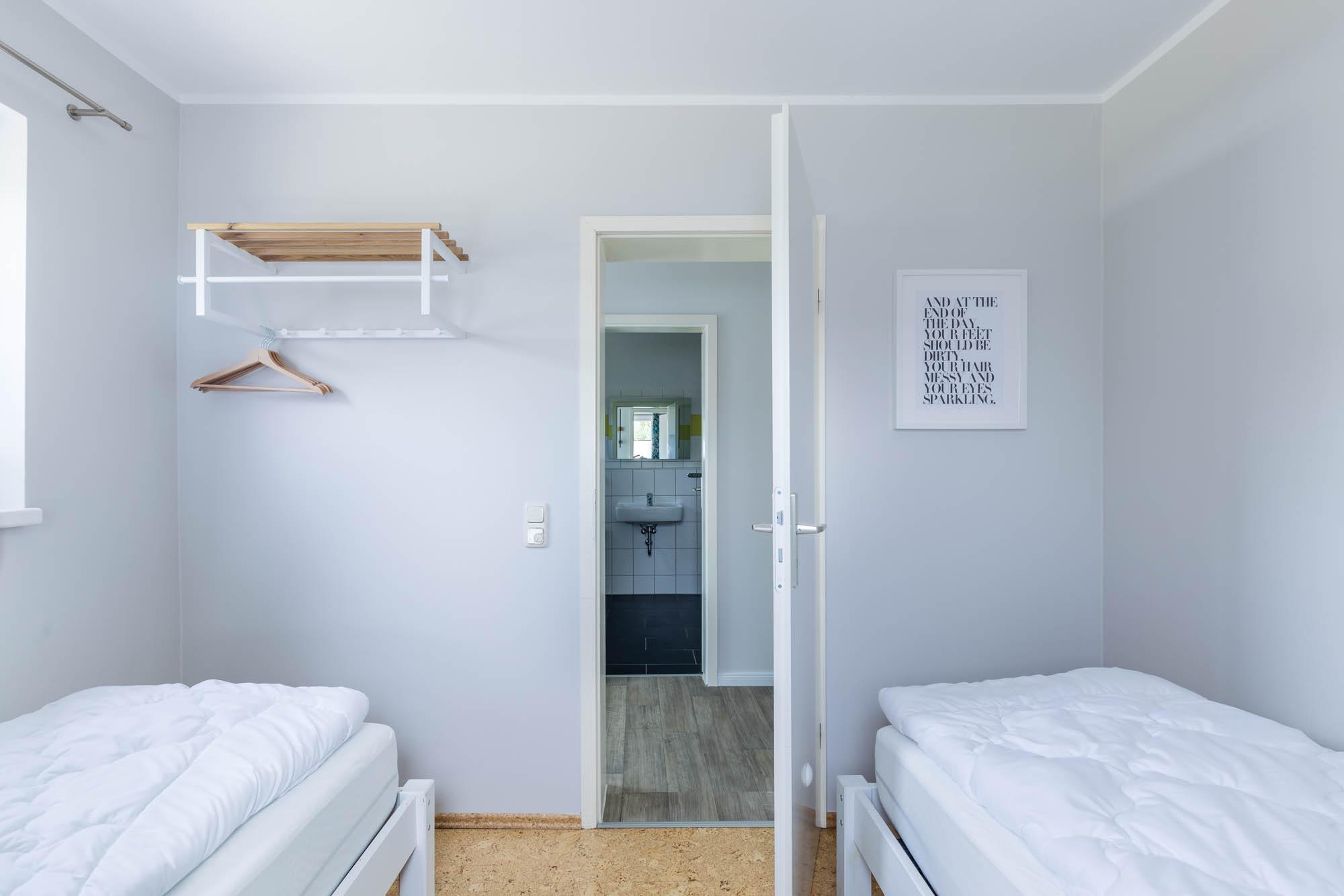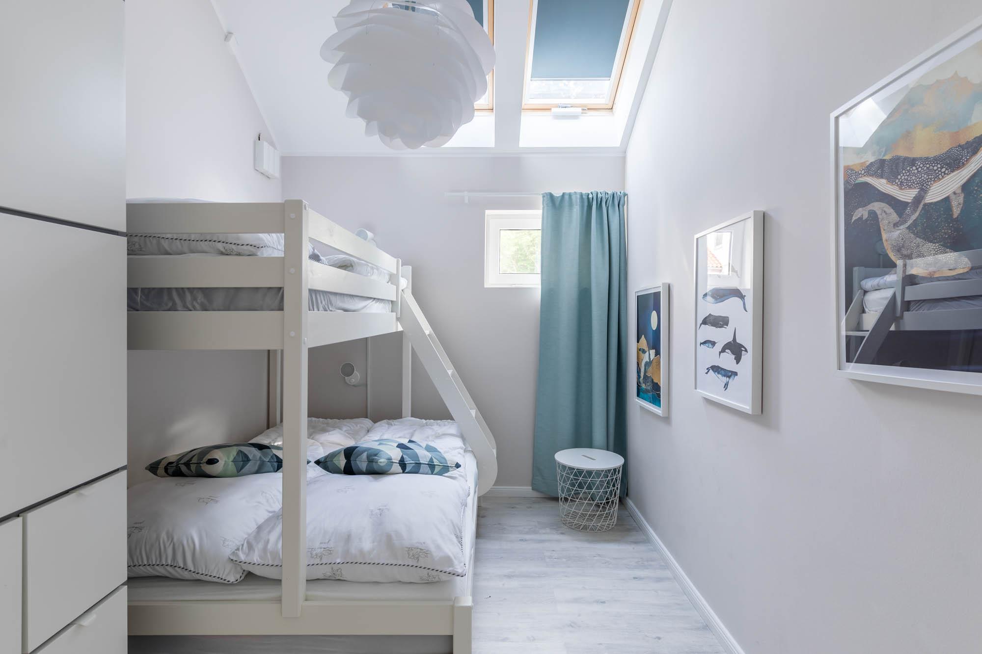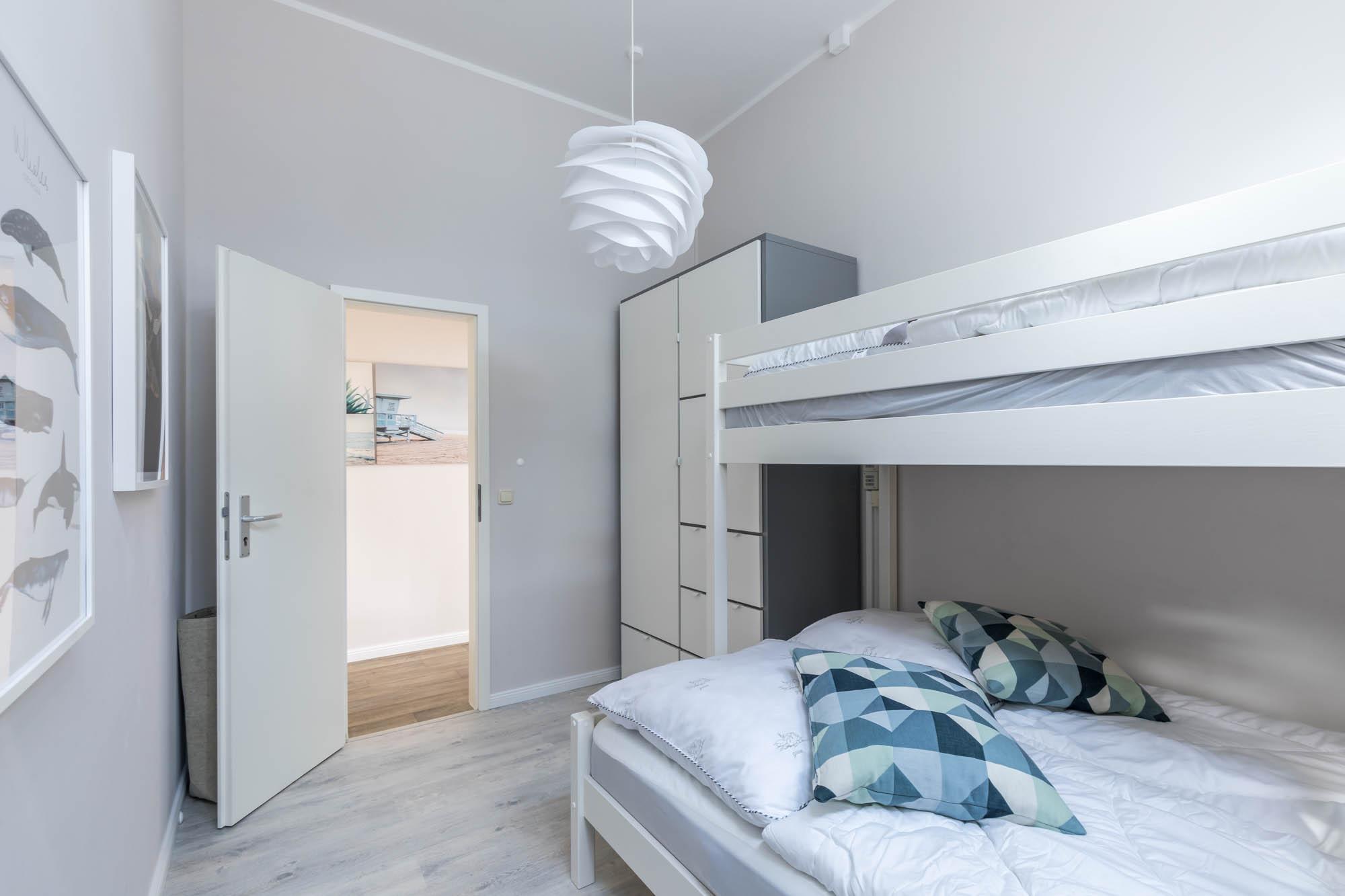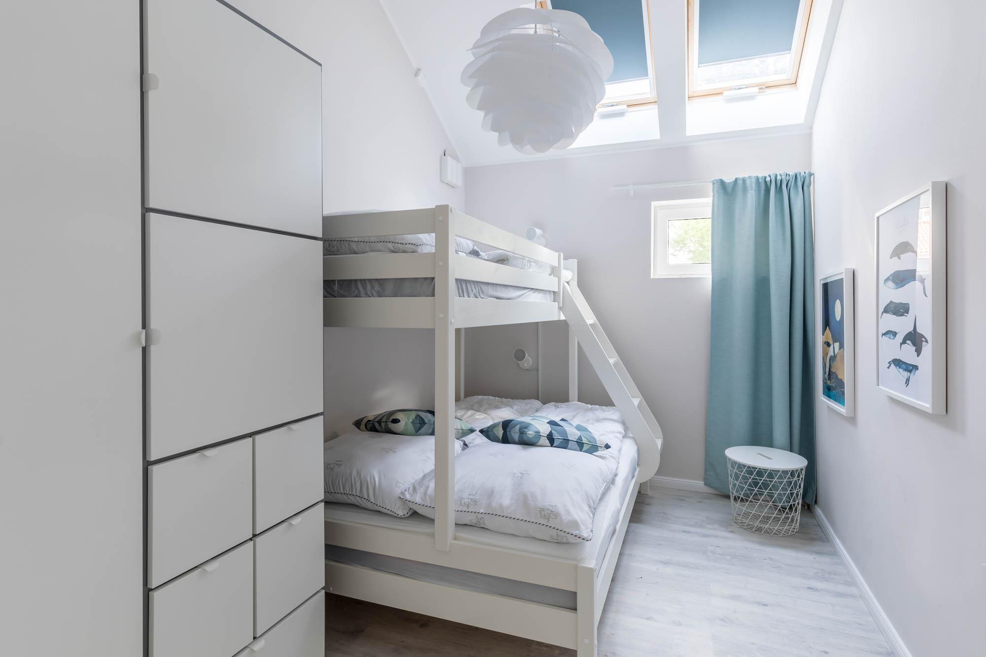 Im Ferienhaus gibt es 3 separate Schlafzimmer: eines mit einem großen Doppelbett, ein Schlafzimmer mit zwei Einzelbetten und ein Schlafzimmer mit einem Etagenbett, wobei das untere Bett für 2 Gäste ausreicht.