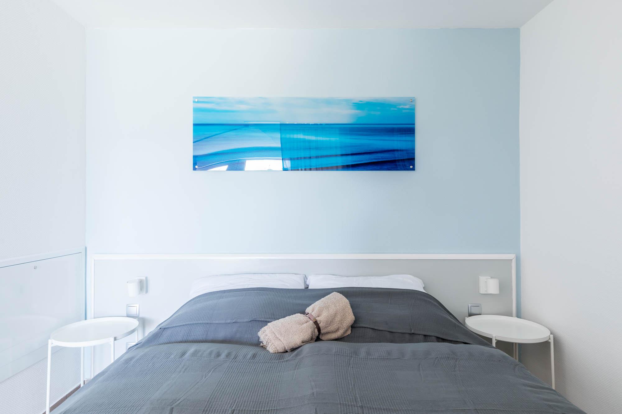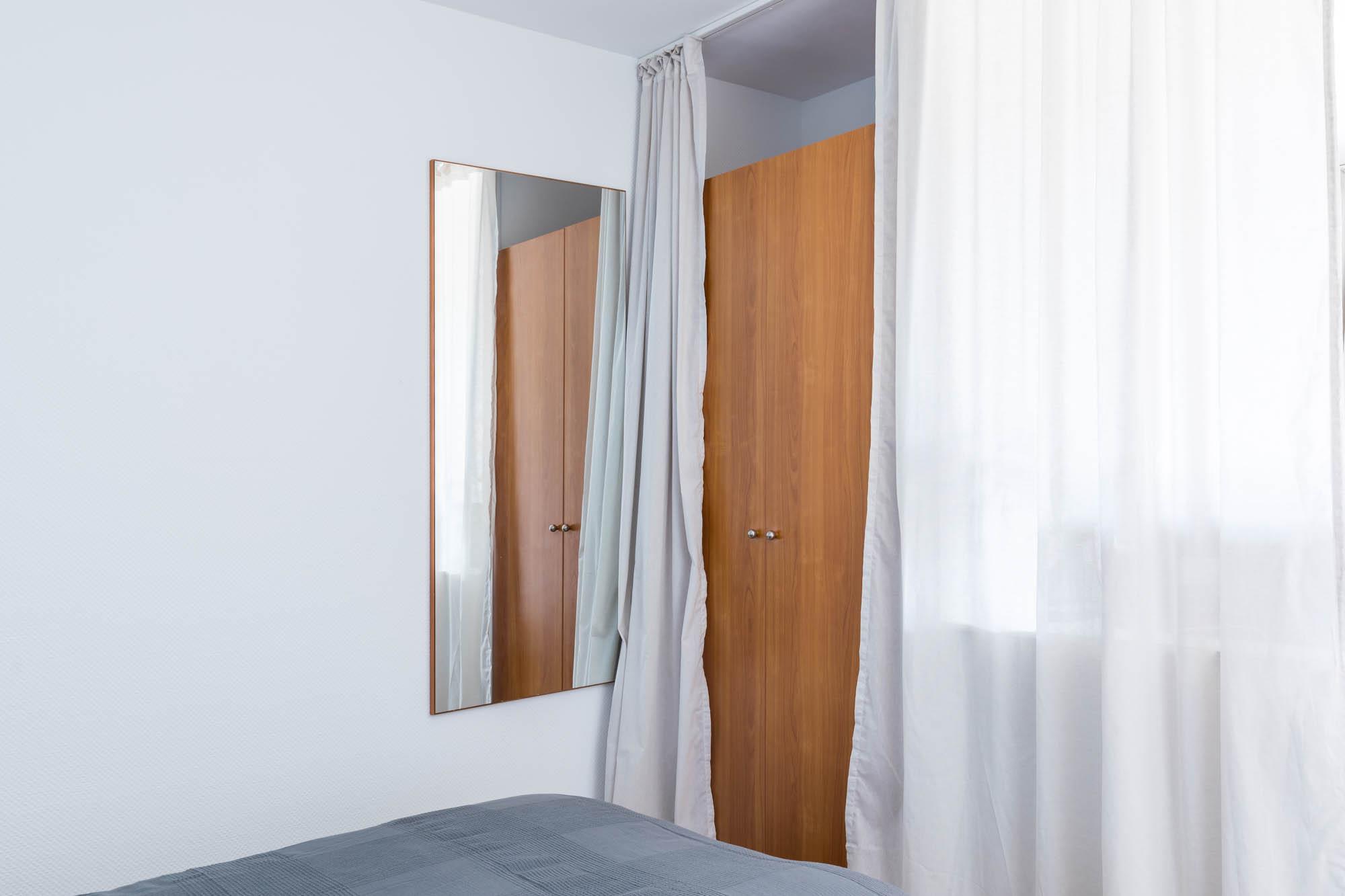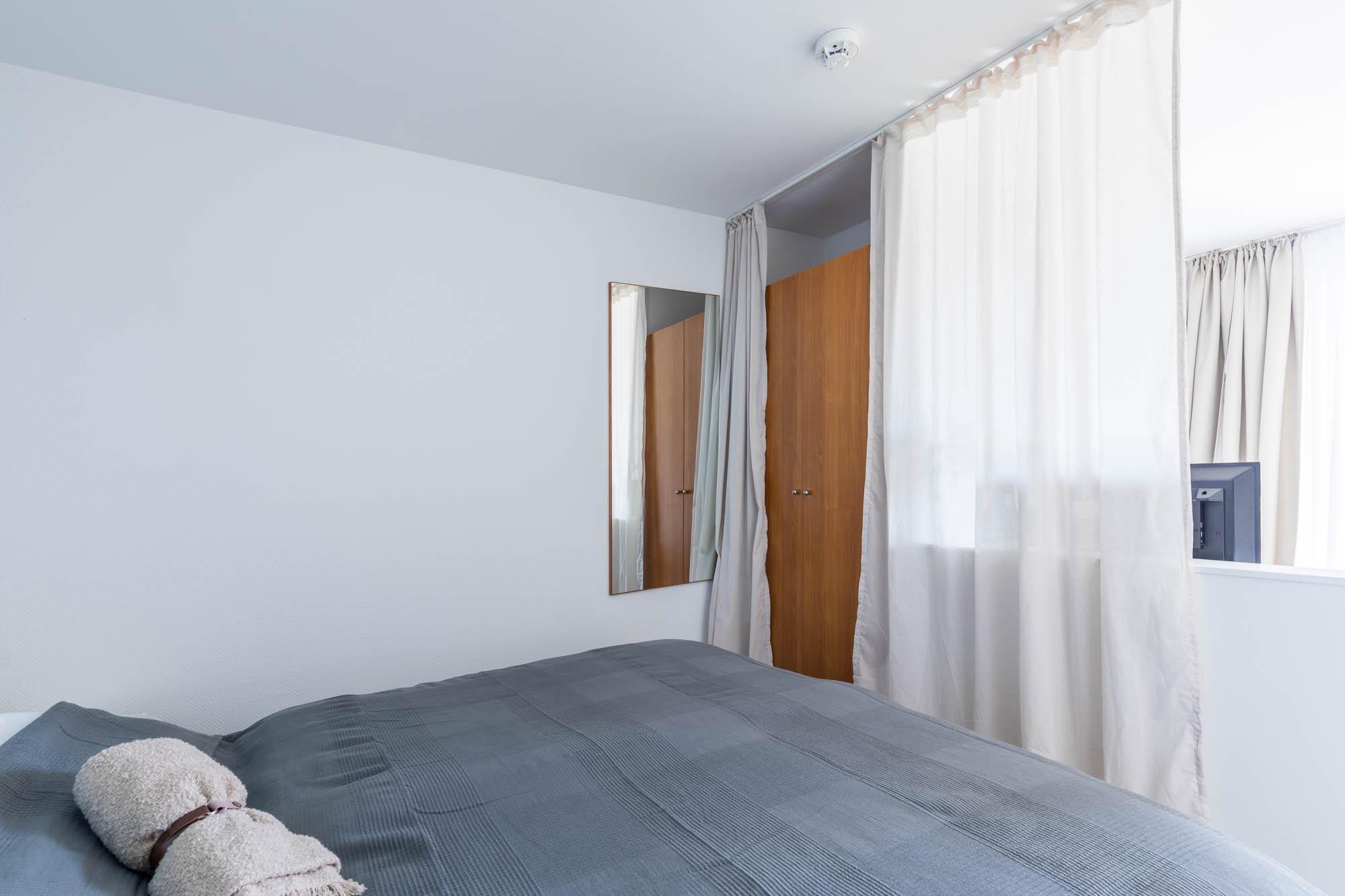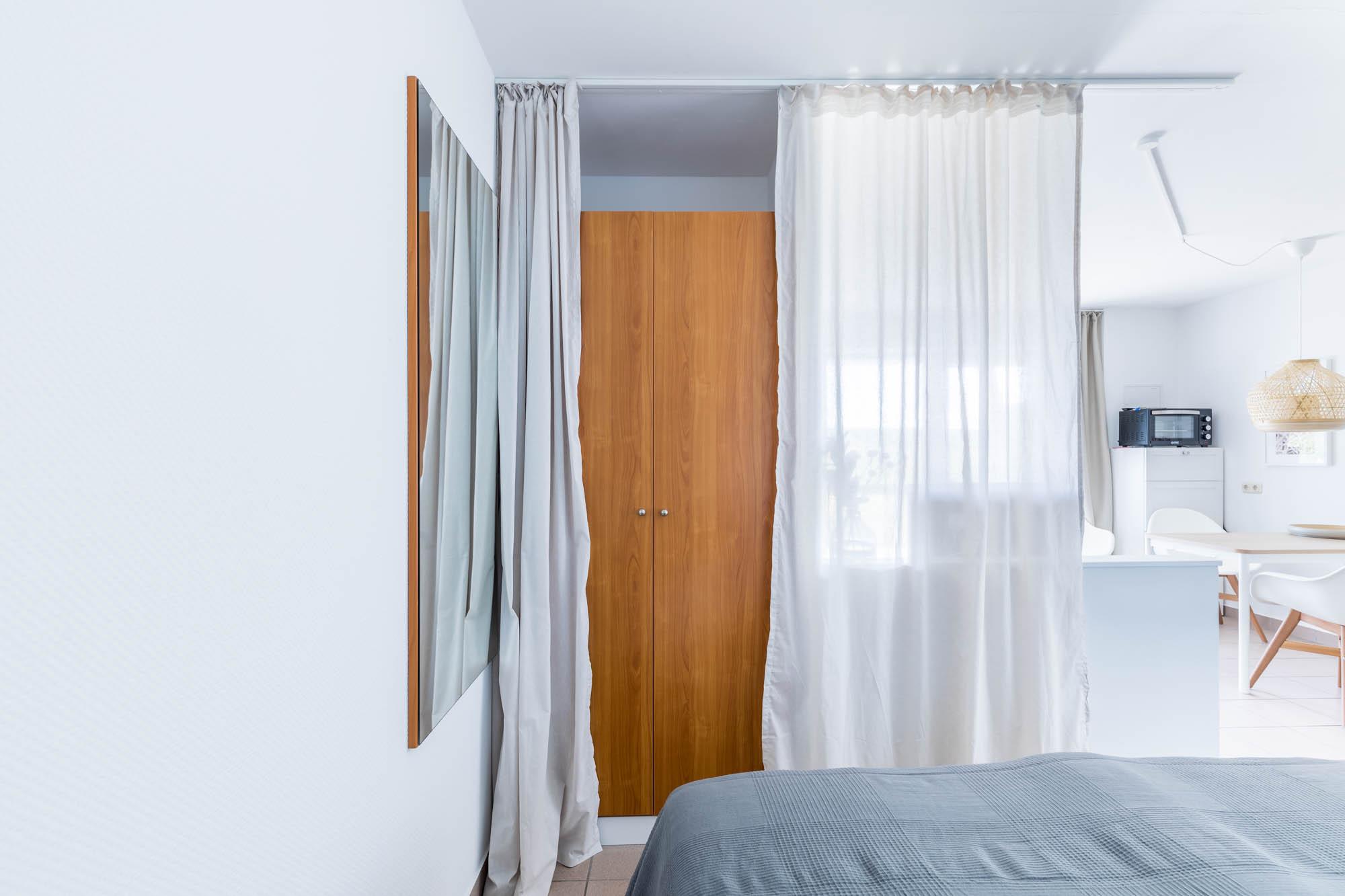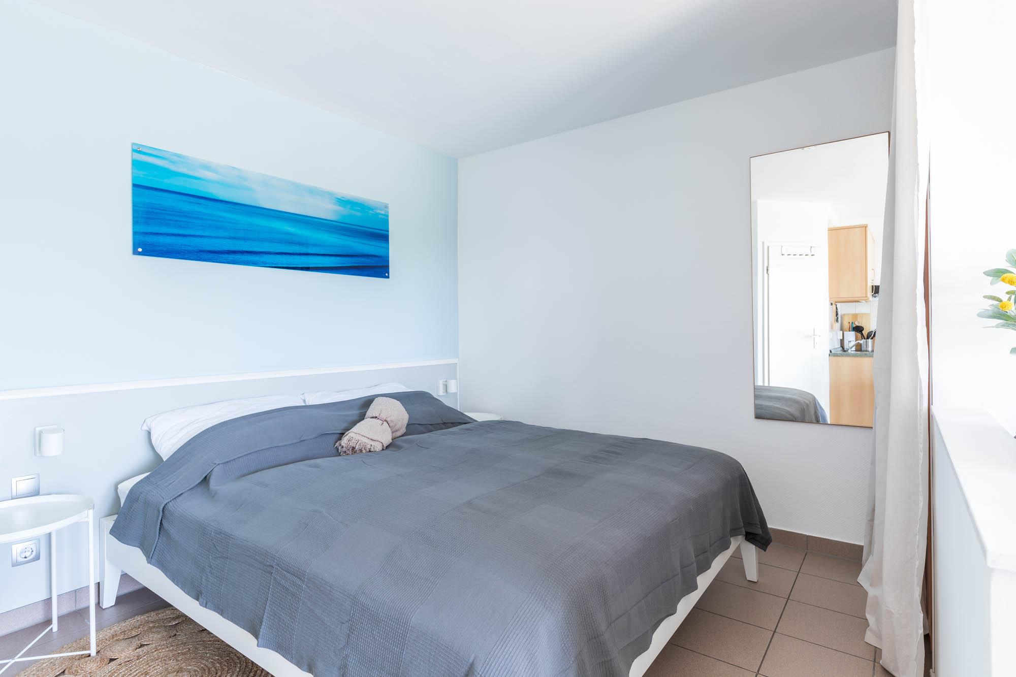 Das große Doppelbett sorgt für erholsamen Schlaf, für die optische Abtrennung zum Wohnbereich sorgt ein schöner Vorhang. Auch ein 2-türiger Kleiderschrank für Ihre Urlaubsgarderobe sowie ein Spiegel haben hier ihren Platz gefunden.