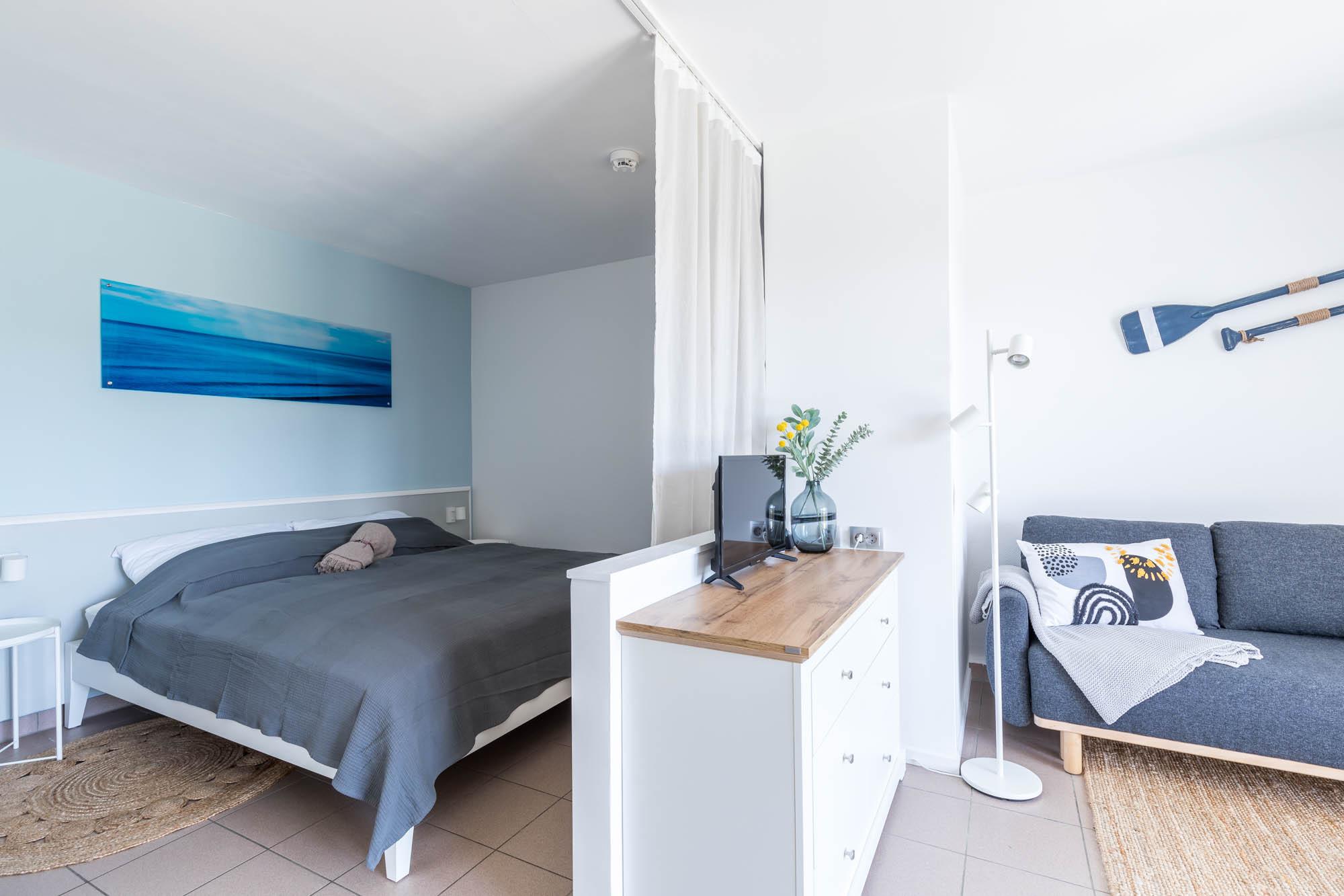 Wohn- und Schlafbereich sind offen miteinander verbunden, eine kleine Singleküche mit angeschlossener Essecke reihen sich hervorragend ein. Die gemütliche Einrichtung sorgt mit ihren modernen Farben für herrliche Urlaubsstimmung. Der Flatscreen-TV befindet sich mittig zwischen dem Wohnbereich und Schlafbereich. Die bequeme Couch bietet bei Bedarf eine dritte Schlafmöglichkeit.