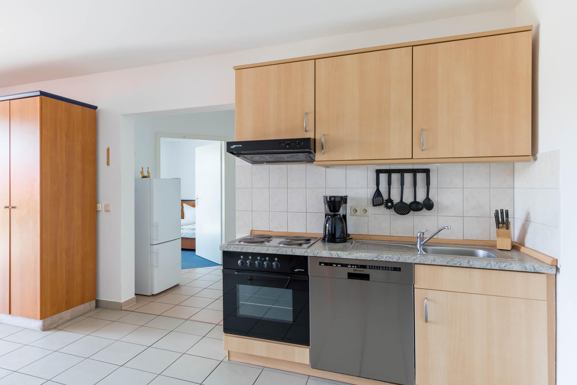 Im Wohnzimmer finden Sie eine modernes Ecksofa. Ein Flatscreen-TV sorgt hier für Ihre Unterhaltung. In der kleinen offenen Wohnküche finden Sie u.a. Herd, Backofen, Geschirrspüler und etwas separat dann eine Kühl-Gefrierkombi. Ihre Mahlzeiten können Sie bequem alle zusammen an der Essecke einnehmen. Das Schlafzimmer bietet neben einem bequemen Doppelbett auch eine zusätzliche Schlafcouch (z.B. für das mitreisende Kind).