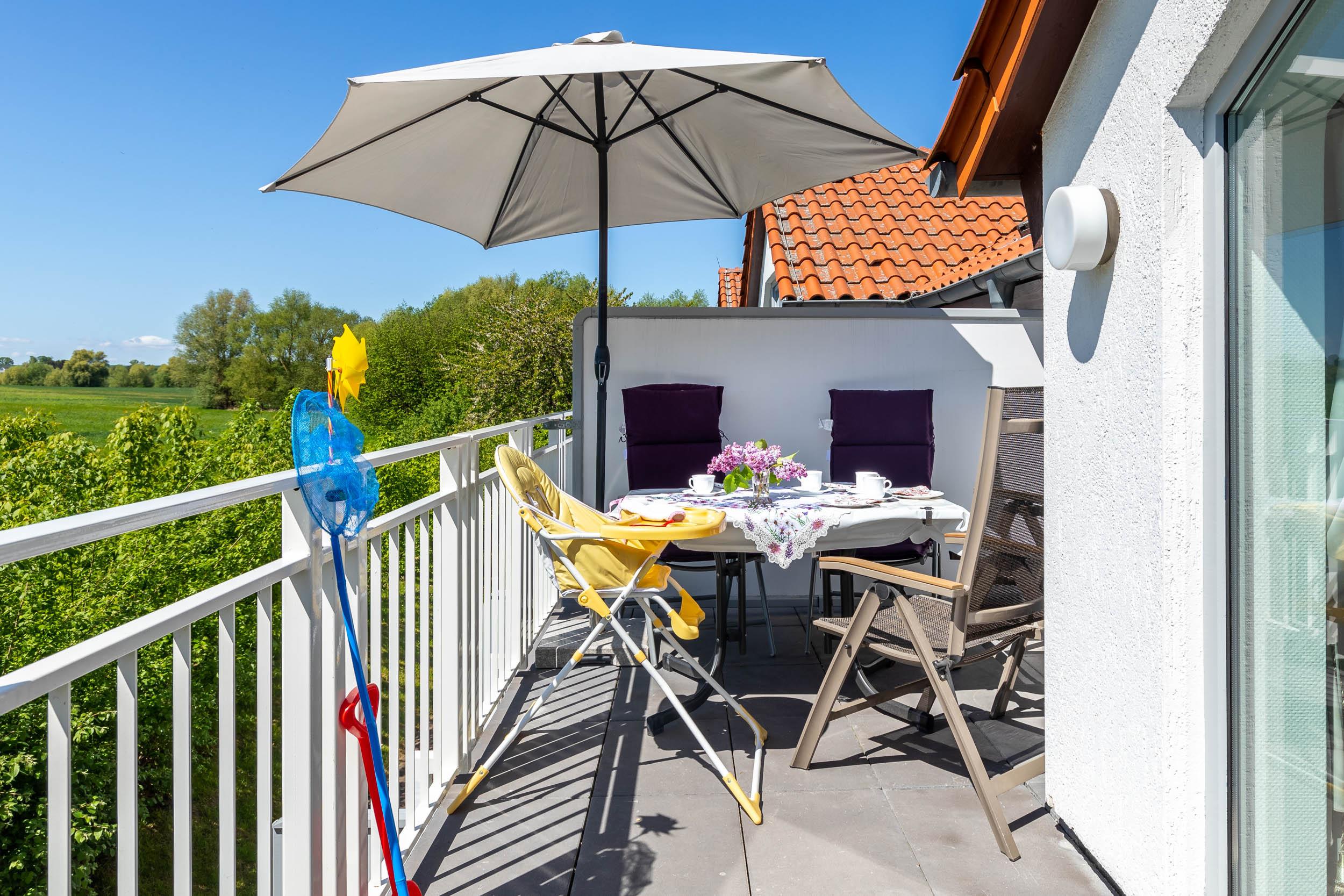 In dieser Nichtraucher-Wohnung stehen für unsere kleinsten Gäste ein Hochstuhl und ein Reisebettchen mit passender Matratze kostenfrei zur Nutzung bereit. Die Wohnung hat einen eigenen Eingang über den Laubengang mit herrlicher Aussicht zur Ostsee.
