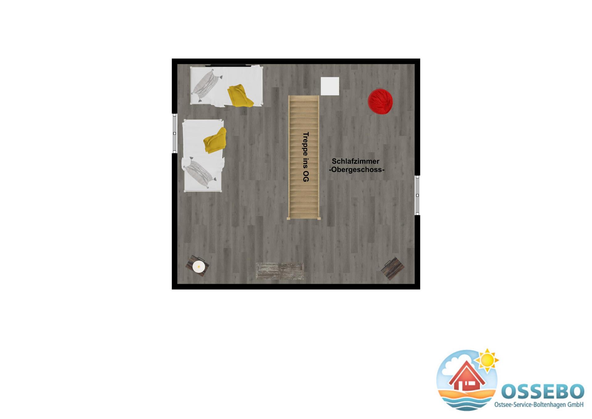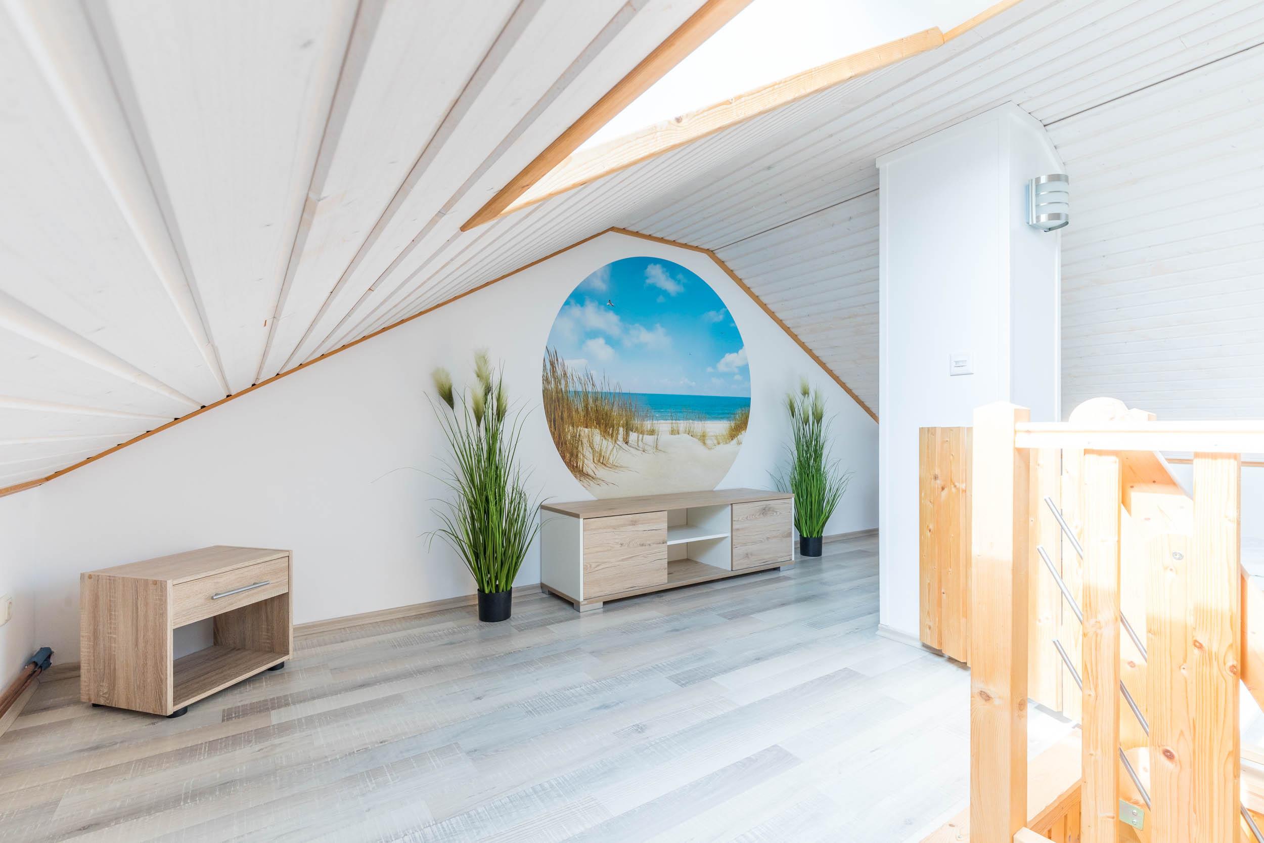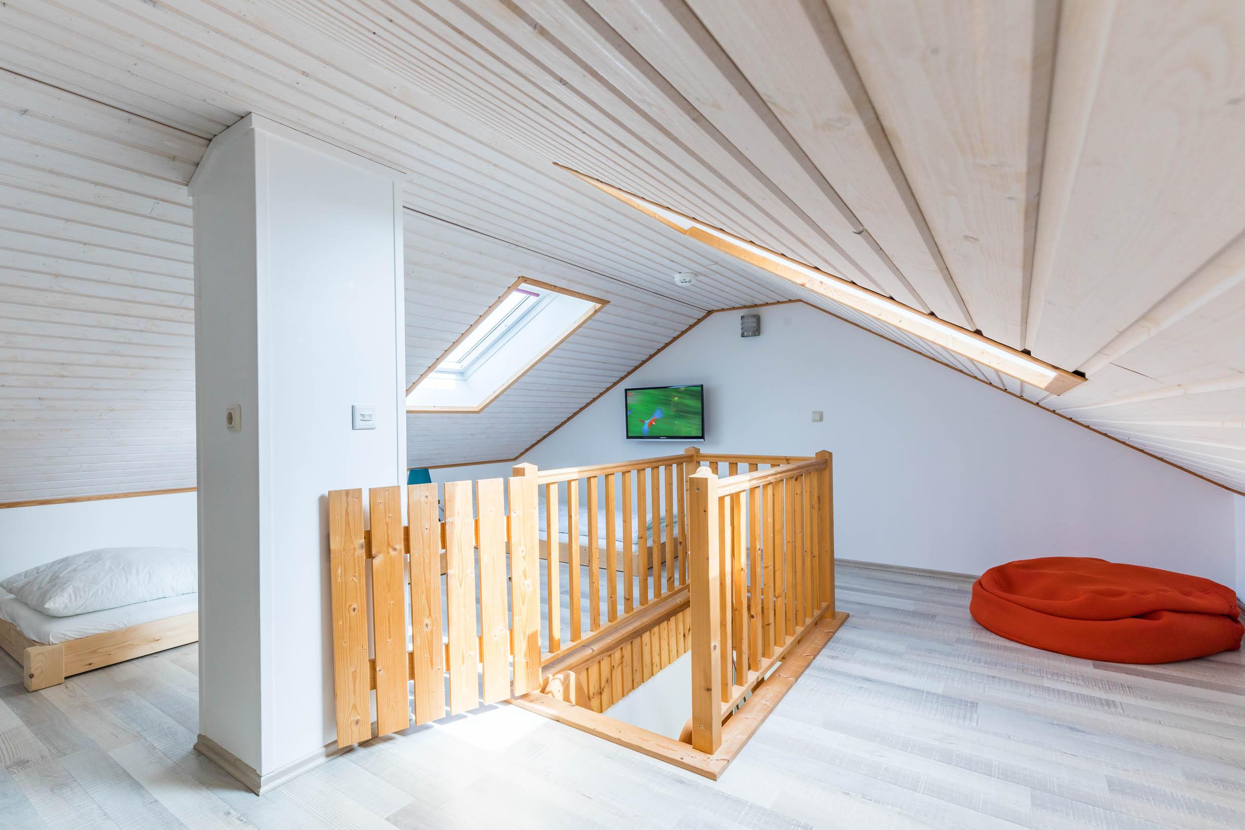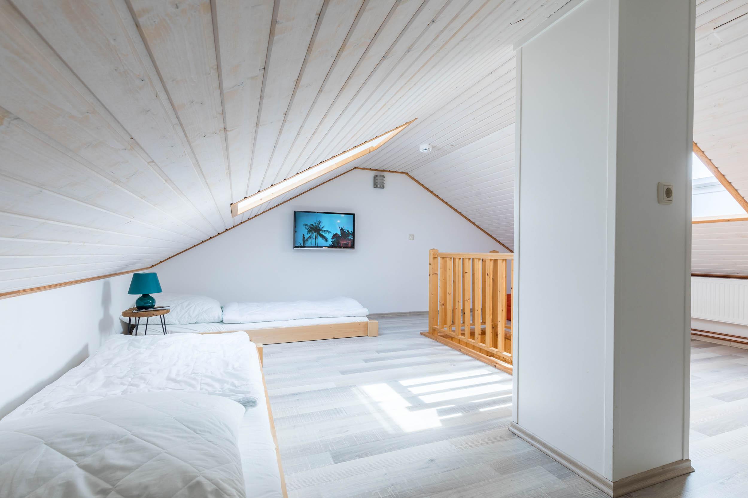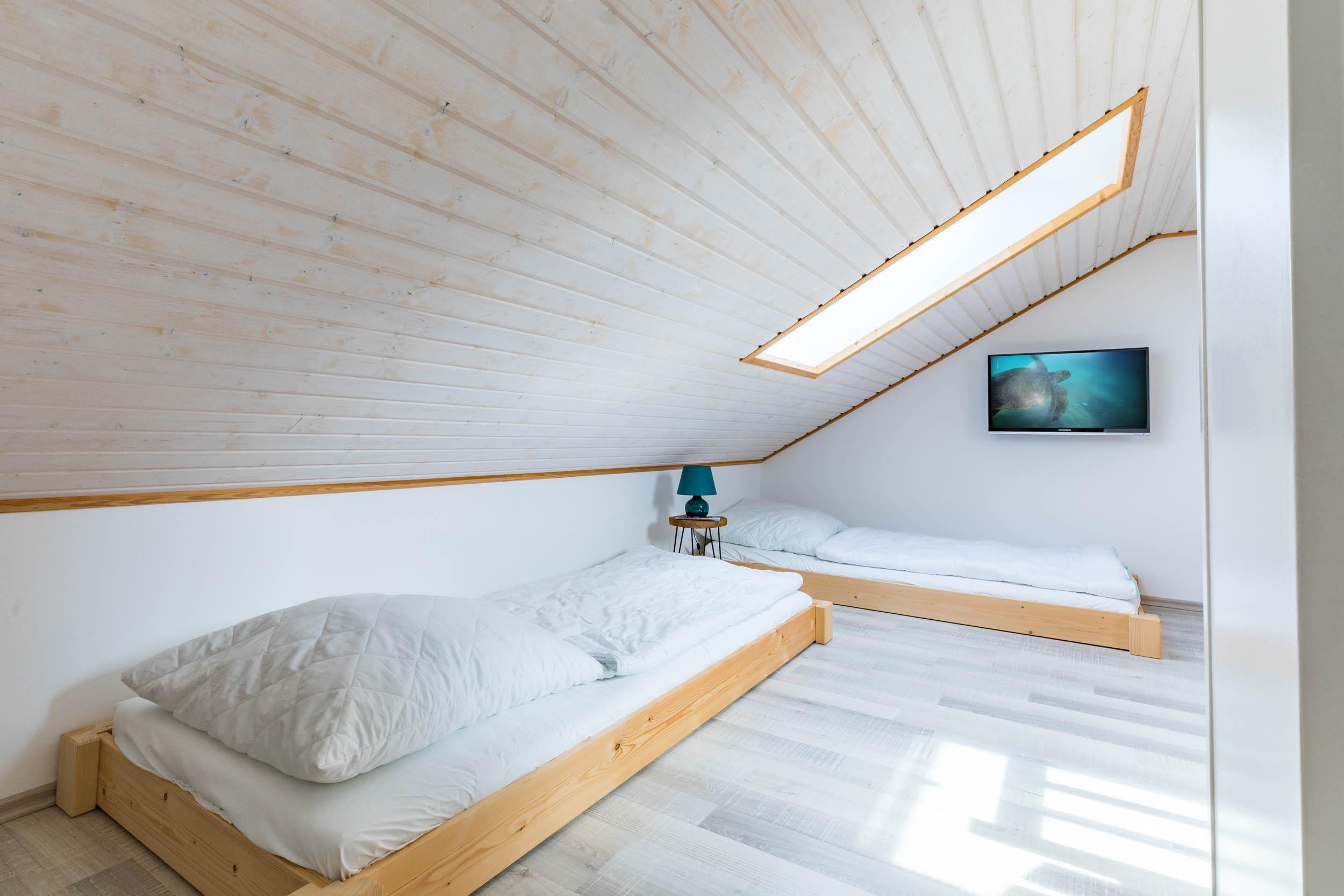 Vom Wohnbereich aus gelangen Sie über eine Raumspartreppe ins offene Dachgeschoss. Dieser Bereich ist eher für größere Kinder geeignet. Hier stehen 2 flache Einzelbetten (je 90x200cm) bereit. Ein eigener Flatscreen-TV an der Wand sorgt auch auf dieser Etage für Unterhaltung.