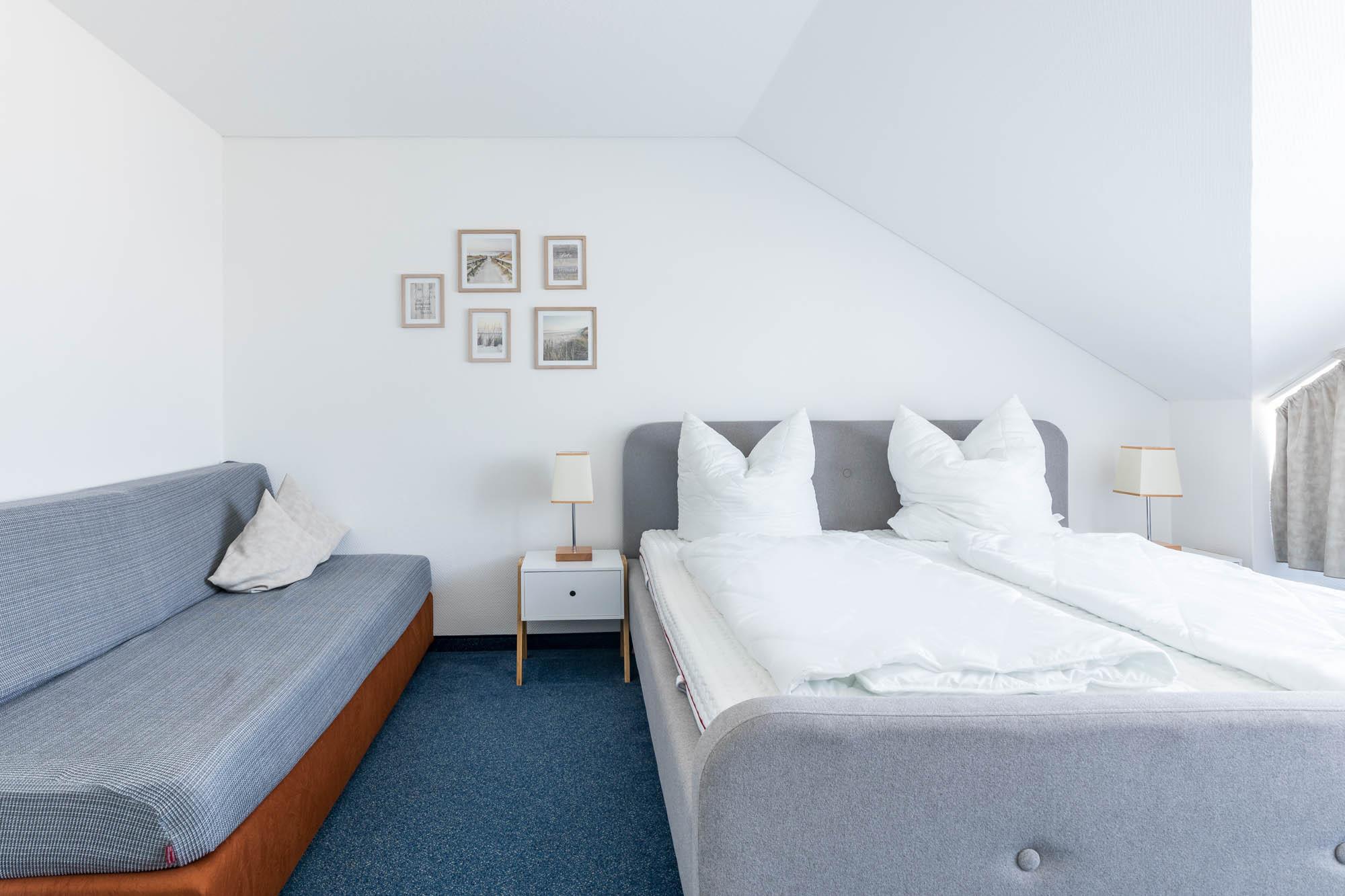 Das Schlafzimmer ist mit einem Doppelbett (180x200cm) und einer Liege (z.B. für eines der mitreisenden Kinder, Liegefläche 90x200cm) ausgestattet. Im Kleiderschrank können Sie gern Ihre Urlaubsgarderobe ablegen.