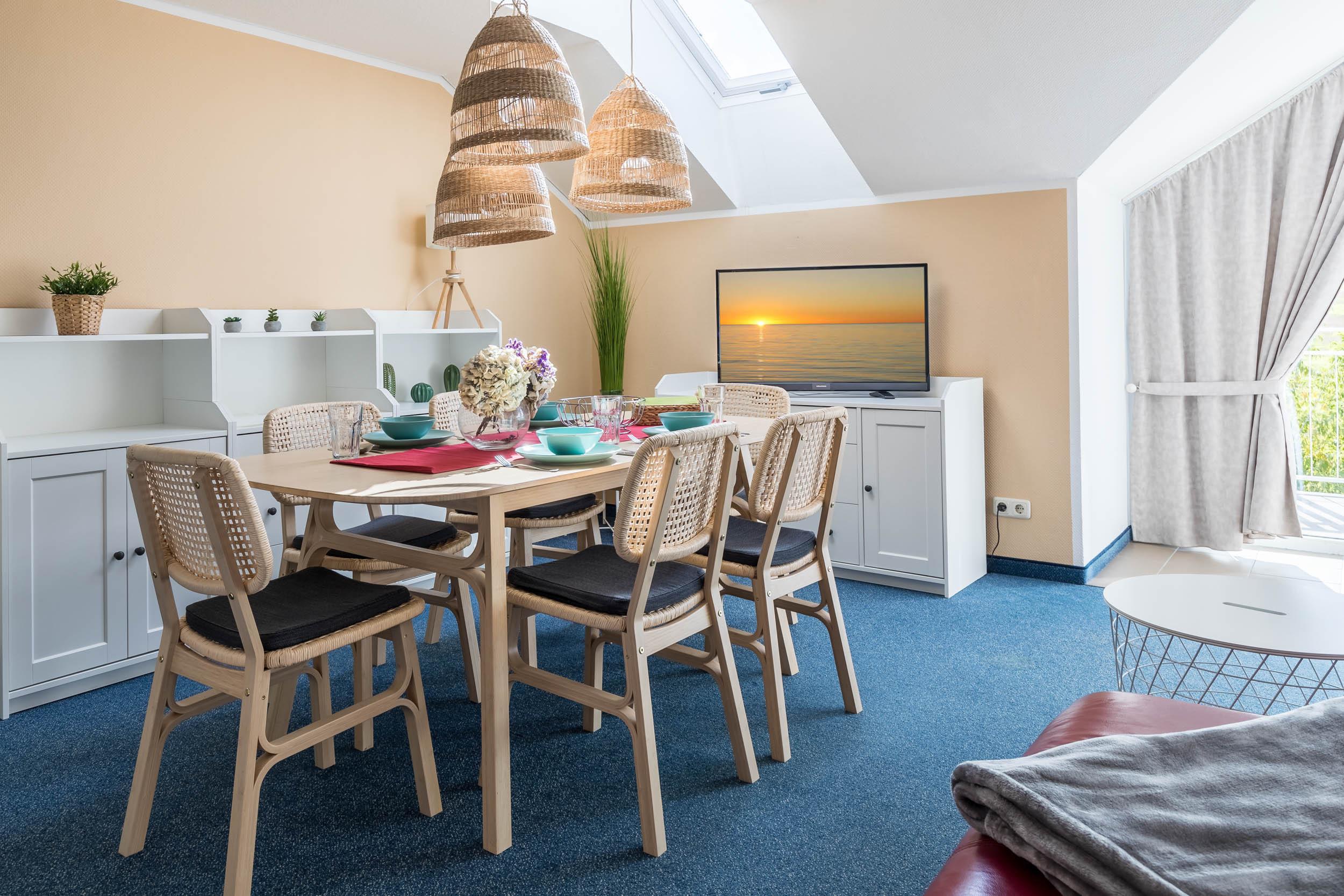 In der 1. Wohnebene finden Sie das Wohnzimmer mit großem Ecksofa, Flatscreen-TV, Essecke und Wohnküche.