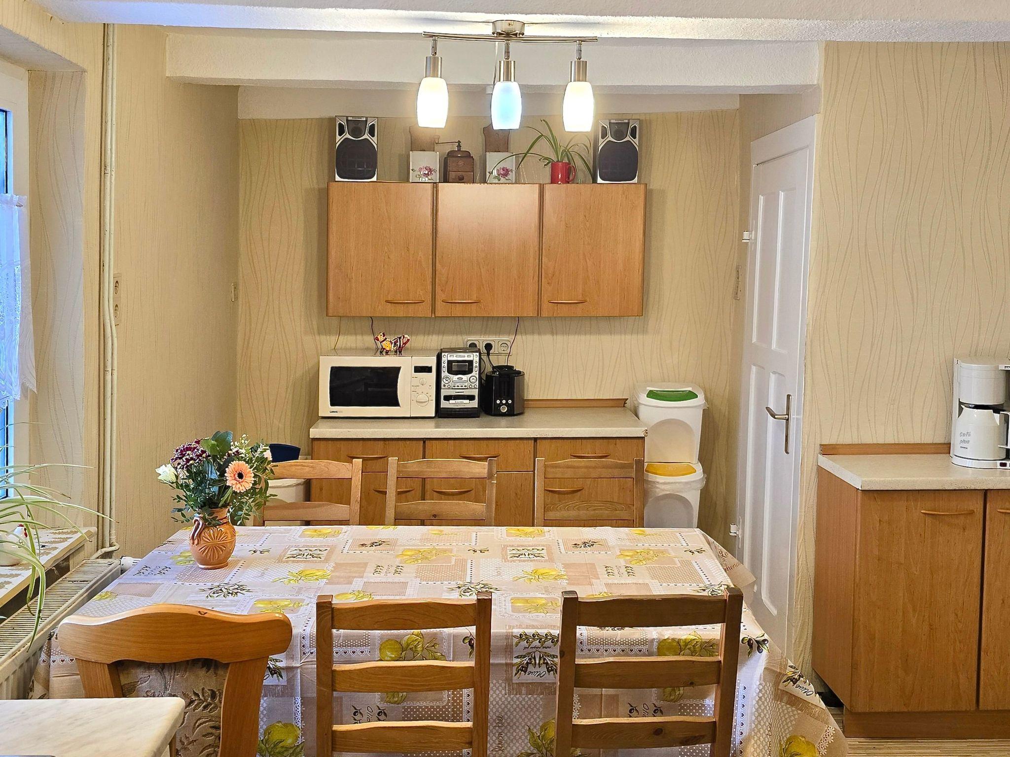 In our holiday home, which is located on the first floor, you can enjoy the amenities of a well-equipped house. A washing machine and tumble dryer are available for your exclusive use, so that you can enjoy all the comforts even during a longer stay. A fully equipped kitchen with ceramic hob, filter coffee machine, dishwasher and kettle makes it easy to prepare meals for the whole group. On cooler days, the fireplace provides cosy warmth and comfort.