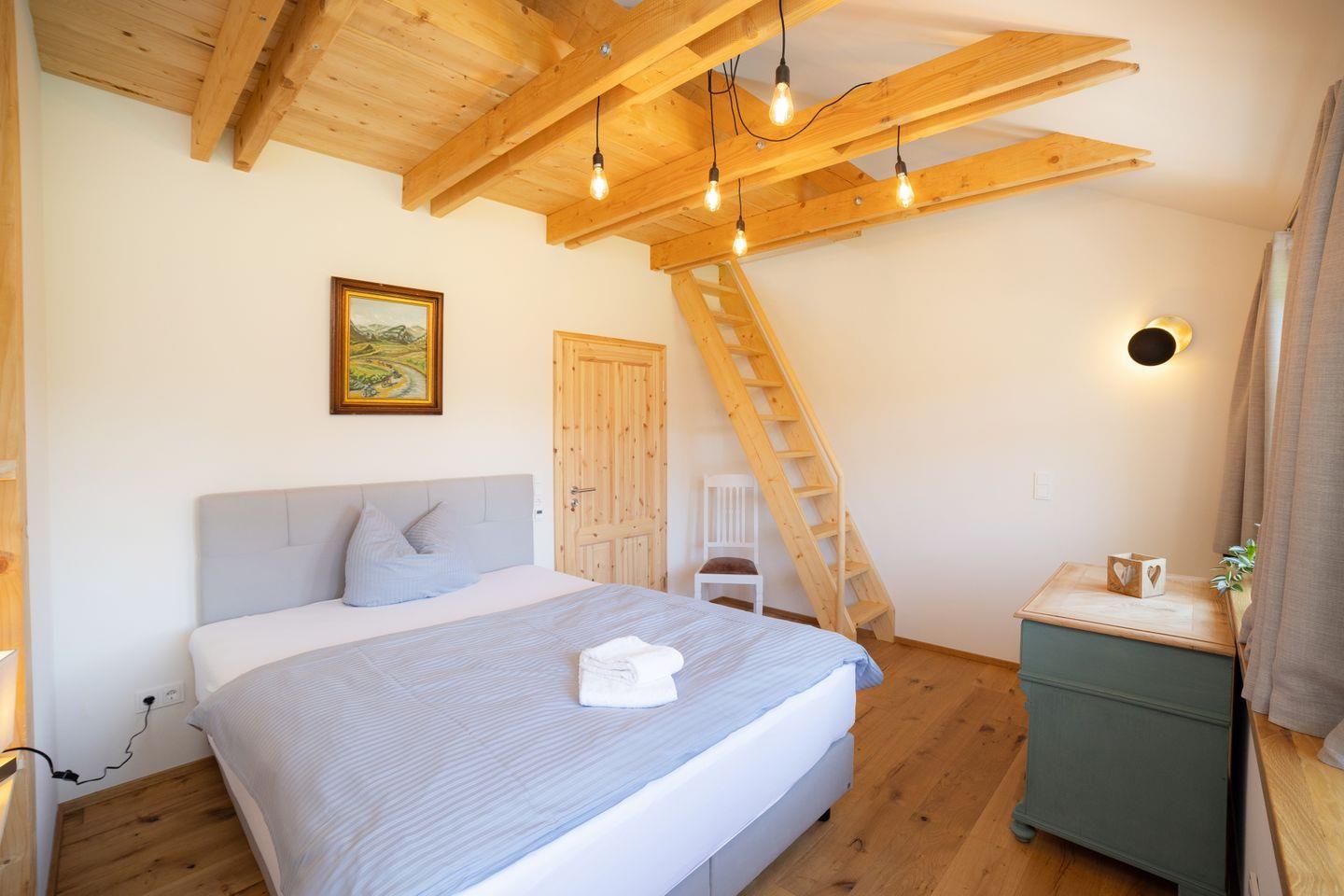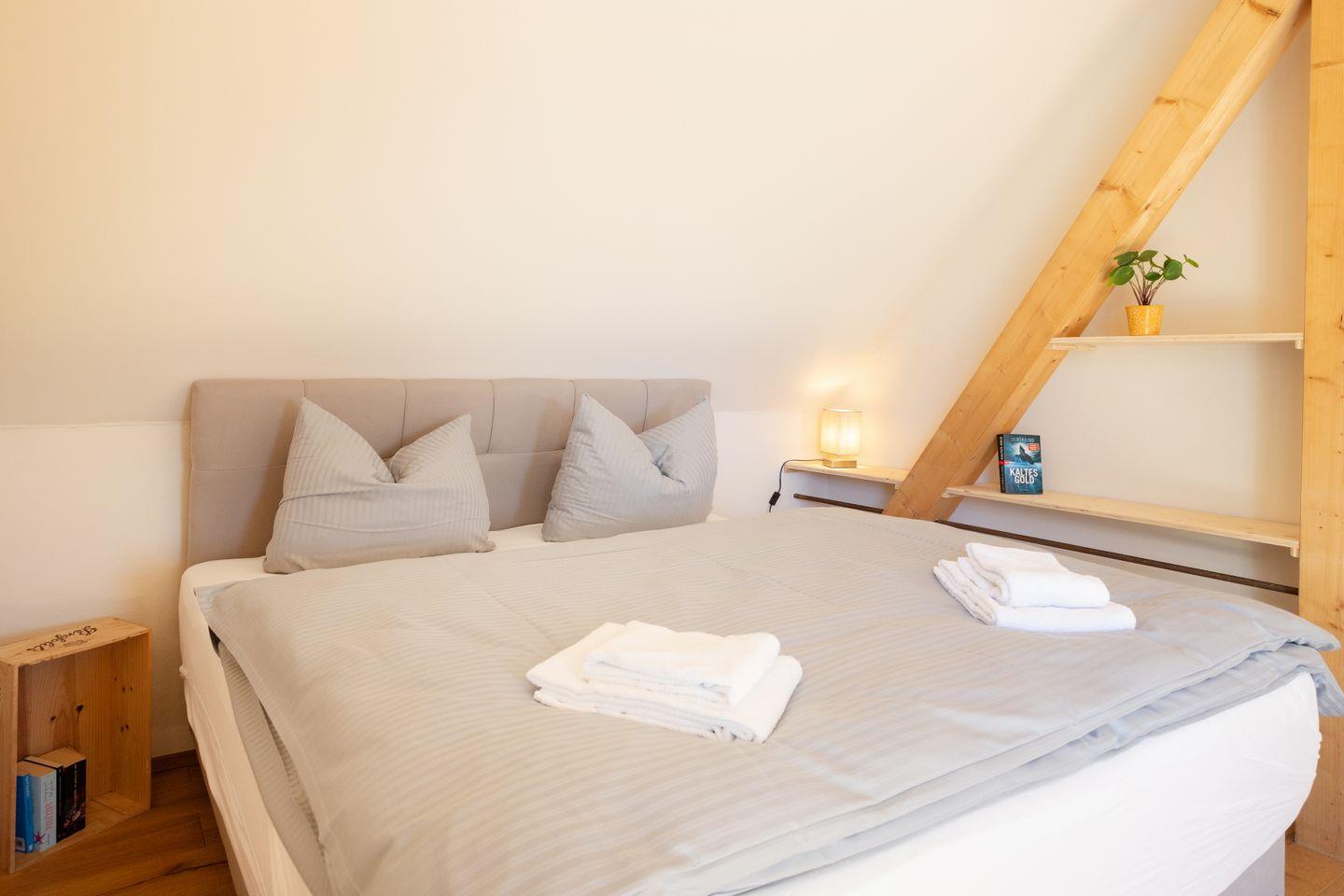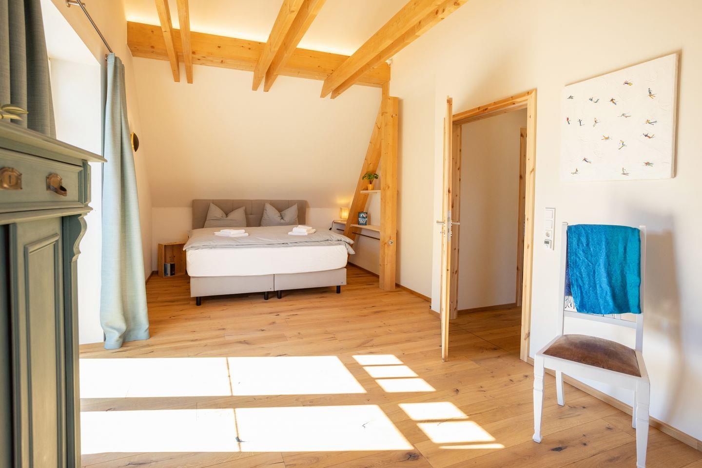 Drinnen erwarten euch 6 Schlafzimmer, ergänzt durch einen offenen Spitzboden mit zwei weiteren Betten. Zwei der Zimmer sind Durchgangszimmer, was besonders für Familien mit Kindern praktisch ist. Bei einer Einzelbelegung haben wir somit Platz für maximal 5 Personen. Dazu zwei stilvolle Bäder (eins mit Dusche, eins mit Dusche und freistehender Wanne), ein großer Wohnbereich mit Sofaecke und Klavier sowie eine moderne Küche mit allem, was ihr braucht. WLAN, Bluetooth-Box, TV und Fußbodenheizung sorgen für Gemütlichkeit – zu jeder Jahreszeit.