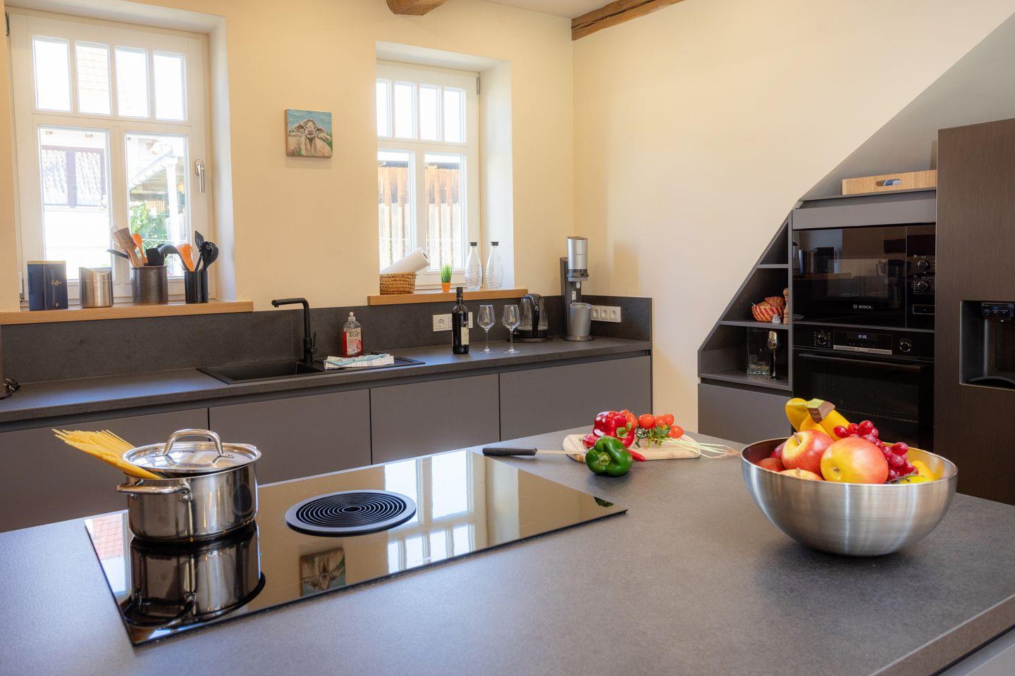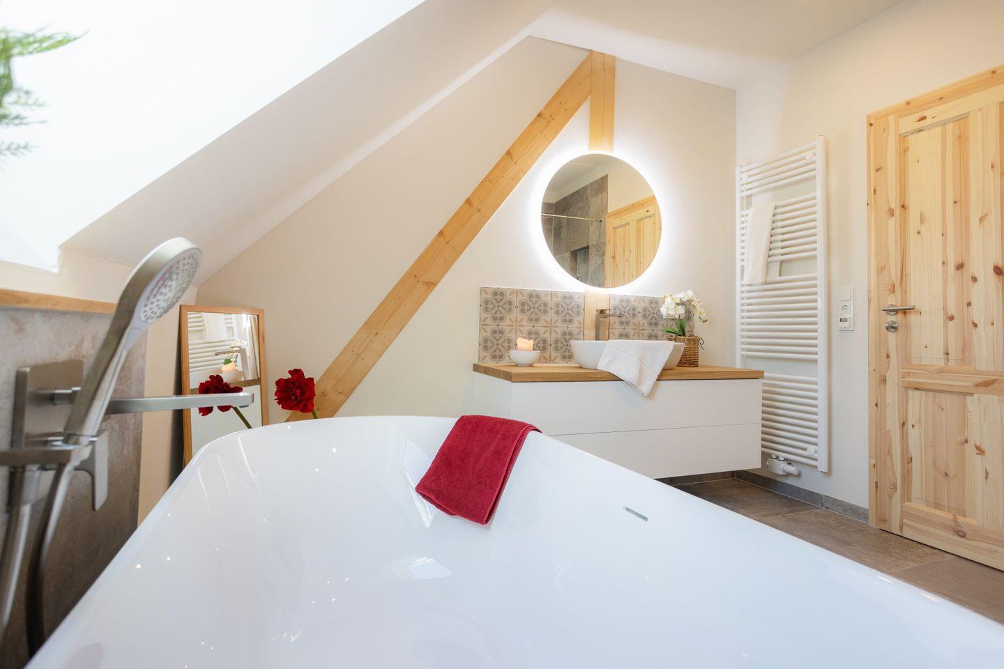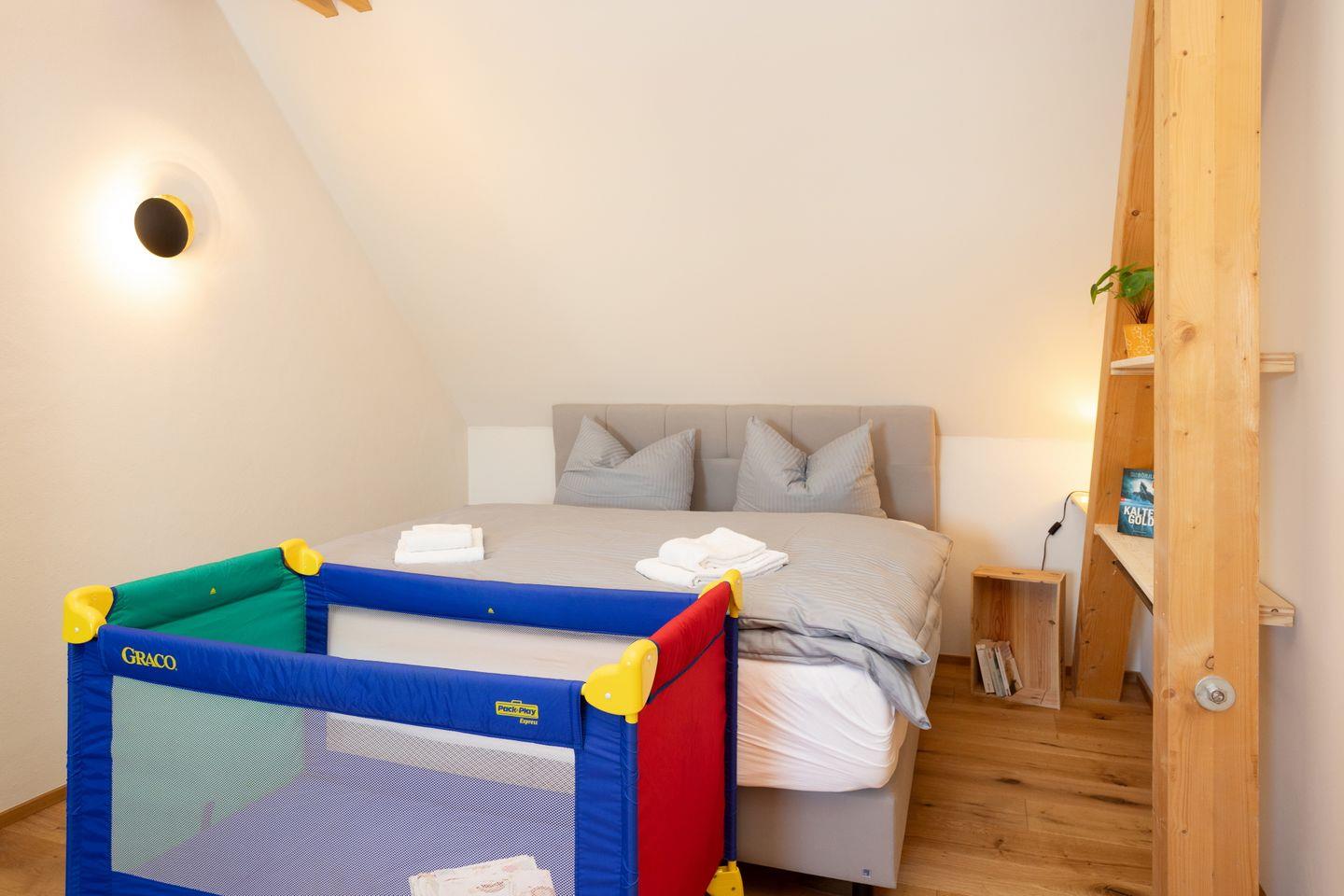 Drinnen erwarten euch 6 Schlafzimmer, ergänzt durch einen offenen Spitzboden mit zwei weiteren Betten. Zwei der Zimmer sind Durchgangszimmer, was besonders für Familien mit Kindern praktisch ist. Bei einer Einzelbelegung haben wir somit Platz für maximal 5 Personen. Dazu zwei stilvolle Bäder (eins mit Dusche, eins mit Dusche und freistehender Wanne), ein großer Wohnbereich mit Sofaecke und Klavier sowie eine moderne Küche mit allem, was ihr braucht. WLAN, Bluetooth-Box, TV und Fußbodenheizung sorgen für Gemütlichkeit – zu jeder Jahreszeit.