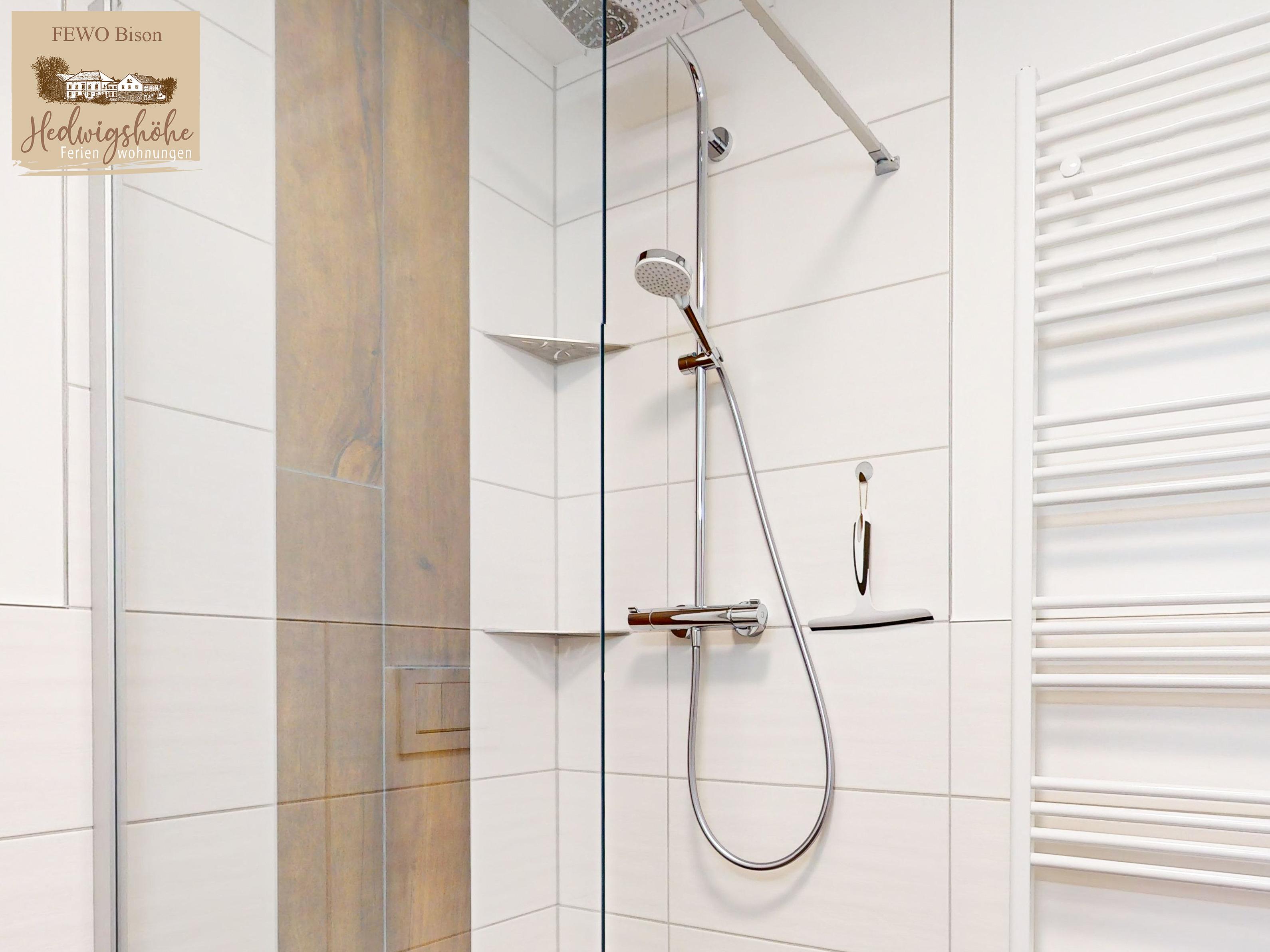 Ausstattung: Bodengleiche Regenwalddusche, Spiegelschrank, Waschtisch und großer Wandheizkörper.