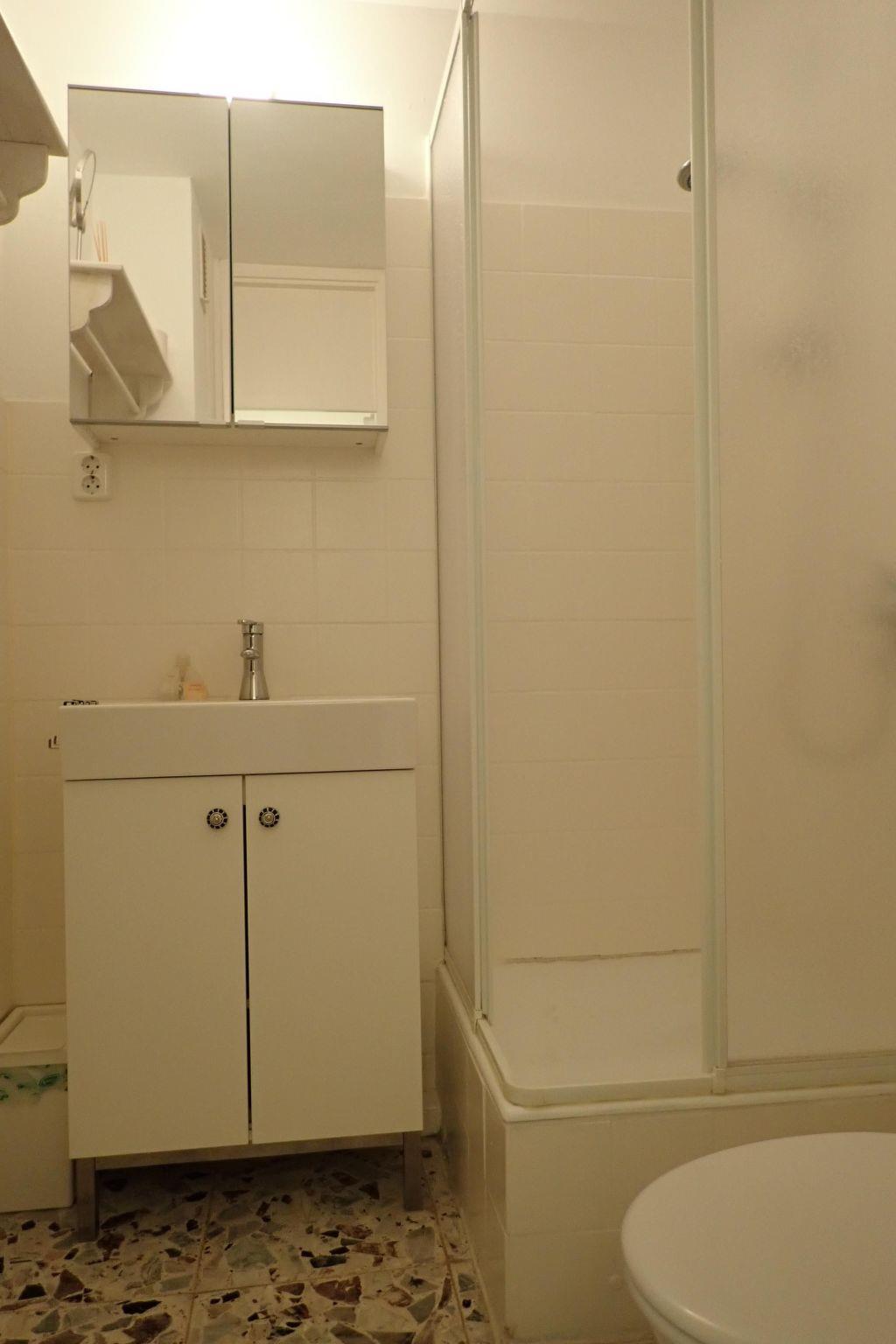 The little studio flooded with daylight is decorated in light colours. It provides 35m2 of space for two people. You do not need to bring much, as the apartment is fully-equipped for convenient self-catering. The studio has a double bed (140 x 200cm) and a wardrobe next to it. The sitting area consists of a sofa and a dining space for two people. The kitchen unit is equipped with a stove, oven, fridge, coffee machine and microwave. The shower room has a washbasin, shower and WC. All the rooms are fitted with under-floor heating under marble tiles.
