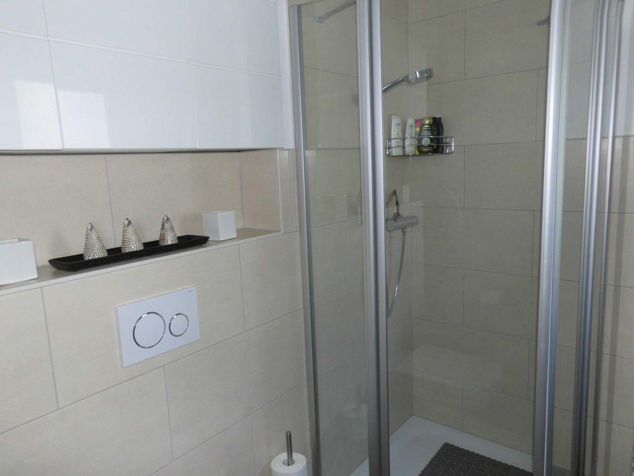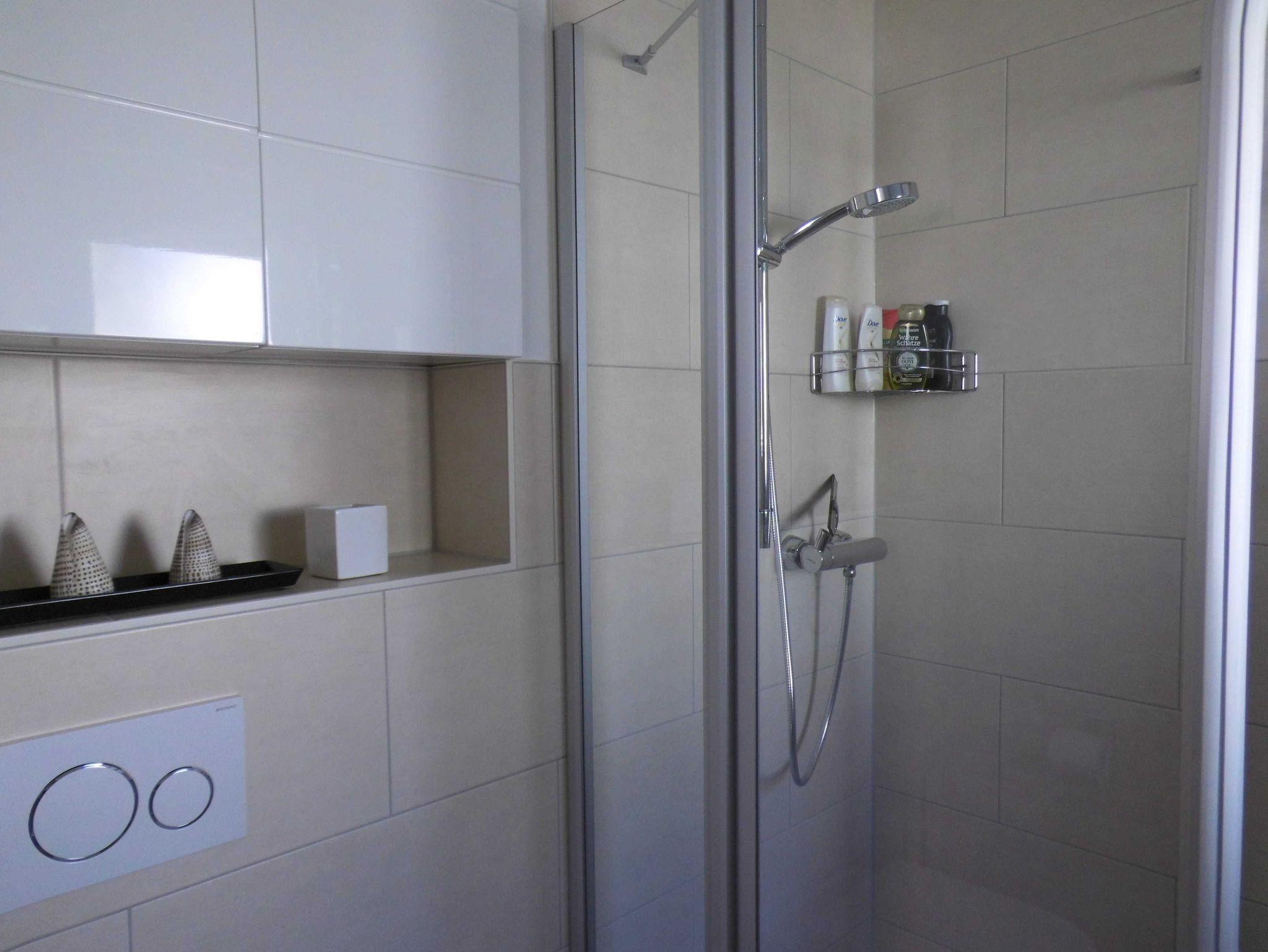 • -Bad mit ebenerdiger Dusche Handtuchtrockenheizkörper, Waschmaschine und Fußbodenheizung