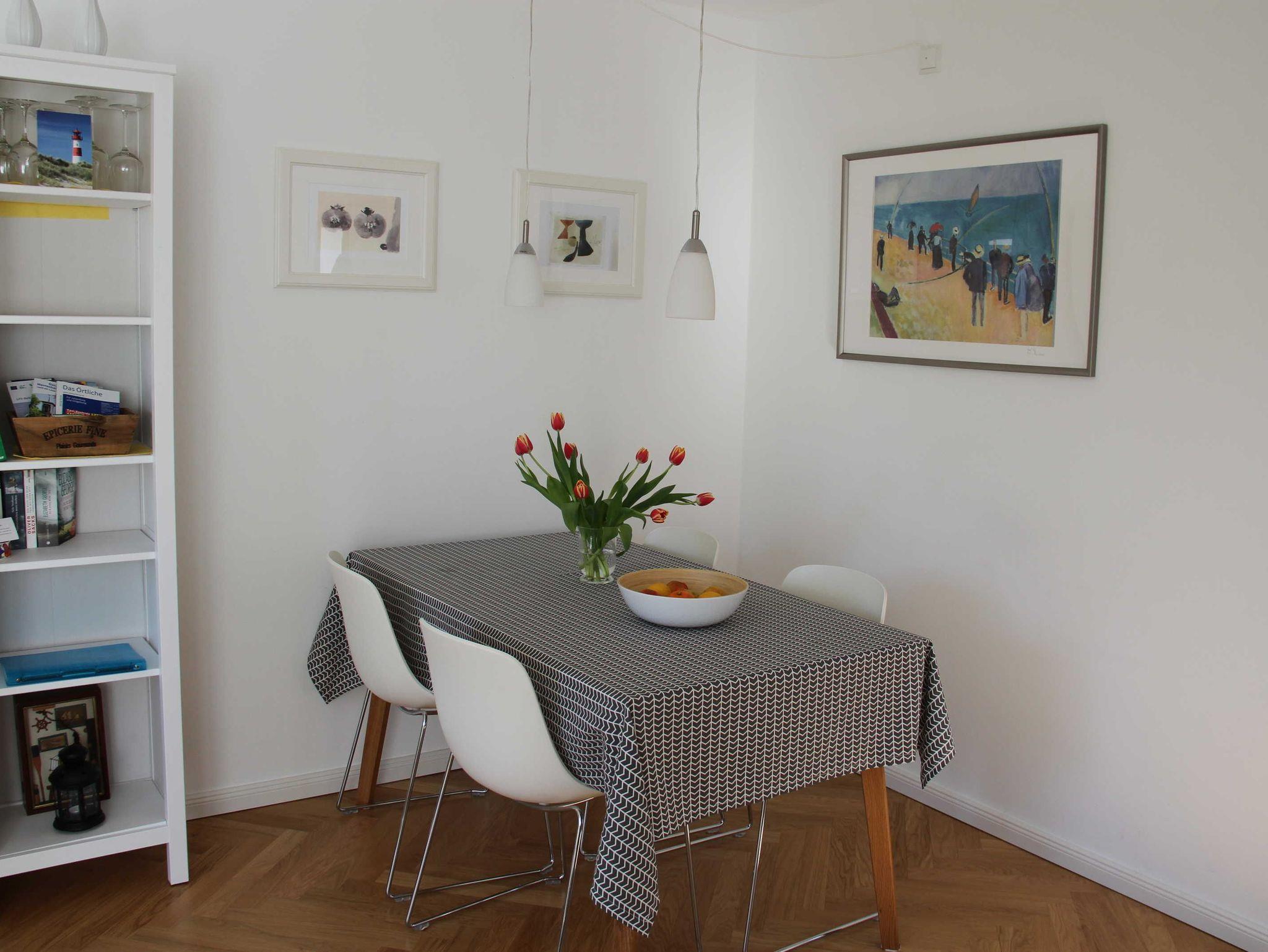 • Gemütlich, modern eingerichtetes Wohnzimmer mit Essecke. TV Flachbildschirm, DVD Player und Radio.