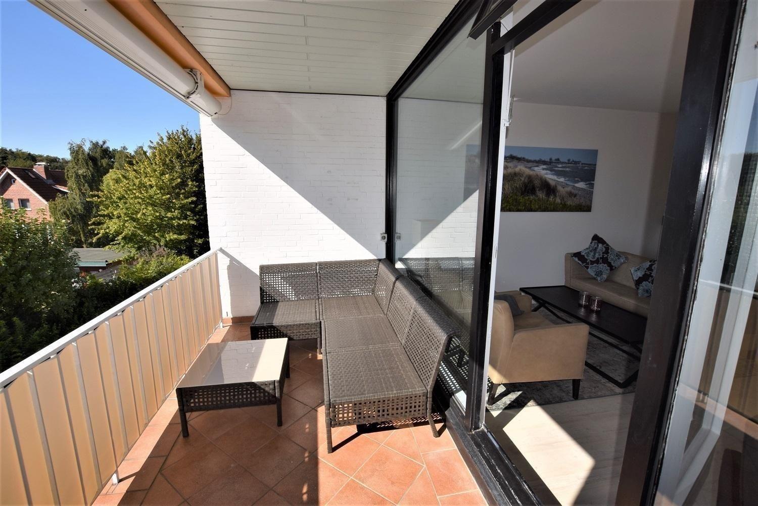 Die Ferienwohnung Annika präsentiert sich mit einem einladenden, großzügigen Außenbereich, der ideal für erholsame Stunden im Freien ist. Der große, überdachte Süd-Balkon ist mit gemütlichen Balkonmöbeln und einer praktischen Markise ausgestattet, sodass entspannte Momente unter freiem Himmel garantiert sind. Von hier aus eröffnet sich ein traumhafter Ausblick, der die Sinne belebt.