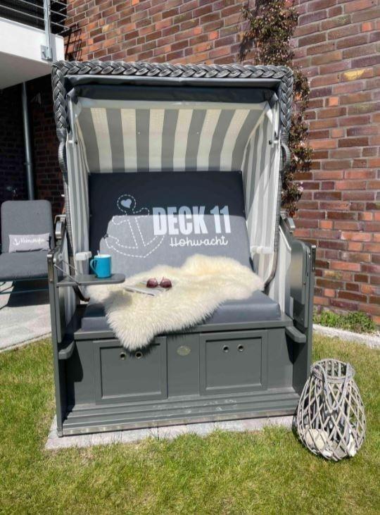 Die Ferienwohnung „DECK 11“ besticht durch ihren großzügigen Außenbereich, der über eine vollständig möblierte Terrasse und einen charmanten Garten verfügt. Ein exklusiver Strandkorb im Garten bietet einen seitlichen Blick auf die Bucht, während der direkte Zugang zum Strand in nur wenigen Metern Entfernung verlockt.